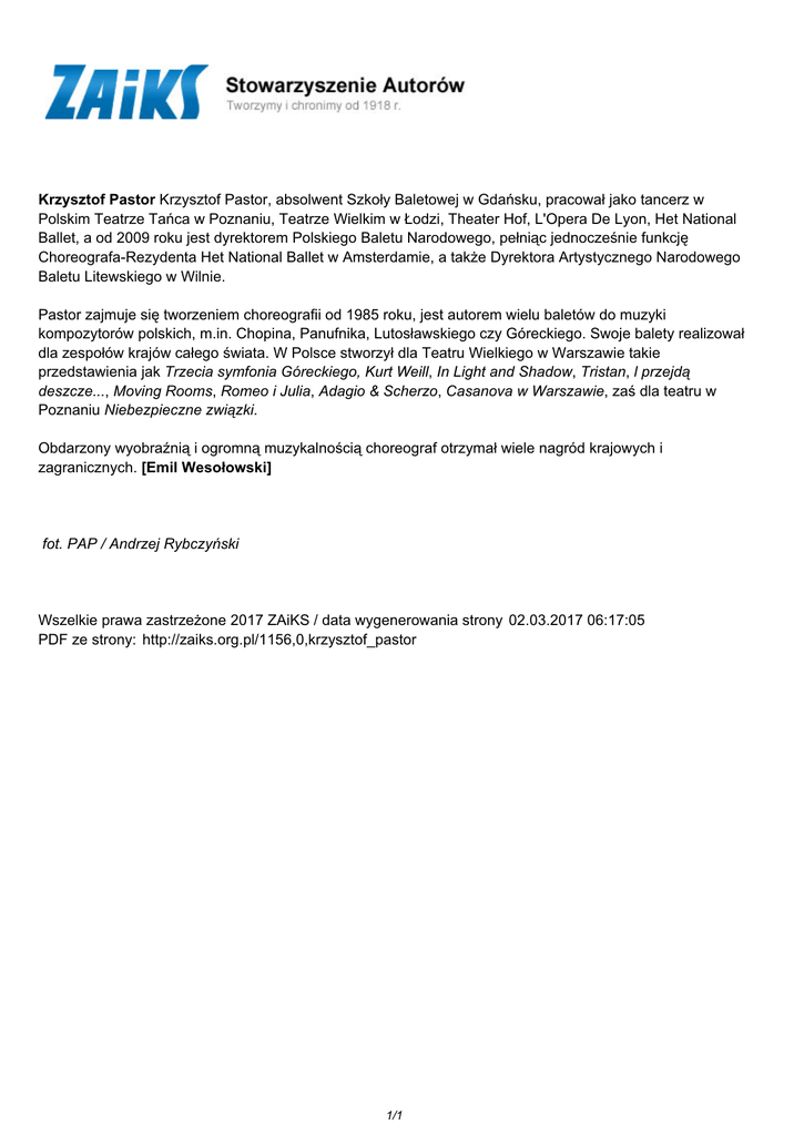 Krzysztof Pastor Krzysztof Pastor, absolwent Szkoły Baletowej w Gdańsku, pracował jako tancerz w Polskim Teatrze Tańca w Poznaniu, Teatrze Wielkim w Łodzi, Theater Hof, L'Opera De Lyon, Het National Ballet, a od 2009 roku jest dyrektorem Polskiego Baletu Narodowego, pełniąc jednocześnie funkcję Choreografa-Rezydenta Het National Ballet w Amsterdamie, a także Dyrektora Artystycznego Narodowego Baletu Litewskiego w Wilnie. Pastor zajmuje się tworzeniem choreografii od 1985 roku, jest autorem wielu baletów do muzyki kompozytorów polskich, m.in. Chopina, Panufnika, Lutosławskiego czy Góreckiego. Swoje balety realizował dla zespołów krajów całego świata. W Polsce stworzył dla Teatru Wielkiego w Warszawie takie przedstawienia jak Trzecia symfonia Góreckiego, Kurt Weill, In Light and Shadow, Tristan, l przejdą deszcze..., Moving Rooms, Romeo i Julia, Adagio & Scherzo, Casanova w Warszawie, zaś dla teatru w Poznaniu Niebezpieczne związki. Obdarzony wyobraźnią i ogromną muzykalnością choreograf otrzymał wiele nagród krajowych i zagranicznych. [Emil Wesołowski] fot. PAP / Andrzej Rybczyński Wszelkie prawa zastrzeżone 2017 ZAiKS / data wygenerowania strony 02.03.2017 06:17:05 PDF ze strony: http://zaiks.org.pl/1156,0,krzysztof_pastor 1/1