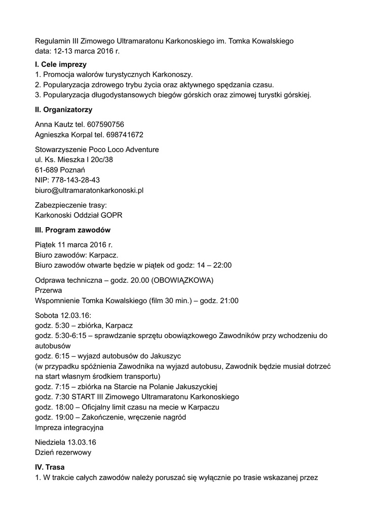 Regulamin III Zimowego Ultramaratonu Karkonoskiego im. Tomka Kowalskiego data: 12-13 marca 2016 r. I. Cele imprezy 1. Promocja walorów turystycznych Karkonoszy. 2. Popularyzacja zdrowego trybu życia oraz aktywnego spędzania czasu. 3. Popularyzacja długodystansowych biegów górskich oraz zimowej turystki górskiej. II. Organizatorzy Anna Kautz tel. 607590756 Agnieszka Korpal tel. 698741672 Stowarzyszenie Poco Loco Adventure ul. Ks. Mieszka I 20c/38 61-689 Poznań NIP: 778-143-28-43 [email protected] Zabezpieczenie trasy: Karkonoski Oddział GOPR III. Program zawodów Piątek 11 marca 2016 r. Biuro zawodów: Karpacz. Biuro zawodów otwarte będzie w piątek od godz: 14 – 22:00 Odprawa techniczna – godz. 20.00 (OBOWIĄZKOWA) Przerwa Wspomnienie Tomka Kowalskiego (film 30 min.) – godz. 21:00 Sobota 12.03.16: godz. 5:30 – zbiórka, Karpacz godz. 5:30-6:15 – sprawdzanie sprzętu obowiązkowego Zawodników przy wchodzeniu do autobusów godz. 6:15 – wyjazd autobusów do Jakuszyc (w przypadku spóźnienia Zawodnika na wyjazd autobusu, Zawodnik będzie musiał dotrzeć na start własnym środkiem transportu) godz. 7:15 – zbiórka na Starcie na Polanie Jakuszyckiej godz. 7:30 START III Zimowego Ultramaratonu Karkonoskiego godz. 18:00 – Oficjalny limit czasu na mecie w Karpaczu godz. 19:00 – Zakończenie, wręczenie nagród Impreza integracyjna Niedziela 13.03.16 Dzień rezerwowy IV. Trasa 1. W trakcie całych zawodów należy poruszać się wyłącznie po trasie wskazanej przez Organizatora. 2. Trasa prowadzi szlakami turystycznymi Karkonoszy. Wytyczona zostanie za pomocą taśm koloru żółtego na całym swoim przebiegu, ze szczególnym uwzględnieniem rozwidleń czy miejsc zmiany szlaku (zły kierunek oznaczony zostanie taśmą czerwoną). 3. W niewielkiej części szlak przebiega po drogach publicznych. Zawodnicy mają w takich sytuacjach obowiązek przestrzegania zasad ruchu drogowego. W przypadku łamania tych zasad wobec zawodników będą stosowane kary czasowe. 4. Start: Polana Jakuszycka -> zielony szlak z obejściem -> Hala Szrenicka -> Śnieżne Kotły -> Przełęcz Karkonoska -> Schronisko Odrodzenie -> czerwony szlak graniowy -> Schronisko Dom Śląski -> Śnieżka -> czerwony szlak-> Czarny Grzbiet -> Jelenka -> Sowia Przełęcz -> Kowarski Grzbiet (czerwony szlak) ->Przełęcz Okraj -> szlak zielony, potem żółty przez Jedlickie Kaskady ->Jedlinki -> szlak żółty -> Budniki -> Szeroki Most -> Wilcza Poręba -> stok narciarski “Kolorowa”-> Meta: Deptak w Karpaczu 5. Dystans – około 53 km 6. Przewyższenia: łączna suma podbiegów około 1800m; łączna suma zbiegów: około 2000m 7. Na trasie zlokalizowanie są cztery punkty odżywcze (herbata, woda, izotoniki, owoce, słodycze): w Schronisku na Hali Szrenickiej, w Schronisku Odrodzenie, w Schronisku Śląski Dom (także ciepły posiłek) oraz na Przełęczy Okraj. Na Mecie na Zawodników czekać będzie kolejny ciepły posiłek. 8. Zakazane jest niszczenie lub zasłanianie oznaczeń szlaków turystycznych i oznaczeń organizatora lub ich przestawianie, które mogą wprowadzić w błąd co do przebiegu trasy zawodów. Zawodnicy łamiący te zasady otrzymają kary czasowe lub zostaną zdyskwalifikowani. V. Limity i organizacja trasy 1. Limit czasu ukończenia biegu wynosi 10,5 godzin. Limit całkowity oraz limity na poszczególnych punktach mogą ulec zmianie, o czym wszyscy Zawodnicy zostaną powiadomieni w formie komunikatu przedstartowego na stronie internetowej w Aktualnościach oraz na Facebooku. 2. Na trasie obowiązują 4 limity czasowe. Po ich przekroczeniu Zawodnicy nie mogą kontynuować zawodów i są zobowiązani do oddania numeru startowego Sędziemu. a) Hala Szrenicka: 10:00 b) Odrodzenie: 12:00 c) Śląski dom: 14:00 d) Przełęcz Okraj: 16:00 3. Nie zezwala się na rezygnację z udziału w biegu w innym miejscu niż punkt odżywczy lub miejsce przebywania sędziów lub ratowników GOPR. Jest to podyktowane kwestią bezpieczeństwa. Nie dopuszcza się schodzenia z trasy na własną rękę, nie informując o tym Sędziego, Organizatora lub Ratownika GOPR. Osoby, które nie zgłoszą swojego zejścia z trasy mogą zostać obciążone kosztami nieuzasadnionej akcji poszukiwawczej. 4. Podczas trwania zawodów Zawodnik musi mieć na sobie numer startowy. Numer startowy musi być umieszczony na Zawodniku w miejscu widocznym, na przodzie ciała, tak by mógł być odczytany przez Sędziego. 5. Oprócz Sędziów w Punktach Odżywczych będą także Sędziowie na poszczególnych punktach na trasie biegu oraz Sędziowie lotni. 6. Nie ma możliwości deponowania rzeczy na Punkty Odżywcze. 7. Zakazana jest zorganizowana pomoc osób trzecich na trasie zawodów. Pomoc można otrzymać TYLKO przy punktach odżywczych. Można biec z tzw. zającem – osobą nadającą tempo, ale nie można korzystać z jej pomocy sprzętowej i żywieniowej na trasie. Nie zastosowanie się do powyższego grozi dyskwalifikacją. 8. W razie stwierdzenia przez ratowników medyczny obecnych na punktach lub ratownika GOPR, że zawodnik z powodów zdrowotnych nie jest zdolny do kontynuowania zawodów – nie może on brać dalszego udziału w rywalizacji. 9. W Biurze Zawodów w piątek oraz w sobotę przed wyjazdem autobusów Zawodnicy mogą zostawiać depozyt na metę. Worek na depozyt będzie się znajdować w wyposażeniu pakietu startowego. VI. Warunki uczestnictwa 1. Uczestnikiem Zimowego Ultramaratonu Karkonoskiego może zostać każda osoba spełniająca kryteria kwalifikacji, która do dnia Zawodów ukończy 18 lat. 2. Zawodnicy zgłaszając się do biegu oświadczają, że startują w biegu na własną odpowiedzialność, i że nie występują przeciwwskazania lekarskie do udziału w biegu o dystansie ultramaratonu. 3. Za osobę zgłoszoną uważa się osobę, która uiściła opłatę startową i podpisała oświadczenie o starcie na własne ryzyko i braku przeciwskazań zdrowotnych. 4. Warunkiem uczestnictwa jest
