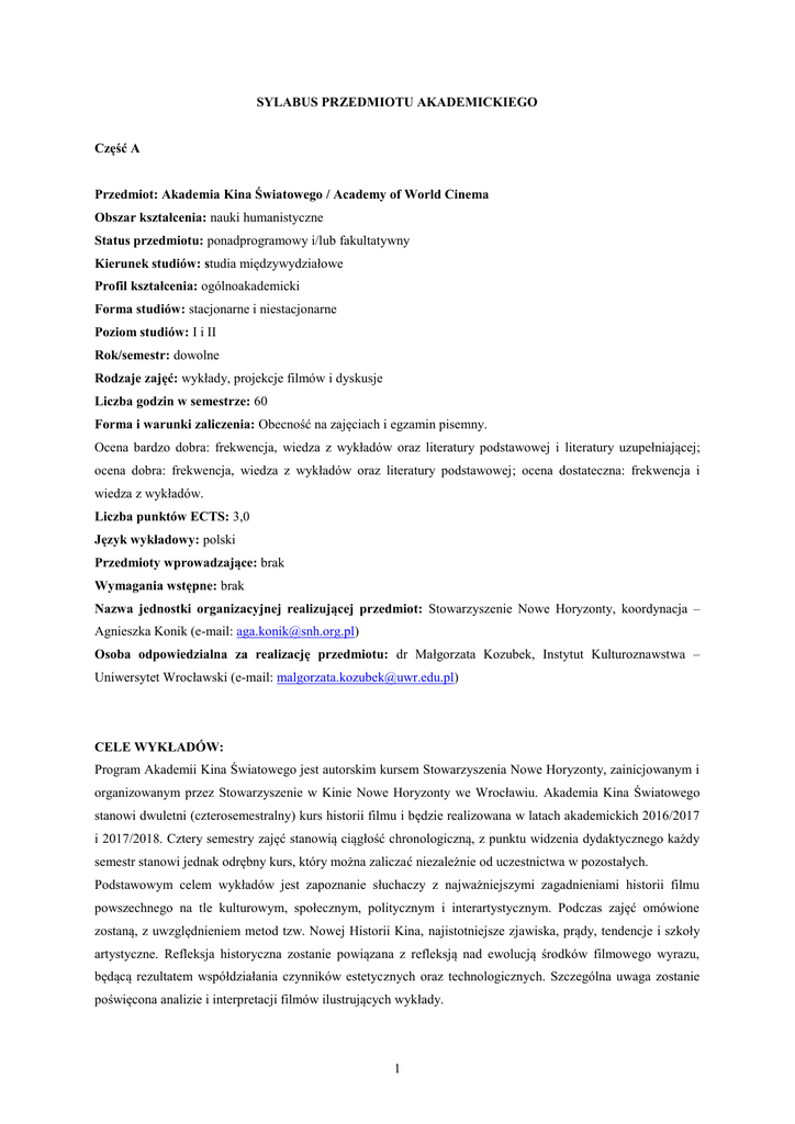 SYLABUS PRZEDMIOTU AKADEMICKIEGO Część A Przedmiot: Akademia Kina Światowego / Academy of World Cinema Obszar kształcenia: nauki humanistyczne Status przedmiotu: ponadprogramowy i/lub fakultatywny Kierunek studiów: studia międzywydziałowe Profil kształcenia: ogólnoakademicki Forma studiów: stacjonarne i niestacjonarne Poziom studiów: I i II Rok/semestr: dowolne Rodzaje zajęć: wykłady, projekcje filmów i dyskusje Liczba godzin w semestrze: 60 Forma i warunki zaliczenia: Obecność na zajęciach i egzamin pisemny. Ocena bardzo dobra: frekwencja, wiedza z wykładów oraz literatury podstawowej i literatury uzupełniającej; ocena dobra: frekwencja, wiedza z wykładów oraz literatury podstawowej; ocena dostateczna: frekwencja i wiedza z wykładów. Liczba punktów ECTS: 3,0 Język wykładowy: polski Przedmioty wprowadzające: brak Wymagania wstępne: brak Nazwa jednostki organizacyjnej realizującej przedmiot: Stowarzyszenie Nowe Horyzonty, koordynacja – Agnieszka Konik (e-mail: [email protected]) Osoba odpowiedzialna za realizację przedmiotu: dr Małgorzata Kozubek, Instytut Kulturoznawstwa – Uniwersytet Wrocławski (e-mail: [email protected]) CELE WYKŁADÓW: Program Akademii Kina Światowego jest autorskim kursem Stowarzyszenia Nowe Horyzonty, zainicjowanym i organizowanym przez Stowarzyszenie w Kinie Nowe Horyzonty we Wrocławiu. Akademia Kina Światowego stanowi dwuletni (czterosemestralny) kurs historii filmu i będzie realizowana w latach akademickich 2016/2017 i 2017/2018. Cztery semestry zajęć stanowią ciągłość chronologiczną, z punktu widzenia dydaktycznego każdy semestr stanowi jednak odrębny kurs, który można zaliczać niezależnie od uczestnictwa w pozostałych. Podstawowym celem wykładów jest zapoznanie słuchaczy z najważniejszymi zagadnieniami historii filmu powszechnego na tle kulturowym, społecznym, politycznym i interartystycznym. Podczas zajęć omówione zostaną, z uwzględnieniem metod tzw. Nowej Historii Kina, najistotniejsze zjawiska, prądy, tendencje i szkoły artystyczne. Refleksja historyczna zostanie powiązana z refleksją nad ewolucją środków filmowego wyrazu, będącą rezultatem współdziałania czynników estetycznych oraz technologicznych. Szczególna uwaga zostanie poświęcona analizie i interpretacji filmów ilustrujących wykłady. 1 SYLWETKA ABSOLWENTA: Absolwent Akademii Kina Światowego dzięki opanowaniu kanonu historii światowego kina oraz elementów warsztatu filmoznawczego będzie dysponował odpowiednią wiedzą, by móc podjąć pracę m. in. w instytucjach związanych z produkcją i dystrybucją filmową (wytwórnie i studia filmowe, ośrodki telewizyjne, firmy dystrybucyjne, itp.), animatora kultury filmowej (np. festiwali filmowych), a także krytyka filmowego w prasie branżowej i środkach masowego przekazu (m.in. w portalach internetowych). Ukończenie Akademii Kina Światowego może mu również zapewnić przygotowanie do dalszego, już stricte profesjonalnego wykształcenia filmowego, przygotowującego do zawodów reżysera, scenarzysty, operatora czy montażysty. TREŚCI WYKŁADÓW: Program Akademii Kina Światowego prezentuje najważniejsze etapy historii światowego filmu, koncentrując się na zagadnieniach z języka filmowego, rozwoju gatunków i powstawania nowych stylów i zjawisk w światowym kinie, kształtowania się dramaturgii, narracji i estetyki filmowej. Program rozpisany jest na 2 lata akademickie, a każdy z 4 semestrów składa się z 13 zajęć tematycznych (łącznie 52 zajęcia), natomiast pojedyncze zajęcia Akademii Kina Światowego odbywają się według schematu: 60-90 minutowy akademicki wykład, jeden seans filmowy, dyskusja. Wykłady prowadzą specjaliści (głównie filmoznawcy i kulturoznawcy) z ośrodków akademickich z całego kraju. Każdy semestr Akademii Kina Światowego kończy się egzaminem i zaliczeniem na ocenę. Wykłady oraz projekcje odbywają się w trybie cotygodniowym (we wtorki o godz. 17:00) w Kinie Nowe Horyzonty przy ul. Kazimierza Wielkiego 19a-21 we Wrocławiu. Szczegółowe informacje i harmonogramy zajęć dostępne są na stronie www.kinonh.pl/akademie LITERATURA Literatura podstawowa: 1. Historia kina tom 1 – Kino nieme, red. Tadeusz Lubelski, Iwona Sowińska, Rafał Syska, Kraków 2009. 2. Historia kina tom 2 – Kino klasyczne, red. Tadeusz Lubelski, Iwona Sowińska, Rafał Syska, Kraków 2011. 3. Historia kina tom 3 – Kino epoki nowofalowej, red. Tadeusz Lubelski, Iwona Sowińska, Rafał Syska, Kraków 2015. Literatura uzupełniająca na dany semestr Akademii jest podawana uczestnikom zajęć na początku każdego semestru. 2 RAMOWY PROGRAM AKADEMII KINA ŚWIATOWEGO Semestr 1 (październik 2016 – luty 2017) 1. Archeologia kina 2. Nie tylko Lumière 3. Drugie narodziny kina 4. Pierwszy gwiazdozbiór: w świecie komedii, wodewilu i rozrywek scenicznych 5. Ożywione rysunki: wczesne filmy animowane 6. W świecie synestezji i symfonii miejskich 7. Radziecka szkoła montażu 8. Surrealizm, impresjonizm i dadaizm w filmie 9. Twórcze przetworzenie rzeczywistości: narodziny dokumentalizmu 10. Arcydzieła niemego kina skandynawskiego 11. Dźwięki kina: wczesne efekty dźwiękowe i przełom dźwiękowy w kinie 12. Wszystkie barwy świata: kolor w filmie 13. Film niemiecki w epoce wilhelmińskiej, weimarskiej i w Trzeciej Rzeszy 14. Egzamin Semestr 2 (marzec – czerwiec 2017) 1. System klasycznego Hollywoodu 2. Odmiany komedii filmowej 3. Klasyczny western 4. Złota era musicalu 5. Film noir 6. Drugi gwiazdozbiór: wielkie aktorki 7. Włoski neorealizm filmowy 8. Polityka autorska w kinie 9. Filmowy modernizm 10. Czechosłowacka Nowa Fala 11. Kino Dalekiego Wschodu 12. Cinéma Vérité, kino bezpośrednie 13. Kino kontestacji i koniec Hollywood 14. Egzamin Semestr 3 (październik 2017 – luty 2018) 1. Nowe Hollywood 2. Nowe Kino Niemieckie 3. Włoskie kino kontestacji 4. Brytyjskie kino społeczne 5. Kino hiszpańskie 6. Kino Antypodó