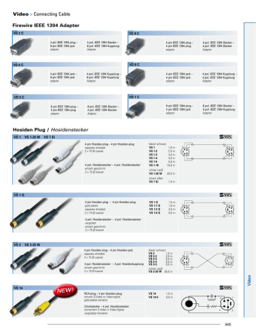 Video > Connecting Cable Firewire IEEE 1394 Adapter VD 2 C VD 9 C 4 pin IEEE 1394 plug – 6 pin IEEE 1394 jack adapter 4 pol. IEEE 1394 Stecker – 6 pol. IEEE 1394 Kupplung Adapter 4 pin IEEE 1394 plug – 4 pin IEEE 1394 plug adapter 4 pol. IEEE 1394 Stecker – 4 pol. IEEE 1394 Stecker Adapter 4 pin IEEE 1394 jack – 4 pin IEEE 1394 jack adapter 4 pol. IEEE 1394 Kupplung – 4 pol. IEEE 1394 Kupplung Adapter 6 pin IEEE 1394 plug – 4 pin IEEE 1394 jack adapter 6 pol. IEEE 1394 Stecker – 4 pol. IEEE 1394 Kupplung Adapter VD 8 C VD 6 C 4 pin IEEE 1394 jack – 6 pin IEEE 1394 jack adapter 4 pol. IEEE 1394 Kupplung – 6 pol. IEEE 1394 Kupplung Adapter VD 7 C VD 5 C 6 pin IEEE 1394 plug – 4 pin IEEE 1394 plug adapter 6 pol. IEEE 1394 Stecker – 4 pol. IEEE 1394 Stecker Adapter Hosiden Plug / Hosidenstecker VS 1 VS 1-20 W VS 1 Si 4 pin Hosiden-plug – 4 pin Hosiden-plug separate shielded 2 x 75 Ω coaxial 4 pol. Hosidenstecker – 4 pol. Hosidenstecker einzeln geschirmt 2 x 75 Ω koaxial black/ schwarz VS 1 VS 1-2 VS 1-3 VS 1-4 VS 1-5 VS 1-10 1,5 m 2,0 m 3,0 m 4,0 m 5,0 m 10,0 m white/ weiß VS 1-20 W 20,0 m silver/ silber VS 1 Si 1,5 m VS 1 G VS 1-1 G VS 1-2 G VS 1-5 G 1,5 m 1,0 m 2,0 m 5,0 m 2 4 2 4 3 1 3 4 2 4 1 3 1 3 2 4 1 3 1 3 2 4 1 VS 1 G 4 pin Hosiden-plug – 4 pin Hosiden-plug gold plated separate shielded 2 x 75 Ω coaxial 2 4 pol. Hosidenstecker – 4 pol. Hosidenstecker vergoldet einzeln geschirmt 2 x 75 Ω koaxial VS 3 VS 3-20 W 4 pin Hosiden-plug – 4 pin Hosiden-jack separate shielded 2 x 75 Ω coaxial VS 14 Video 4 pol. Hosidenstecker – 4 pol. Hosidenkupplung einzeln geschirmt 2 x 75 Ω koaxial black/ schwarz VS 3 1,5 m VS 3-2 2,0 m VS 3-3 3,0 m VS 3-4 4,0 m VS 3-5 5,0 m white/ weiß VS 3-20 W 20,0 m NEW! RCA-plug – 4 pin Hosiden-plug convert S-Video to Video-signal, gold plated contacts Cinchstecker – 4 pol. Hosidenstecker konvertiert S-Video in Video-Signal, vergoldete Kontakte VS 14 VS 14-5 1,5 m 5,0 m 1 3 4 2 443 Video > Connecting Cable VS 15 4 pin Hosiden-plug – 2x RCA-plug separate shielded 2 x 75 Ω coaxial black plug for luminanz VS 15 1,5 m 4 pol. Hosidenstecker – 2x Cinchstecker einzeln geschirmt 2 x 75 Ω koaxial schwarzer Stecker für Luminanz 2 4 Chrominanz 1 3 Luminanz VS 18 4 pin Hosiden-plug – 1x RCA-jack connecting cable for Loewe-TV with S-VHS socket (for FBAS/composite-signal) to video cutting-interface (with FBAS input) VS 18 0,2 m 2 4 pol. Hosidenstecker – 1x Cinchkupplung Verbindungskabel zwischen Loewe-TV mit S-VHSBuchse (für FBAS/Composite-Signal) und Videonachbearbeitungskarte (mit FBAS Eingang) 4 3 1 VS 13 4 pin Hosiden-plug + 2x RCA-plug 4 pin Hosiden-plug + 2x RCA-plug separate shielded audio: 2 x 0,14 mm2, stereo video: 2 x 75 Ω coaxial VS 13 VS 13-3 VS 13-5 2,0 m 3,0 m 5,0 m 4 pol. Hosidenstecker + 2x Cinchstecker 4 pol. Hosidenstecker + 2x Cinchstecker einzeln geschirmt Audio: 2 x 0,14 mm2, stereo Video: 2 x 75 Ω koaxial 2 4 2 4 1 3 1 3 VS 13 G 4 pin Hosiden-plug + 2x RCA-plug 4 pin Hosiden-plug + 2x RCA-plug gold plated, separate shielded audio: 2 x 0,14 mm2, stereo video: 2 x 75 Ω coaxial VS 13 G VS 13-3 G VS 13-5 G 2,0 m 3,0 m 5,0 m 4 pol. Hosidenstecker + 2x Cinchstecker 4 pol. Hosidenstecker + 2x Cinchstecker vergoldete Kontakte, einzeln geschirmt Audio: 2 x 0,14 mm2, stereo Video: 2 x 75 Ω koaxial 2 4 2 4 1 3 1 3 AL 20 Toslink-plug + 4 pin Hosiden-plug – Toslink-plug + 4 pin Hosiden-plug Hosiden-plug gold plated, DVD-player with optical audio OUT + S-VHS video OUT ➔ amplifier with optical IN + video/TV/video beamer with S-VHS IN Toslink-Stecker + 4 pol. Hosidenstecker (S-VHS) – Toslink-Stecker + 4 pol. Hosidenstecker (S-VHS) Hosidenstecker vergoldet, DVD-Player mit optischen Audio-OUT + S-VHS Video-OUT ➔ Verstärker mit optischen IN + Video/TV/Projektor mit S-VHS IN AL 20 1,5 m Toslink-plug + 4 pin Hosiden-plug – Toslink-plug + 4 pin Hosiden-plug Hosiden-plug gold plated, DVD-player with optical audio OUT + S-VHS video OUT ➔ amplifier with optical IN + video/TV/video beamer with S-VHS IN, high quality type, metal plugs Toslink-Stecker + 4 pol. Hosidenstecker (S-VHS) – Toslink-Stecker + 4 pol. Hosidenstecker (S-VHS) Hosidenstecker vergoldet, DVD-Player mit optischen Audio-OUT + S-VHS Video-OUT ➔ Verstärker mit optischen IN + Video/TV/Projektor mit S-VHS IN, High-Quality-Typ, Metallstecker AL 20 HR 1,5 m AL 20 HR 444 Video > Connecting Cable VM 12 8 pin Hosiden-plug – Scart-plug for camcorder like Fisher, Sanyo, Siemens shielded audio: 1 x 0,14 mm2 mono video: 1 x 75 Ω coaxial VM 12 2,0 m 5 4 1 EN 50 049 20 1 2 8 7 2 6 3 8 pol. Hosidenstecker – Scartstecker für Camcorder von Fisher, Sanyo, Siemens geschirmt Audio: 1 x 0,14 mm2 mono Video: 1 x 75 Ω koaxial 21 19 DIN 6 pin / DIN 6 pol. V 6 V 8 6 pin DIN-plug – 6 pin DIN-plug shielded audio: 2 x 0,14 mm2, stereo video: 1 x 0,14 mm2 DIN 45 322 V 6 V 6-2 V 8 1,5 m 2,0 m 5,0 m 3 3 2 6 1 4 2 4 5 6 1 5 6 pol. DIN-Stecker – 6 pol. DIN-Stecker Gesamtabschirmung Audio: 2 x 0,14 mm2, stereo Video: 1 x 0,14 mm2 V 6-2 V DIN 45 322 6 pin DIN-plug – 6 pin DIN-plug high quality separate shielded audio: 2 x 0,14 mm2 , stereo video: 1 x 75 Ω coaxial V 6-2 V 2,0 m 3 3 2 6 1 4 2 4 5 6 1 5 6 pol. DIN-Stecker – 6 pol. DIN-Stecker hochwertige Ausführung, einzeln geschirmt Audio: 2 x 0,14 mm2, stereo Video: 1 x 75 Ω koaxial V 9 V 10 V 11 6 pin DIN-plug – 6 pin DIN-jack shielded audio: 2 x 0,14 mm2, stereo video: 1 x 0,14 mm2 2,0 m 3,0 m 5,0 m 3 2 1 6 3 4 4 5 5 6 2 1 6 pol. DIN-Stecker – 6 pol. DIN-Kupplung Gesamtabschirmung Audio: 2 x 0,14 mm2, stereo Video: 1 x 0,14 mm2 Video DIN 45 322 V 9 V 10 V 11 V 16 6 pin DIN-plug – 3x RCA-plug separate shielded audio: 2 x 0,14 mm2, stereo video: 1 x 75 Ω coaxial DIN 45 322 6 pol. DIN-Stecker – 3x Cinchstecker einzeln geschirmt Audio: 2 x 0,14 mm2, stereo Video: 1 x 75 Ω koaxial V 16 V 16-2 1,5 m 2,0 m 3 2 1 4 6 5 445