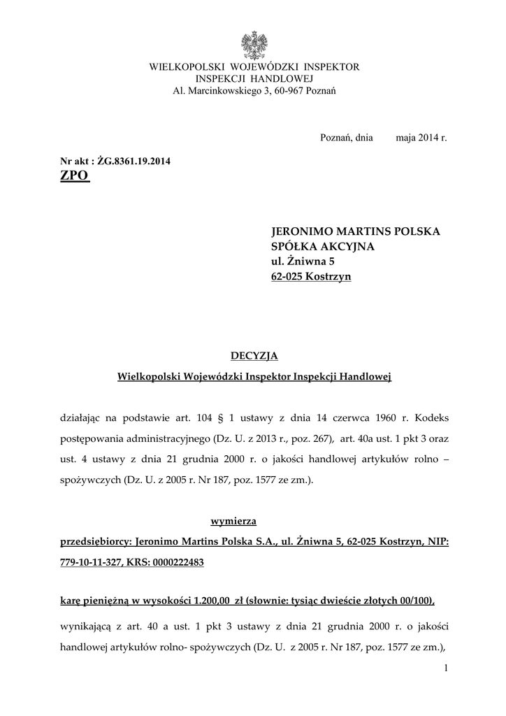 WIELKOPOLSKI WOJEWÓDZKI INSPEKTOR INSPEKCJI HANDLOWEJ Al. Marcinkowskiego 3, 60-967 Poznań Poznań, dnia maja 2014 r. Nr akt : ŻG.8361.19.2014 ZPO JERONIMO MARTINS POLSKA SPÓŁKA AKCYJNA ul. Żniwna 5 62-025 Kostrzyn DECYZJA Wielkopolski Wojewódzki Inspektor Inspekcji Handlowej działając na podstawie art. 104 § 1 ustawy z dnia 14 czerwca 1960 r. Kodeks postępowania administracyjnego (Dz. U. z 2013 r., poz. 267), art. 40a ust. 1 pkt 3 oraz ust. 4 ustawy z dnia 21 grudnia 2000 r. o jakości handlowej artykułów rolno – spożywczych (Dz. U. z 2005 r. Nr 187, poz. 1577 ze zm.). wymierza przedsiębiorcy: Jeronimo Martins Polska S.A., ul. Żniwna 5, 62-025 Kostrzyn, NIP: 779-10-11-327, KRS: 0000222483 karę pieniężną w wysokości 1.200,00 zł (słownie: tysiąc dwieście złotych 00/100), wynikającą z art. 40 a ust. 1 pkt 3 ustawy z dnia 21 grudnia 2000 r. o jakości handlowej artykułów rolno- spożywczych (Dz. U. z 2005 r. Nr 187, poz. 1577 ze zm.), 1 z tytułu wprowadzenia do obrotu handlowego w dniu kontroli tj. w dniu 5 lutego 2014 roku w markecie Biedronka, ul. Wierzbięcice 36/38, 61-568 Poznań, przedsiębiorca: Jeronimo Martins Polska S.A., ul. Żniwna 5, 62-025 Kostrzyn, artykułów rolno - spożywczych nieodpowiadających jakości handlowej określonej w przepisach o jakości handlowej, ogólnej wartości 244,67 zł, tj: • partii 10 opak. a 400g produktu Naleśniki z serem „SWOJSKA CHATA” w cenie 3,29 zł/op. wartości 32,90 zł wyprodukowanego dla „Biedronka” przez Virtu Sp. z o.o. Sp. k. 42-400 Zawiercie, ul. Łośnicka 35, • partii 7 opak. a 400g produktu Naleśniki z jabłkami „SWOJSKA CHATA” w cenie 3,29 zł/op. wartości 23,03 zł wyprodukowanego dla „Biedronka” przez Virtu Sp. z o.o. Sp. k. 42-400 Zawiercie, ul. Łośnicka 35, • partii 4 opak. a 400g produktu Pierogi serowo-jagodowe „SWOJSKA CHATA” w cenie 4,39 zł/op. wartości 17,56 wyprodukowanego dla Jeronimo Martins Polska S.A. ul. Żniwna 5, 62-025 Kostrzyn przez „U Jędrusia”® Sp. z o.o. Przemęczanki 32, 32-107 Radziemice, Zakład Produkcyjny Morawica 306, 32060 Liszki, • partii 10 opak. a 400g produktu Pierogi z serem „SWOJSKA CHATA” w cenie 4,39 zł/op. wartości 43,90 zł wyprodukowanego dla Jeronimo Martins Polska S.A. ul. Żniwna 5, 62-025 Kostrzyn przez „U Jędrusia”® Sp. z o.o. Przemęczanki 32, 32-107 Radziemice, Zakład Produkcyjny Morawica 306, 32-060 Liszki, • partii 5 opak. a 400g produktu Pierogi serowo-truskawkowe „SWOJSKA CHATA”w cenie 4,39 zł/op. wartości 21,95 zł wyprodukowanego dla Jeronimo Martins Polska S.A. ul. Żniwna 5, 62-025 Kostrzyn przez „U Jędrusia”® Sp. z o.o. Przemęczanki 32, 32-107 Radziemice, Zakład Produkcyjny Morawica 306, 32-060 Liszki, • partia 12 opak. a 400g produktu Pierogi ruskie „SWOJSKA CHATA” w cenie 3,29 zł/op. wartości 39,48 zł wyprodukowanego dla Jeronimo Martins Polska S.A. ul. Żniwna 5, 62-025 Kostrzyn przez „U Jędrusia”® Sp. z o.o. Przemęczanki 32, 32-107 Radziemice, Zakład Produkcyjny Morawica 306, 32-060 Liszki, 2 • partii 5 opak. a 400g produktu Krokiety z mięsem „SWOJSKA CHATA” w cenie 4,39 zł/op. wartości 21,95 zł wyprodukowanego dla Jeronimo Martins Polska S.A. ul. Żniwna 5, 62-025 Kostrzyn przez „U Jędrusia”® Sp. z o.o. Przemęczanki 32, 32-107 Radziemice, Zakład Produkcyjny Morawica 306, 32060 Liszki, • partii 10 opak. a 400g produktu Krokiety z kapustą i grzybami „SWOJSKA CHATA” w cenie 4,39 zł/op. wartości 43,90 zł wyprodukowanego dla Jeronimo Martins Polska S.A. ul. Żniwna 5, 62-025 Kostrzyn przez „U Jędrusia”® Sp. z o.o. Przemęczanki 32, 32-107 Radziemice, Zakład Produkcyjny Morawica 306, 32-060 Liszki. Na opakowaniach – na czołowej stronie w/w produktów podano informację o treści „Smak tradycji”, podczas gdy w składzie na opakowaniach jednostkowych wymieniono dodatki do żywności: substancję konserwującą – sorbinian potasu, aromaty, substancję spulchniającą – wodorowęglan sodu. Oznaczenie produktów w taki sposób może wprowadzać konsumenta w błąd, co do charakterystyki środka spożywczego, tj. co do jego składu poprzez sugerowanie, że produkty te wytworzono w oparciu o tradycyjne, stare receptury, bez użycia substancji dodatkowych. Powyższe stanowi naruszenie przepisów art. 6. ust. 2 i 3 ustawy z dnia 21 grudnia 2000 r. o jakości handlowej artykułów rolno-spożywczych (Dz. U. z 2005 r. Nr 187, poz. 1577 ze zm.), w związku z art. 46 ust. 1 pkt 1 lit. a ustawy z dnia 25 sierpnia 2006 r. o bezpieczeństwie żywności i żywienia (Dz. U. z 2010 r. Nr 136, poz. 914 ze zm.). Kontrolowany wprowadził zatem do obrotu artykuły rolno-spożywcze nieodpowiadające jakości handlowej określonej w przepisach o jakości handlowej co skutkuje zastosowaniem art. 40 a ust. 1 pkt 3 ustawy o jakości handlowej artykułów rolno- spożywczych (Dz. U. z 2005, Nr 187 poz. 1577 ze zm.). „Kto wprowadza do obrotu artykuły rolno-spożywcze nieodpowiadające jakości handlowej określonej w przepisach o jakości 3 handlowej lub deklarowanej przez producenta w oznakowaniu tych artykułów, podlega karze pieniężnej w wysokości do pięciokrotnej wartości korzyści majątkowej uzyskanej lub która mogłaby zostać uzyskana przez wprowadzenie tych artykułów rolno-spożywczych do obrotu, nie niższej jednak niż 500 zł.”. Uzasadnienie Podczas kontroli przeprowadzonej przez Wielkopolskiego Wojewódzkiego Inspektora Inspekcji Handlowej, w dniach od 5 do 11 lutego 2014 roku w markecie Biedronka, ul. Wierzbięcice 36/38, 61-568 Poznań, przedsiębiorca: Jeronimo Martins Polska S.A., ul. Żniwna 5, 62-025 Kostrzyn, artykułów rolno - spożywczych nieodpowiadających jakości handlowej określonej w przepisach o jakości handlowej, ogólnej wartości 244,67 zł, tj: • partii 10 opak. a 400g produktu Naleśniki z serem „SWOJSKA CHATA” w cenie 3,29 zł/op. wartości 32,90 zł wyprodukowanego dla „Biedronka”