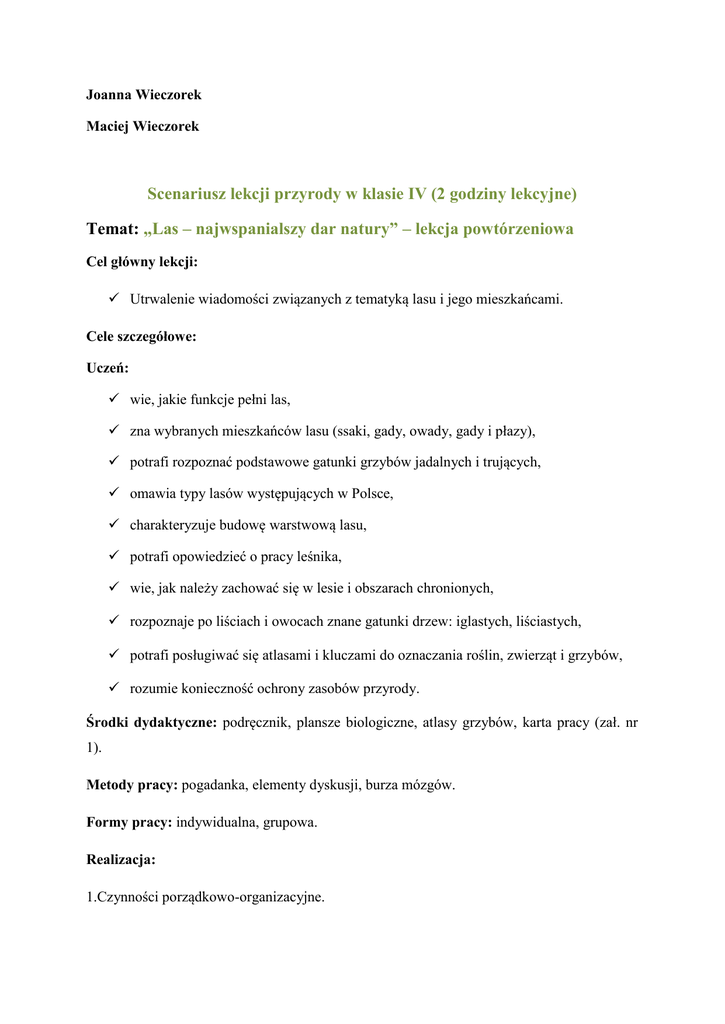 Joanna Wieczorek Maciej Wieczorek Scenariusz lekcji przyrody w klasie IV (2 godziny lekcyjne) Temat: „Las – najwspanialszy dar natury” – lekcja powtórzeniowa Cel główny lekcji: Utrwalenie wiadomości związanych z tematyką lasu i jego mieszkańcami. Cele szczegółowe: Uczeń: wie, jakie funkcje pełni las, zna wybranych mieszkańców lasu (ssaki, gady, owady, gady i płazy), potrafi rozpoznać podstawowe gatunki grzybów jadalnych i trujących, omawia typy lasów występujących w Polsce, charakteryzuje budowę warstwową lasu, potrafi opowiedzieć o pracy leśnika, wie, jak należy zachować się w lesie i obszarach chronionych, rozpoznaje po liściach i owocach znane gatunki drzew: iglastych, liściastych, potrafi posługiwać się atlasami i kluczami do oznaczania roślin, zwierząt i grzybów, rozumie konieczność ochrony zasobów przyrody. Środki dydaktyczne: podręcznik, plansze biologiczne, atlasy grzybów, karta pracy (zał. nr 1). Metody pracy: pogadanka, elementy dyskusji, burza mózgów. Formy pracy: indywidualna, grupowa. Realizacja: 1.Czynności porządkowo-organizacyjne. 2. Wprowadzenie nauczyciela: Od pradziejów życie człowieka ściśle wiązało się z lasem. W tym najwspanialszym tworze natury człowiek chronił się, zdobywał pożywienie i ubiór. Przez bardzo długi okres czasu była to jednak miłość nieodwzajemniona. Człowiek czerpał korzyści w sposób coraz bardziej zachłanny i nieprzemyślany. Dopiero w ostatnich dziesiątkach lat, które stanowią małą cząstkę wspólnej egzystencji ludzi i lasu człowiek zaczął się odwdzięczać lasom za dotychczasowe dobra. W obliczu chorób i zamierania lasów wszczęto walkę o ratowanie tego wspaniałego daru natury. 3. Następnie nauczyciel przypomina definicje lasu. 4. Zapisanie tematu lekcji. 3. Rozwinięcie: Praca z Kartą Pracy 4. Podsumowanie i zapisanie wniosków. 5. Praca domowa Dowiedz się na czym polega praca leśniczego. Uwzględnij prace, które wykonuje w lesie przez cały rok. Literatura: Czołnik B., Lekcje w lesie, czyli praktyczne formy edukacji leśnej, Ośrodek Kultury Leśnej w Gołuchowie, Poznań 1998. Fabijański P., Las. Pytania i odpowiedzi, Warszawa 2012. Klimkiewicz D., Kwiecień M., Środowisko społeczno-przyrodnicze. Podręcznik dla klasy 3 szkoły podstawowej, Kraków 1998. Marko-Worłowska M., Szlajfer F., Stawarz J., Podręcznik przyrody dla klasy IV ,,Tajemnice przyrody”, Warszawa 2011. Snowarski M., Atlas grzybów, Warszawa 2005. Zasoby internetowe: https://www.wlin.pl/las/lesnictwo/zachowanie-sie-w-lesie/tablice-i-znaki-w-lesie/ https://www.wlin.pl/las/lesnictwo/budowa-lasu http://www.lasypolskie.pl/ http://www.artykul.com.pl/dlaczego-warto-dbac-o-lasy/ http://www.RazvitieRebenka.com Załącznik nr 1 Karta pracy Co tak właściwie zawdzięczamy lasom? Oczekiwane odpowiedzi (funkcje, jakie pełnią lasy): są największą fabryka tlenu, wpływają łagodząco na klimat, regulują wilgotność powietrza, osłabiają siłę wiatrów i huraganów, zapobiegają powodziom, przeciwdziałają niszczącym skutkom lawin (na terenach górskich), chronią przed erozją, kiedy gleba leśna spleciona siecią korzeni, krzewów i traw nie poddaje się negatywnemu działaniu wiatru i wody, dostarczają drewna, owoców leśnych, zwierzyny łownej, działają kojąco na nasz system nerwowy dzięki zawartości fitoncydów wydzielanych przez niektóre drzewa, stanowią miejsce rekreacji i wypoczynku, oazę ciszy przerywanej jedynie śpiewem ptaków, z powietrzem przesyconym zapachem żywicy, ziół i igliwia. Zadanie Rysunek przedstawia warstwową budowę lasu. Napisz, jak nazywają się kolejne warstwy i jakie rośliny do nich należą. Wykorzystaj w tym celu podpowiedzi z ramki. gleba leśna, korony drzew, pnie, podszyt, runo leśne, podrost, ściółka. Jerash - Giordania Jerash - Giordania Jerash - Giordania Jerash - Giordania Jerash - Giordania Jerash - Giordania Jerash - Giordania Źródło: https://www.wlin.pl/las/lesnictwo/budowa-lasu Zadanie Jakie znasz rodzaje lasów występujących w Polsce? Pod rodzajami lasów wymień wstępujące w nich drzewa. LAS ………………………………………………………………………………………………………… …………………………………………………… …………………………………………………… …………………………………………………… …………………………………………………… …………………………………………………… …………………………………………………… …………………………………………………… …………………………………………………… …………………………………………………… …………………………………………………… …………………………………………………… …………………………………………………… …………………………………………………… …………………………………………………… …………………………………………………… Zadanie Każdy miłośnik lasów wie, jak się w nim zachować. Wypisz podstawowe zasady obowiązujące podczas pobytu w lesie, rezerwatach przyrody oraz parkach narodowych. Zadanie Najważniejsze i podstawowe warunki korzystania z parku czy rezerwatu często opisane są w postaci piktogramów (obrazków) na bilecie wstępu do danego obiektu, a o tym że znajdujemy się na terenie parku lub rezerwatu informują nas odpowiednie tablice. Do poszczególnych numerów dopisz niezbędną informację. Podpowiedź znajdziesz w ramce. 1. 2. 3. 4. 5. 6. Źródło: https://www.wlin.pl/las/lesnictwo/zachowanie-sie-w-lesie/tablice-i-znaki-w-lesie/ zakaz śmiecenia, zakaz puszczania psów bez smyczy, zakaz używania otwartego ognia, zakaz zrywania roślin, zakaz schodzenia z wyznaczonych szlaków, zakaz hałasowania i