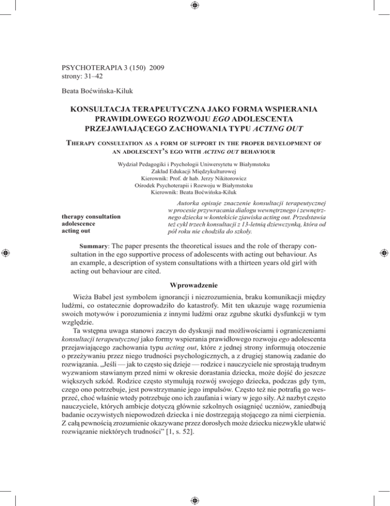 Psychoterapia 3 (150) 2009 strony: 31–42 Beata Boćwińska-Kiluk Konsultacja terapeutyczna jako forma wspierania prawidłowego rozwoju ego adolescenta przejawiającego zachowania typu acting out Therapy consultation as a form of support in the proper development of an adolescent’s ego with acting out behaviour Wydział Pedagogiki i Psychologii Uniwersytetu w Białymstoku Zakład Edukacji Międzykulturowej Kierownik: Prof. dr hab. Jerzy Nikitorowicz Ośrodek Psychoterapii i Rozwoju w Białymstoku Kierownik: Beata Boćwińska-Kiluk therapy consultation adolescence acting out Autorka opisuje znaczenie konsultacji terapeutycznej w procesie przywracania dialogu wewnętrznego i zewnętrznego dziecka w kontekście zjawiska acting out. Przedstawia też cykl trzech konsultacji z 13-letnią dziewczynką, która od pół roku nie chodziła do szkoły. Summary: The paper presents the theoretical issues and the role of therapy consultation in the ego supportive process of adolescents with acting out behaviour. As an example, a description of system consultations with a thirteen years old girl with acting out behaviour are cited. Wprowadzenie Wieża Babel jest symbolem ignorancji i niezrozumienia, braku komunikacji między ludźmi, co ostatecznie doprowadziło do katastrofy. Mit ten ukazuje wagę rozumienia swoich motywów i porozumienia z innymi ludźmi oraz zgubne skutki dysfunkcji w tym względzie. Ta wstępna uwaga stanowi zaczyn do dyskusji nad możliwościami i ograniczeniami konsultacji terapeutycznej jako formy wspierania prawidłowego rozwoju ego adolescenta przejawiającego zachowania typu acting out, które z jednej strony informują otoczenie o przeżywaniu przez niego trudności psychologicznych, a z drugiej stanowią zadanie do rozwiązania. „Jeśli — jak to często się dzieje — rodzice i nauczyciele nie sprostają trudnym wyzwaniom stawianym przed nimi w okresie dorastania dziecka, może dojść do jeszcze większych szkód. Rodzice często stymulują rozwój swojego dziecka, podczas gdy tym, czego ono potrzebuje, jest powstrzymanie jego impulsów. Często też nie potrafią go wesprzeć, choć właśnie wtedy potrzebuje ono ich zaufania i wiary w jego siły. Aż nazbyt często nauczyciele, których ambicje dotyczą głównie szkolnych osiągnięć uczniów, zaniedbują badanie oczywistych niepowodzeń dziecka i nie dostrzegają stojącego za nimi cierpienia. Z całą pewnością zrozumienie okazywane przez dorosłych może dziecku niezwykle ułatwić rozwiązanie niektórych trudności” [1, s. 52]. 32 Beata Boćwińska-Kiluk Artykuł, oprócz teoretycznych rozważań dotyczących konsultacji i acting outu, zawiera także cykl trzech konsultacji, który został zwieńczony sukcesem — gdy terapeuta konsultant na spotkanie z pedagogiem z domu dziecka przygotował, po postawieniu diagnozy, plan postępowania, został poinformowany, iż dziewczynka następnego dnia po ostatniej konsultacji ponownie zaczęła realizować obowiązek szkolny. Acting out i jego związki z innymi mechanizmami obronnymi Acting out to pojęcie używane na oznaczenie czynności impulsywnych o charakterze autoagresywnym lub agresywnym. Inaczej można je określić przejściem do działania. Dla terapeuty o orientacji psychoanalitycznej jest informacją o pojawieniu się wyparcia, a więc sygnałem, że pewne treści są słabo tolerowane przez aparat psychiczny pacjenta, a środowisko ponosi porażkę w zawieraniu – kontenerowaniu ich. Zygmunt Freud wyparcie rozumiał jako „odrzucanie bodźca i trzymanie go z dala od obszaru świadomości” [2, s. 260]. Acting out jest zachowaniem odmiennym od normalnego zachowania dziecka i rozciąga się na kontinuum od form bardzo agresywnych do subtelnych, ale zawsze zawiera aspekt impulsywności, nawet jeśli został on wtórnie zracjonalizowany. Zawsze odnosi się do treści wypartych i wiąże z tak zwanym przeniesieniem. Jest to pewna aktualizacja konfliktu wewnętrznego lub traumy, ale i proces komunikacyjny. Wyjaśnienie związków pomiędzy acting outem a przeniesieniem zarówno w terapii, jak i w życiu pozwala wyodrębnić struktury aparatu psychicznego oraz nieświadome fantazje zakłócające życie codzienne [3]. Według Melanie Klein nieświadoma fantazja to psychiczny korelat lub umysłowa reprezentacja popędu [4]. Fantazja służy zaspokajaniu pragnień popędowych, ucieczce od rzeczywistości i obronie przed nadmiernym stresem i frustracją. Mechanizmy projekcji i introjekcji poprzedzają wyparcie i mają związek z inkorporowaniem i wydalaniem. Zinterpretowanie nieświadomej fantazji pozwala ją przeżyć i uzyskać wgląd w motywy zachowania. Fantazja umożliwia ego wytrzymanie napięcia bez natychmiastowego rozładowania motorycznego. Jednak w przypadku poważnego rozczarowania lub niemożliwości podtrzymania fantazji dochodzi do acting outu — działania, któremu towarzyszy rozpad niedojrzałego ego. Fantazja poprzedza proces myślenia i badania rzeczywistości. Myślenie wyłania się z konfrontacji fantazji z rzeczywistością, a środowisko musi utrzymywać frustrację w znośnych granicach. Jest to możliwe za sprawą „dość dobrej matki” (osoby sprawującej opiekę), która dostarcza słów, opisujących doświadczenie dziecka. Natomiast dziecko, jeśli środowisko nie jest wrażliwe na jego potrzeby lub nie rozumie jego komunikatów, nie może znieść rozczarowania rzeczywistością, co nasila jego omnipotentne fantazje — a rzeczywistość ulega zaprzeczeniu i zniszczeniu — oraz zachowania typu acting out. Kilka uwag o rozwoju dzieci i młodzieży Warunki wzrastania dzieci i młodzieży nie są czymś stałym, ale zmiennym, gdyż różne procesy zachodzące w społeczeństwie i kulturze mogą stać się hamulcem lub katalizatorem antynomii adolescenta i zachowań typu acting out. Jakość społecznej niszy rzutuje na dynamikę procesu rozwoju oraz rozstrzyga o wynikach starcia pokolenia młodych ze swoją indywidualną 