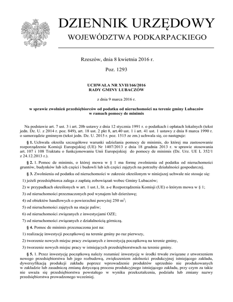 DZIENNIK URZĘDOWY WOJEWÓDZTWA PODKARPACKIEGO Rzeszów, dnia 8 kwietnia 2016 r. Poz. 1293 UCHWAŁA NR XVII/166/2016 RADY GMINY LUBACZÓW z dnia 9 marca 2016 r. w sprawie zwolnień przedsiębiorców od podatku od nieruchomości na terenie gminy Lubaczów w ramach pomocy de minimis Na podstawie art. 7 ust. 3 i art. 20b ustawy z dnia 12 stycznia 1991 r. o podatkach i opłatach lokalnych (tekst jedn. Dz. U. z 2014 r. poz. 849), art. 18 ust. 2 pkt 8, art.40 ust. 1 i art. 41 ust. 1 ustawy z dnia 8 marca 1990 r. o samorządzie gminnym (tekst jedn. Dz. U. 2015 r. poz. 1515 ze zm.) uchwala się, co następuje: § 1. Uchwała określa szczegółowe warunki udzielania pomocy de minimis, do której ma zastosowanie rozporządzenie Komisji Europejskiej (UE) Nr 1407/2013 z dnia 18 grudnia 2013 r. w sprawie stosowania art. 107 i 108 Traktatu o funkcjonowaniu Unii Europejskiej do pomocy de minimis (Dz. Urz. UE L 352/1 z 24.12.2013 r.). § 2. 1. Pomoc de minimis, o której mowa w § 1 ma formę zwolnienia od podatku od nieruchomości gruntów, budynków lub ich części i budowli lub ich części zajętych na potrzeby działalności gospodarczej. § 3. Zwolnienia od podatku od nieruchomości w zakresie określonym w niniejszej uchwale nie stosuje się: 1) jeżeli przedsiębiorca zalega z zapłatą zobowiązań wobec Gminy Lubaczów; 2) w przypadkach określonych w art. 1 ust.1, lit. a-e Rozporządzenia Komisji (UE) o którym mowa w § 1; 3) od nieruchomości przeznaczonych pod wynajem lub dzierżawę; 4) od obiektów handlowych o powierzchni powyżej 250 m2; 5) od nieruchomości zajętych na stacje paliw; 6) od nieruchomości związanych z inwestycjami OZE; 7) od nieruchomości związanych z działalnością górniczą. § 4. Pomoc de minimis przeznaczona jest na: 1) realizację inwestycji początkowej na terenie gminy po raz pierwszy, 2) tworzenie nowych miejsc pracy związanych z inwestycją początkową na terenie gminy, 3) tworzenie nowych miejsc pracy w istniejących przedsiębiorstwach na terenie gminy. § 5. 1. Przez inwestycję początkową należy rozumieć inwestycję w środki trwałe związane z utworzeniem nowego przedsiębiorstwa lub jego rozbudową, zwiększeniem zdolności produkcyjnej istniejącego zakładu, dywersyfikacją produkcji zakładu poprzez wprowadzenie produktów uprzednio nie produkowanych w zakładzie lub zasadniczą zmianą dotyczącą procesu produkcyjnego istniejącego zakładu, przy czym za takie nie uważa się przedsiębiorstwa powstałego w wyniku przekształcenia, podziału lub zmiany nazwy przedsiębiorstwa prowadzonego wcześniej. Dziennik Urzędowy Województwa Podkarpackiego –2– Poz. 1293 2. Zwiększenie zdolności produkcyjnej istniejącego zakładu oznacza rozbudowę istniejącego zakładu, np. uruchomienie kolejnej linii technologicznej (produkcyjnej) dla tego samego produktu, przy czym proces produkcyjny nie jest zasadniczo zmieniany lub wprowadzenie produkcji co najmniej jednego produktu więcej. 3. Nie jest nową inwestycją zastąpienie starych maszyn i urządzeń nowymi, wymiana dotychczasowego oprogramowania na nowe, remonty, naprawy. § 6. 1. Zwolnienie od podatku od nieruchomości, o którym mowa w uchwale obejmuje grunty, budynki, budowle lub ich części przeznaczone na działalność gospodarczą, stanowiące nowe inwestycje lub w przypadku gdy nową inwestycją jest uruchomienie nowej linii technologicznej, tą część gruntów, budynków lub budowli na której lub w której jest ona usytuowana. 2. Określony w uchwale warunek utworzenia nowych miejsc pracy oznacza przyrost netto liczby zatrudnionych w porównaniu ze średnią za okres 12 miesięcy, w przeliczeniu na osoby zatrudnione w pełnym wymiarze czasu pracy zgodnie z przepisami ustawy Kodeks pracy. § 7. 1. Przedsiębiorca uzyskuje pomoc, jeżeli wartość tej pomocy brutto łącznie z wartością innej pomocy de minimis otrzymanej przez przedsiębiorcę w różnych formach i z różnych źródeł, nie przekracza kwoty stanowiącej równowartość 200 000 euro, z zastrzeżeniem ust. 2. w okresie trzyletnim. 2. Wartość pomocy przyznana przedsiębiorcy działającemu w sektorze transportu drogowego towarów nie może przekroczyć kwoty stanowiącej równowartość 100.000 euro w okresie trzyletnim. 3. Trzyletni okres, o którym mowa w ust.1 i 2 oblicza się biorąc pod uwagę bieżący rok podatkowy oraz dwa poprzedzające lata podatkowe. 4. Przedsiębiorca nie może uzyskać pomocy, o której mowa w § 1, jeżeli otrzymał pomoc inną niż de minimis w odniesieniu do tych samych kosztów kwalifikowalnych lub tego samego środka finansowania ryzyka, a łączna kwota pomocy spowodowałaby przekroczenie dopuszczalnej intensywności pomocy lub kwotę pomocy dla konkretnego przeznaczenia ustaloną w rozporządzeniu w sprawie wyłączeń grupowych lub w decyzji Komisji. 5. Równowartość pomocy w euro ustala się według kursu średniego ogłoszonego przez Narodowy Bank Polski, obowiązującego w dniu udzielenia pomocy. 6. Dniem udzielenia pomocy jest dzień, w którym zgodnie z odrębnymi przepisami upływa termin złożenia deklaracji na podatek od nieruchomości lub w przypadku braku obowiązku złożenia deklaracji dzień faktycznego przysporzenia korzyści finansowych. 7. Przedsiębiorca otrzymuje zaświadczenie o otrzymanej pomocy de minimis. § 8. 1. Zwalnia się od podatku od nieruchomości grunty, budynki, budowle lub ich części stanowiące inwestycje początkowe związane z działalnością gospodarczą podjętą po raz pierwszy na terenie gminy Lubaczów przez przedsiębiorcę, który w okresie do 2 miesięcy od dnia rozpoczęcia działalności złoży wniosek o udzielenie pomocy de minimis. 2. Zwolnienie, o którym mowa w ust.1 przysługuje licząc od pierwszego dnia miesiąca następującego po miesiącu, w którym rozpoczęto prowadzenie działalności gospodarczej na okres: 1) 6 miesięcy – jeśli w wyniku inwestycji początkowej utworzono 1 miejsce pracy; 2) 12 miesięc