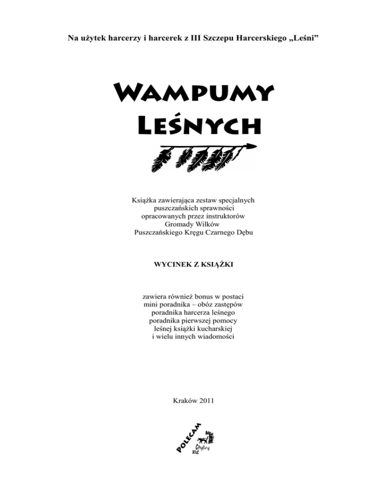 Na użytek harcerzy i harcerek z III Szczepu Harcerskiego „Leśni” Wampumy Leśnych Książka zawierająca zestaw specjalnych puszczańskich sprawności opracowanych przez instruktorów Gromady Wilków Puszczańskiego Kręgu Czarnego Dębu WYCINEK Z KSIĄŻKI zawiera również bonus w postaci mini poradnika – obóz zastępów poradnika harcerza leśnego poradnika pierwszej pomocy leśnej książki kucharskiej i wielu innych wiadomości Kraków 2011 Jeśli ktoś uważnie się przyjrzy to znajdzie w nich echa Leśnego Wampum Warszawskiej Drużyny „ArizonaC”, materiały z Wrocławskiego Szczepu Harcerzy Leśnych „Watra” oraz Czyny i Wielkie Czyny rodem ze „Zwoju Kory Brzozowej”. Wampumy Leśnych są instrumentem metodycznym będącym bazą do opracowywania indywidualnych programów dla harcerzy i harcerek stosowanym w Tyskim III Szczepie Harcerskim „Leśni” w celu uporządkowania oraz doprowadzenia do powtarzalności „drogi” jaką musi pokonać każdy adept leśnej mądrości. Dzięki swojej konstrukcji pozwalają jednak na modyfikacje służące spersonalizowaniu instrumentu. Oznaczeniem Wampumów jest plakietka. Plakietkę otrzymuje każdy adept, który rozpoczął zdobywanie Wampumów. O osiągnięciu danego poziomu świadczy mała tasiemka wszyta w dolną krawędź plakietki i wystająca na około centymetr. Dla MW jest to taśma biała, dla ŚW granatowa, dla DW zielona, a dla WW Czerwona. Plakietkę nosimy na prawym ramieniu ok. 1 do 2 cm od wszycia rękawa, ponad symbolami sprawności. Nie są nasze Wampumy łatwe do zdobycie jednak … Nie jest również bardzo trudne. Wszystkie te rzeczy są do zrobienia przez każdego harcerza. Potrzeba tylko wytrwałości i pewności, że droga którą obraliśmy jest właśnie tą drogą prowadzącą na Górę Poznania... Miłej wędrówki życzą instruktorzy Gromady Wilków Puszczańskiego Kręgu Czarnego Dębu: Notatki …................................................................................................................................................. …................................................................................................................................................. …................................................................................................................................................. …................................................................................................................................................. …................................................................................................................................................. …................................................................................................................................................. …................................................................................................................................................. …................................................................................................................................................. …................................................................................................................................................. …................................................................................................................................................. …................................................................................................................................................. …................................................................................................................................................. …................................................................................................................................................. …................................................................................................................................................. …................................................................................................................................................. …................................................................................................................................................. …................................................................................................................................................. …................................................................................................................................................. …................................................................................................................................................. …................................................................................................................................................. …................................................................................................................................................. …................................................................................................................................................. …................................................................................................................................................. …................................................................................................................................................. …................................................................................................................................................. …................................................................................................................................................. …................................................................................................................................................. …...................................................