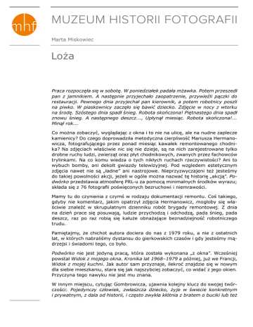MUZEUM HISTORII FOTOGRAFII Marta Miskowiec Loża Praca rozpoczęła się w sobotę. W poniedziałek padała mżawka. Potem przeszedł pan z jamnikiem. A następnie przyjechało zaopatrzenie, przywieźli pączki do restauracji. Pewnego dnia przyjechał pan kierownik, a potem robotnicy poszli na piwko. W piaskownicy zaczęło się bawić dziecko. Zdjęcie w nocy z wtorku na środę. Szóstego dnia spadł śnieg. Robota skończona! Piętnastego dnia spadł znowu śnieg. A następnego deszcz..., Upłynął miesiąc. Robota skończona!... Minął rok... Co można zobaczyć, wyglądając z okna i to nie na ulicę, ale na nudne zaplecze kamienicy? Do czego doprowadziła metodyczna cierpliwość Mariusza Hermanowicza, fotografującego przez ponad miesiąc kawałek remontowanego chodnika? Na zdjęciach właściwie nic się nie dzieje, są na nich zarejestrowane tylko drobne ruchy ludzi, zwierząt oraz płyt chodnikowych, zwanych przez fachowców trylinkami. Na co komu wiedza o tych nikłych ruchach rzeczywistości? Ani to wybuch bomby, ani dekolt gwiazdy telewizyjnej. Pod wzgledem estetycznym zdjęcia nawet nie są „ładne” ani nastrojowe. Nieprzyzwyczajeni też jesteśmy do takiej powolności akcji, jeżeli w ogóle można nazwać tę historię „akcją”. Podwórko przedstawia atmosferę PRL-u za pomocą minimalnych środków wyrazu; składa się z 76 fotografii poświęconych bezruchowi i niemrawości. Mamy tu do czynienia z czymś w rodzaju dokumentacji remontu. Coś takiego, gdyby nie komentarz, jakim opatrzył zdjęcia Hermanowicz, mogłoby się właściwie znaleźć w skrupulatnym dzienniku robót brygady remontowej. Z dnia na dzień prace się posuwają, ludzie przychodzą i odchodzą, pada śnieg, pada deszcz, raz po raz robią się kałuże obnażające beznadziejność robotniczego trudu. Pamiętajmy, że chichot autora dociera do nas z 1979 roku, a nie z ostatnich lat, w których nabraliśmy dystansu do gierkowskich czasów i gdy jesteśmy mądrzejsi i świadomi tego, co było. Podwórko nie jest jedyną pracą, która została wykonana „z okna”. Wcześniej powstał Widok z mojego okna. Kronika lat 1968–1979 a później, już we Francji, Widok z mojej kuchni. Jak autor sam przyznaje, ilekroć znajdzie się w nowym dla siebie mieszkaniu, stara się jak najszybciej zobaczyć, co widać z jego okien. Przyczyna tego nawyku nie jest mu znana. W innym miejscu, cytując Gombrowicza, ujawnia kolejny klucz do swojej twórczości: Pojedynczy człowiek, zwłaszcza dziecko, żyje w świecie konkretnym i prywatnym, z dala od historii, i często zwykła kłótnia z bratem o buciki lub też inna równie drobna, czysto przypadkowa okoliczność wywiera większy wpływ na duszę niż bitwy i marsze wojsk, gwałt, morderstwo i pożoga. Wielkie wypadki są dużo mniej groźne, niż małe, ponieważ przerastają naszą chłonność . (Witold Gombrowicz, Varia). Zdaje się, że tak zwana banalna codzienność własnej egzystencji, zmaganie się z jej zrozumieniem, jest dla Hermanowicza jedną z osi jego twórczości. Wszystko, co go otacza, wydaje się warte sfotografowania. Z tych kilku sekund wyrwanych z... (Robert Doisneau) codzienności i tak COŚ wyniknie: choćby niemal poetycka harmonia nieróbstwa w PRL-u czy niepocztówkowa obecność katedry gotyckiej w życiu codziennym mieszkańca Orleanu (Widok z mojej kuchni). Wielka historia nie ma istotnego znaczenia, jest zbyt oddalona i nieuchwytna, za to na podwórku dzieją się rzeczy dotykalne, a więc prawdziwe, choć mogą rzeczywiście, jak autor zasugerował w tytule, wydać się przedstawieniem teatralnym. Na wystawie można będzie obejrzeć pokazy slajdów z fotografii Mariusza Hermanowicza i kupić katalog jego prac z lat 1968–2002. Mariusz Hermanowicz urodził się w 1950 w Olsztynie, w 1974 ukończył Wydział Operatorski PWSFTiTV w Łodzi, od 1982 mieszka koło Orleanu we Francji, pracuje jako fotograf we francuskim Ministerstwie Kultury i Sztuki. Na stałe współpracuje z Fototapetą. Jest autorem pojedynczych prac fotograficznych oraz ponad sześćdziesięciu cykli fotograficznych, między innymi: Widok z mojego okna, Ktoś kogo nie znam, Nie mieszka pod podanym adresem, Wilno, a jednak. Obecnie pracuje nad poświęconą swojej rodzinie Księgę przodków. Wielokrotnie wystawiał w Małej Galerii ZPAF-CSW w Warszawie (6 wystaw indywidualnych), także w Canon Photo Gallery w Genewie, PAAS Gallery w Nowym Jorku. Jego prace znajdują się w zbiorach: Muzeum Sztuki w Łodzi, Muzeum Sztuki Współczesnej we Wrocławiu, Centre Pompidou, Fond Régional d’Art Contemporain, Poitou-Charentes. 2