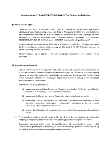 Regula i ak ji licytuj WIECZORNE OKAZJE w CH Auchan Mikołów §1 Postanowienia ogólne 1. Organizatorem akcji „licytuj WIECZORNE OKAZJE , zwa ej w dalszej zęś i regula i u „Ko kurse , jest RedCo “p. z o.o. z siedzi ą w Warszawie (02, przy uli y “a ały , wpisa a przez “ąd Rejo owy dla .st. Warszawy XIII Wydział Gospodar zy Krajowego Rejestru “ądowego do Rejestru Przedsię ior ów Krajowego Rejestru “ądowego pod u erem 0000279105, NIP: 521-34-33-033, Regon: 140952887 zwa a dalej: „Organizatorem 2. Ko kurs od ywa się w dniu 8 maja 2015 roku w godzinach od 18:00 do 21:00 na terenie galerii Centrum Handlowego Auchan Mikołów, przy ul. Gliwickiej 3, 43– 9 Mikołów, zwanego w dalszej zęś i regula i u „CH Au ha . 3. Ko kurs od ywa się w opar iu o przepisy polskiego. i iejszego Regula i u oraz przepisy prawa §2 Uczestnictwo w Konkursie 1. U zest ikie Ko kursu oże yć oso a peł olet ia a dzień 8 maja 2015 r.) weryfikowana na podstawie waż ego dowodu tożsa oś i dowodu oso istego lu paszportu , posiadają a peł ą zdol ość do zy oś i praw y h, za ieszkała a terytoriu Rze zpospolitej Polskiej, która speł i wy aga ia określo e w i iejszy Regulaminie, zwa a w dalszej zęś i i iejszego Regula i u także „U zest ikie 2. W Ko kursie ie ogą rać udziału: a) pracownicy Auchan Polska Sp. z o.o. w Piasecznie oraz Au ha Polska “p. z o.o. Oddział I o ha w Piase z ie, a także zło kowie i h rodzi ; b) pracownicy RedComm Sp. z o.o. w Warszawie, a także zło kowie i h rodzi ; c) pracownicy, osoby zatrudnione na podstawie stosunków cywilnoprawnych oraz właś i iele pu któw ha dlowy h i usługowy h z ajdują y h się a tere ie CH Auchan, a także zło kowie i h rodzi ; d) najemcy lokali ha dlowy h z ajdują y h się a tere ie CH Au ha oraz zło kowie i h rodzin 3. Przez zło ków rodzi , o który h owa w § pkt lit. a, , c i d rozu ie się ałżo ków, wstęp y h, zstęp y h, rodzeństwo oraz oso y pozostają e w stosu ku przysposo ie ia. 4. Organizator zastrzega sobie prawo do opublikowania lub przedstawienia imion i zdjęć U zest ików agrodzo y h w Ko kursie, w środka h asowego przekazu. Uczestnicy ie są upraw ie i do otrzy a ia wy agrodze ia z powyższego tytułu. 1 5. Przystąpie ie do Ko kursu oz a za, że U zest ik zapoz ał się z jego zasada i określo y i w niniejszym Regulaminie i akceptuje je. §3 Zasady Konkursu 1. A y wziąć udział w Ko kursie U zest ik usi speł ić łą z ie po iższe waru ki: a) w dniu 8 maja 2015 roku od godziny 18:00 do 20:59 doko ać zakupu towaru/towarów lu usługi/usługę a tere ie galerii ha dlowej CH Au ha za kwotę i i u 1 zł (dziesięć złoty h brutto oraz za hować dowód zakupu. ) Ko kursu wyłą zo e są dowody zakupu alkoholu, wyrobów tytoniowych, lekarstw i farmaceutyków, transakcji ka torowy h a także zakładów lotto, wszelki h gier li z owy h i losowy h, zakładów bukmacherskich, itp. W Ko kursie ie iorą udział parago y z Hiper arketu Au ha . b) jako jed a z pierwszy h pię iuset osó jak ajszy iej zgłosić się do Pu ktu O sługi Ko kursu „licytuj WIECZORNE OKAZJE dalej: Pu kt O sługi w CH Auchan. Punkt O sługi zy y jest w dniu 8 maja 2015 r. w godzinach od 18.00 do 21.00; c) przedstawić w Pu k ie O sługi dowód/dowody zakupów dokonanych zgodnie z §3 litera a) 2. Pierwszy h pię iuset U zest ików, którzy jako pierwsi zgłoszą się do Pu ktu O sługi oże wziąć udział w zabawach-aukcjach (dalej: „Auk je , w ra a h których licytowane ędą astępują e nagrody: a. W Aukcji o godzinie 18.30: 1)Nagroda numer 1 2)Nagroda numer 2 b. W Aukcji o godzinie 19.00: 1)Nagroda numer 3 2)Nagroda numer 4 c. W Aukcji o godzinie 19.30: 1)Nagroda numer 5 2)Nagroda numer 6 d. W Aukcji o godzinie 20.00: 1)Nagroda numer 7 2)Nagroda numer 8 e. W Aukcji o godzinie 20.30: 1)Nagroda numer 9 2)Nagroda numer 10 f. W Aukcji o godzinie 21.00: 1)Nagroda numer 11 2)Nagroda numer 12 2. “z zegółowa spe yfika ja agród z ajduje się w )ałą z iku u er do i iejszego Regula i u. 3. Każdy U zest ik Ko kursu iorą y udział w Auk ji oże li ytować agrody. Do li yta ji używa e są peł e dziesiątki złoty h po hodzą e z łą z ej wartoś i dowodów zakupu ze ra ych przez 2 Uczestnika zgodnie z §3 pu kt . Przykładowo U zest ik posiadają y dowody zakupu opiewają e a kwotę 9 złoty h oże li ytować w trak ie Auk ji do kwoty złoty h, a uczestnik posiadają y dowody zakupów opiewają e a kwotę zł oże li ytować do wartoś i złoty h. 4. W przypadku gdy Uczestnik Konkursu wylicytuje konkretną agrodę w ramach aukcji-zabawy i przy odbiorze Nagrody okaże się, że ie dyspo uje dowodami zakupów, uprawniają ymi do od ioru tego przed iotu w wyli ytowa ej wartoś i, Nagroda ta ie ależy się Uczestnikowi i pozostaje włas oś ią Orga izatora. 5. Wartość wywoław zą wyrażo ą w li z ie peł y h dziesiątek złoty h z wartoś i okaza y h dowodów zakupów za uzyskanie konkretnych Nagród na Aukcjach ustala Organizator. Następ ie prowadzo a jest li yta ja Nagród wymienionych w §3 punkt 2. 6. Jeden Uczestnik agrodę. oże w zasie jednego dnia podczas Aukcji wyli ytować maksymalnie jed ą 7. Nagrody uzyska e w związku z li yta ją w sposób wskazany w §3 punkt 4 i 5 ędą wydawane )wy ięz o a podstawie protokołu przekaza ia agrody wyłą z ie ezpośred io po zakoń ze iu każdej Auk ji. Nagrody ie ode ra e w zasie i ut od zakoń ze ia Auk ji ie ędą wydawa e póź iej i zostają przekaza e do dyspozy ji Orga izatora. 8. )wy ięz o w Konkursie ie przysługuje prawo do zastrzeże ia sz zegól y h właś iwoś i agród, a i otrzy a ia ekwiwale tu pie ięż ego lu rze zowego w za ia za agrody. 9. W razie zwrotu towarów zakupionych w ramach zakupów w CH Auchan udokumentowanych dowodem zakupu zgłoszo y do Ko kursu, powodują y iespeł ie ie przez U zest ika wstęp ego kryteriu udziału w Ko kursie, agroda ie ależy się U zest ikowi, a Uczestnik zo owiąza y jest zwró ić ją Organizatorowi