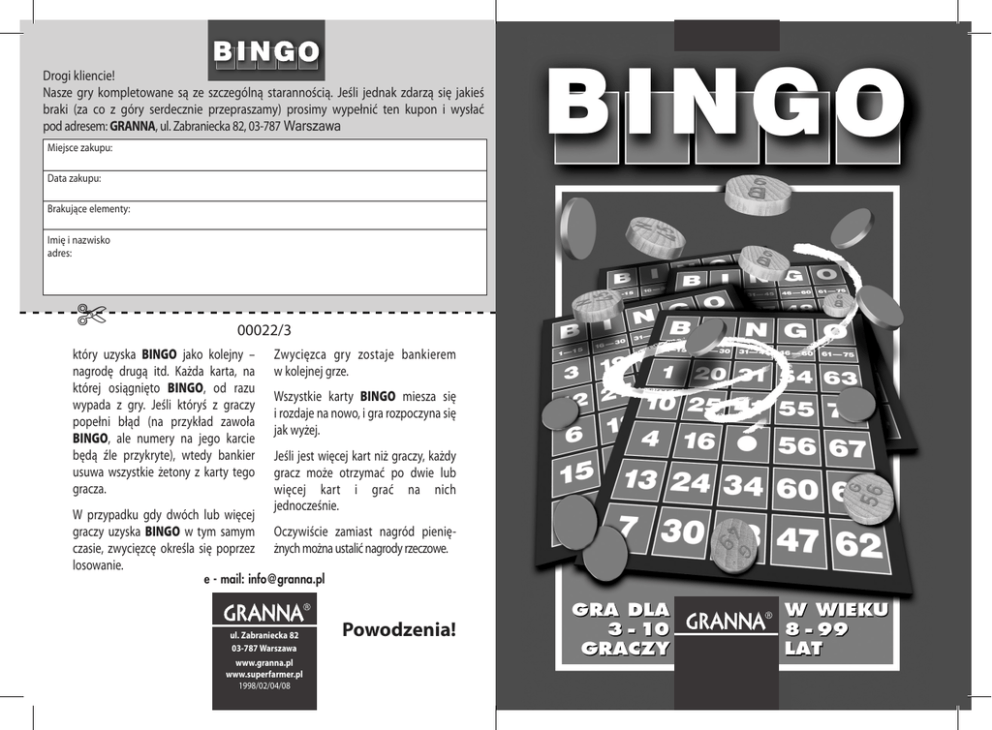 Drogi kliencie! Nasze gry kompletowane są ze szczególną starannością. Jeśli jednak zdarzą się jakieś braki (za co z góry serdecznie przepraszamy) prosimy wypełnić ten kupon i wysłać pod adresem: GRANNA, ul. Zabraniecka 82, 03-787 Warszawa Miejsce zakupu: Data zakupu: Brakujące elementy: Imię i nazwisko adres: ✄ 00022/3 który uzyska BINGO jako kolejny – nagrodę drugą itd. Każda karta, na której osiągnięto BINGO, od razu wypada z gry. Jeśli któryś z graczy popełni błąd (na przykład zawoła BINGO, ale numery na jego karcie będą źle przykryte), wtedy bankier usuwa wszystkie żetony z karty tego gracza. W przypadku gdy dwóch lub więcej graczy uzyska BINGO w tym samym czasie, zwycięzcę określa się poprzez losowanie. Zwycięzca gry zostaje bankierem w kolejnej grze. Wszystkie karty BINGO miesza się i rozdaje na nowo, i gra rozpoczyna się jak wyżej. Jeśli jest więcej kart niż graczy, każdy gracz może otrzymać po dwie lub więcej kart i grać na nich jednocześnie. Oczywiście zamiast nagród pieniężnych można ustalić nagrody rzeczowe. e - mail: [email protected] ul. Zabraniecka 82 03-787 Warszawa www.granna.pl www.superfarmer.pl 1998/02/04/08 Powodzenia! I N S T R U K C J A Nagrody Zawartość pudełka: 1 plansza liczbowa dla bankiera 20 kart bingo 75 pionków z liczbami 200 żetonów instrukcja Reguły gry Na początku gry wybiera się bankiera. Bankier zarządza planszą liczbową i ponumerowanymi krążkami. Plansza liczbowa podzielona jest na 5 pionowych rzędów z liczbami od 1 do 75. Pięć rzędów oznaczono kolejno literami B, I, N, G, O. rząd rząd rząd rząd rząd B I N G O od góry do dołu umieszczone są liczby od 1 do 15 od góry do dołu umieszczone są liczby od 16 do 30 od góry do dołu umieszczone są liczby od 31 do 45 od góry do dołu umieszczone są liczby od 46 do 60 od góry do dołu umieszczone są liczby od 61 do 75. Każdy z graczy kupuje u bankiera taką samą liczbę kart. Cenę jednej karty gracze ustalają między sobą na początku. Zapłatę za kupione karty uiszcza się bankierowi. Całą kwotę, która wpłynęła ze sprzedaży kart, bankier dzieli na wygrane (pierwsza nagroda najwyższa, ostatnia najniższa). Przy dziesięciu graczach bankier ustala na przykład 5 wygranych o różnej wielkości, a pięciu ostatnich graczy nie dostaje żadnej wygranej. Oczywiście można podzielić całe wpływy na wszystkich graczy. Najlepiej, gdy wszyscy gracze przed rozpoczęciem gry ustalą z bankierem, ile nagród zostanie przyznanych. Żetony służące do zakrywania liczb na kartach bingo dostępne są do użytku dla wszystkich. Bankier z kolei miesza ponumerowane krążki, wyciąga po jednym i wywołuje na głos literę i numer krążka. B 12 Na przykład wyciąga krążek B 12; wszyscy gracze, którzy mają na którejś ze swych kart w rzędzie B liczbę 12, zakrywają tę liczbę żetonem. Gracze, którzy nie mają tej liczby na swojej karcie, czekają na wywołanie kolejnego numeru. Bankier kładzie krążek B 12, na numerze 12 w rzędzie B, na swojej planszy liczbowej. Gdy gracze są gotowi, bankier wyciąga kolejny numerowany krążek i wywołuje literę oraz numer krążka. Gracze, którzy mają go na swojej karcie, zakrywają go, a sam bankier również zakrywa numer na swojej planszy numerowanym krążkiem, który właśnie wyciągnął. Powtarza się to tak długo, aż któryś z graczy będzie miał zakryte na swojej karcie 5 kwadratów w rzędzie – pionowo, poziomo bądź ukośnie. Białe kółeczko Jeszcze przed rozpoczęciem wywoływania, każdy gracz zakrywa krążkiem wolny kwadrat, który znajduje się pośrodku karty. Kwadrat ten liczy się jak każdy zakryty kwadrat. Jeżeli gracz zakryje krążkami 5 kwadratów w rzędzie, pionowo, poziomo czy też ukośnie, woła BINGO!. Bankier sprawdza BINGO, wywołując z karty gracza rząd zakryty żetonami i kontroluje go z własną planszą liczbową. Jeśli numery się zgadzają, gracz, który jako pierwszy osiągnął BINGO, otrzymuje pierwszą nagrodę, gracz,
