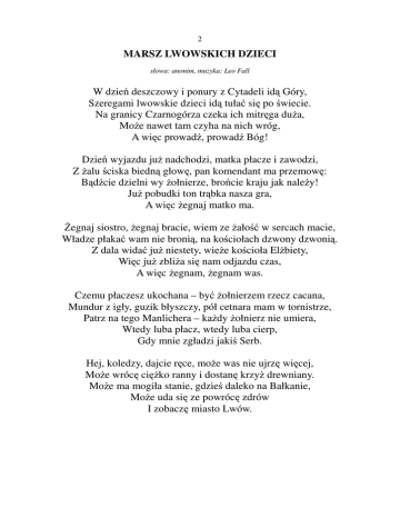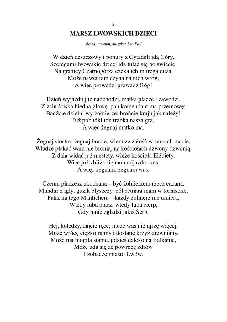 2 MARSZ LWOWSKICH DZIECI słowa: anonim, muzyka: Leo Fall W dzień deszczowy i ponury z Cytadeli idą Góry, Szeregami lwowskie dzieci idą tułać się po świecie. Na granicy Czarnogórza czeka ich mitręga duża, Może nawet tam czyha na nich wróg, A więc prowadź, prowadź Bóg! Dzień wyjazdu już nadchodzi, matka płacze i zawodzi, Z żalu ściska biedną głowę, pan komendant ma przemowę: Bądźcie dzielni wy żołnierze, brońcie kraju jak należy! Już pobudki ton trąbka nasza gra, A więc żegnaj matko ma. Żegnaj siostro, żegnaj bracie, wiem ze żałość w sercach macie, Władze płakać wam nie bronią, na kościołach dzwony dzwonią. Z dala widać już niestety, wieże kościoła Elżbiety, Więc już zbliża się nam odjazdu czas, A więc żegnam, żegnam was. Czemu płaczesz ukochana – być żołnierzem rzecz cacana, Mundur z igły, guzik błyszczy, pół cetnara mam w tornistrze, Patrz na tego Manlichera – każdy żołnierz nie umiera, Wtedy luba płacz, wtedy luba cierp, Gdy mnie zgładzi jakiś Serb. Hej, koledzy, dajcie ręce, może was nie ujrzę więcej, Może wrócę ciężko ranny i dostanę krzyż drewniany. Może ma mogiła stanie, gdzieś daleko na Bałkanie, Może uda się ze powrócę zdrów I zobaczę miasto Lwów.