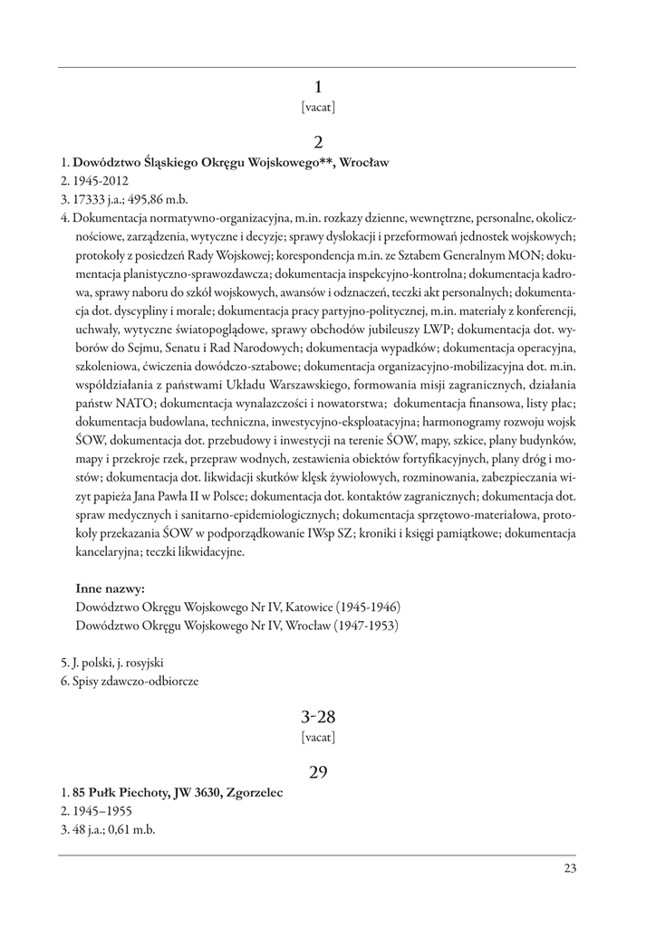 1 [vacat] 2 1. Dowództwo ŒlĊskiego Okręgu Wojskowego**, Wrocâaw 2. 1945-2012 3. 17333 j.a.; 495,86 m.b. 4. Dokumentacja normatywno-organizacyjna, m.in. rozkazy dzienne, wewnętrzne, personalne, okolicznościowe, zarządzenia, wytyczne i decyzje; sprawy dyslokacji i przeformowań jednostek wojskowych; protokoły z posiedzeń Rady Wojskowej; korespondencja m.in. ze Sztabem Generalnym MON; dokumentacja planistyczno-sprawozdawcza; dokumentacja inspekcyjno-kontrolna; dokumentacja kadrowa, sprawy naboru do szkół wojskowych, awansów i odznaczeń, teczki akt personalnych; dokumentacja dot. dyscypliny i morale; dokumentacja pracy partyjno-politycznej, m.in. materiały z konferencji, uchwały, wytyczne światopoglądowe, sprawy obchodów jubileuszy LWP; dokumentacja dot. wyborów do Sejmu, Senatu i Rad Narodowych; dokumentacja wypadków; dokumentacja operacyjna, szkoleniowa, ćwiczenia dowódczo-sztabowe; dokumentacja organizacyjno-mobilizacyjna dot. m.in. współdziałania z państwami Układu Warszawskiego, formowania misji zagranicznych, działania państw NATO; dokumentacja wynalazczości i nowatorstwa; dokumentacja finansowa, listy płac; dokumentacja budowlana, techniczna, inwestycyjno-eksploatacyjna; harmonogramy rozwoju wojsk ŚOW, dokumentacja dot. przebudowy i inwestycji na terenie ŚOW, mapy, szkice, plany budynków, mapy i przekroje rzek, przepraw wodnych, zestawienia obiektów fortyfikacyjnych, plany dróg i mostów; dokumentacja dot. likwidacji skutków klęsk żywiołowych, rozminowania, zabezpieczania wizyt papieża Jana Pawła II w Polsce; dokumentacja dot. kontaktów zagranicznych; dokumentacja dot. spraw medycznych i sanitarno-epidemiologicznych; dokumentacja sprzętowo-materiałowa, protokoły przekazania ŚOW w podporządkowanie IWsp SZ; kroniki i księgi pamiątkowe; dokumentacja kancelaryjna; teczki likwidacyjne. Inne nazwy: Dowództwo Okręgu Wojskowego Nr IV, Katowice (1945-1946) Dowództwo Okręgu Wojskowego Nr IV, Wrocław (1947-1953) 5. J. polski, j. rosyjski 6. Spisy zdawczo-odbiorcze 3-28 [vacat] 29 1. 85 Puâk Piechoty, JW 3630, Zgorzelec 2. 1945–1955 3. 48 j.a.; 0,61 m.b. 23 4. Rozkazy własne, rozkazy specjalne, rozkazy wyszkoleniowe, rozkazy oficerskie; teczki akt personalnych, skorowidze i księgi ewidencyjne; dokumentacja szkoleniowa; dokumentacja finansowa, listy płac. 5. J. polski 6. Spisy zdawczo-odbiorcze 30 1. 90 Puâk Piechoty, JW 3933, Zgorzelec 2. 1951–1955 3. 44 j.a.; 1,35 m.b. 4. Rozkazy dzienne, rozkazy i zarządzenia wyższych przełożonych, rozkazy oficerskie; dokumentacja planistyczno-sprawozdawcza; teczki akt personalnych, skorowidze i księgi ewidencyjne, księga etatowa, księga alfabetyczna; dokumentacja morale i dyscypliny; dokumentacja pracy partyjno-politycznej; dokumentacja operacyjna; dokumentacja szkoleniowa; dokumentacja finansowa, listy płac; dokumentacja kancelaryjna. 5. J. polski 6. Spisy zdawczo-odbiorcze 31 1. 96 Puâk Piechoty, JW 4186, Zgorzelec 2. 1954–1955 3. 24 j.a.; 0,37 m.b. 4. Teczki akt personalnych, skorowidze i księgi ewidencyjne, księga etatowa; dokumentacja szkoleniowa; dokumentacja finansowa, listy płac. 5. J. polski 6. Spisy zdawczo-odbiorcze 32 1. 114 Puâk Artylerii Lekkiej, JW 4200, Zgorzelec-Ujazd 2. 1951–1955 3. 25 j.a.; 0,59 m.b. 4. Dokumentacja kadrowa, teczki akt personalnych, skorowidze i książki ewidencyjne; dokumentacja pracy partyjno-politycznej; dokumentacja wyszkoleniowa; dokumentacja finansowa, listy płac. 5. J. polski 6. Spisy zdawczo-odbiorcze 33 1. 17 Dywizjon Artylerii Przeciwlotniczej, JW 5217, Zgorzelec 2. 1951–1956 3. 17 j.a.; 0,21 m.b. 4. Dokumentacja normatywno-organizacyjna; dokumentacja kadrowa, teczki akt personalnych, skorowidze i księgi ewidencyjne, książka obsady stanowisk etatowych; dokumentacja finansowa, listy płac. 24 5. J. polski 6. Spisy zdawczo-odbiorcze 34 1. 52 Dywizjon Artylerii Przeciwpancernej, JW 5129, Zgorzelec-Ujazd 2. 1951–1956 3. 7 j.a.; 0,20 m.b. 4. Książka ewidencyjna, książka alfabetyczna, książka etatowa; listy płac. 5. J. polski 6. Spisy zdawczo-odbiorcze 35 1. 32 Batalion áĊcznoœci, JW 3577, Zgorzelec 2. 1954–1955 3. 5 j.a.; 0,19 m.b. 4. Rozkazy dzienne; skorowidz i książka ewidencyjna; dokumentacja finansowa, listy płac; teczka likwidacyjna. 5. J. polski 6. Spisy zdawczo-odbiorcze 36 1. 65 Batalion Saperów, JW 3681, Zgorzelec 2. 1951–1956 3. 8 j.a.; 0,12 m.b. 4. Teczki akt personalnych, skorowidz i książka ewidencyjna; listy płac. 5. J. polski 6. Spisy zdawczo-odbiorcze 37 1. 11 Dywizja Artylerii Przeciwlotniczej, JW 3123, Brzeg 2. 1943–1963 3. 116 j.a.; 3,58 m.b. 4. Rozkazy dzienne, rozkazy i zarządzenia własne, rozkazy wyższych przełożonych, rozkazy personalne, dokumentacja normatywno-organizacyjna; kroniki; dokumentacja planistyczno-sprawozdawcza; dokumentacja inspekcyjno-kontrolna; dokumentacja kadrowa, teczki akt personalnych, księgi ewidencyjne, książka obsady stanowisk etatowych, książka etatowa; dokumentacja morale i dyscypliny; dokumentacja pracy partyjno-politycznej; dokumentacja operacyjna; dokumentacja szkoleniowa; dokumentacja wynalazczości i nowatorstwa; dokumentacja finansowa; dokumentacja sprzętowo-materiałowa; dokumentacja kancelaryjna; teczka likwidacyjna. 5. J. polski 6. Spisy zdawczo-odbiorcze 25 38 1. 62 Puâk Artylerii Lotniczej, JW 3655, Wrocâaw-Leœnica 2. 1952–1957 3. 36 j.a.; 1,11 m.b. 4. Dokumentacja planistyczno-sprawozdawcza; dokumentacja inspekcyjno-kontrolna; dokumentacja kadrowa, skorowidze i księgi ewidencyjne, księgi etatowe, książki alfabetyczne, książka obsady etatowej; dokumentacja morale i dyscypliny; dokumentacja pracy partyjno-politycznej; dokumentacja wypadków; dokumentacja operacyjna; dokumentacja finansowa, listy płac. 5. J. polski 6. Spisy zdawczo-odbiorcze 39 1. 69 Puâk Artylerii Przeciwlotniczej**, JW 3477, Leszno 2. [1949] 1951–1989 3. 874 j.a.; 16,44 m.b. 4. Rozkazy dzienne, rozkazy własne, rozkazy dowódcy, rozkazy garnizonowe, rozkaz