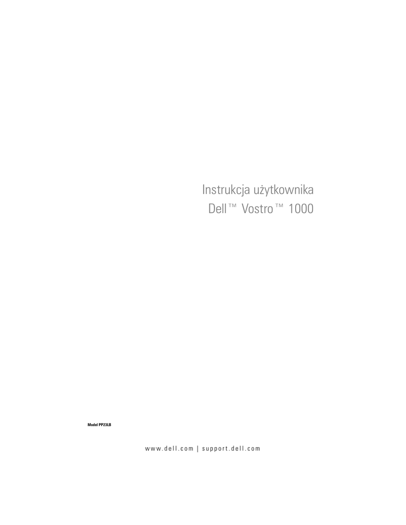 Instrukcja użytkownika Dell™ Vostro™ 1000 Model PP23LB w w w. d e l l . c o m | s u p p o r t . d e l l . c o m Uwagi, ostrzeżenia i przestrogi UWAGA: Napis UWAGA wskazuje na ważną informację, która pozwala lepiej wykorzystać posiadany system komputerowy. OSTRZEŻENIE: OSTRZEŻENIE wskazuje na możliwość uszkodzenia sprzętu lub utraty danych i informuje o sposobie uniknięcia problemu. PRZESTROGA: PRZESTROGA informuje o sytuacjach, w których występuje ryzyko uszkodzenia sprzętu, obrażeń lub śmierci. Skróty i akronimy Aby zapoznać się z kompletną listą skrótów i akronimów, patrz „Słownik” na stronie 197. ____________________ Informacje zawarte w tym dokumencie mogą ulec zmianie bez uprzedzenia. © 2007 Dell Inc. Wszelkie prawa zastrzeżone Kopiowanie zawartości niniejszego dokumentu w jakiejkolwiek formie bez pisemnej zgody firmy Dell Inc. jest ściśle zabronione. Znaki towarowe użyte w tekście: Dell, logo DELL, Vostro i Strike Zone są znakami towarowymi firmy Dell Inc.; Microsoft, Outlook, Vista i Windows są zarejestrowanymi znakami towarowymi firmy Microsoft Corporation; AMD, Sempron, Turion oraz wszystkie połączenia tych znaków są znakami towarowymi firmy Advanced Micro Devices, Inc.; ENERGY STAR jest zastrzeżonym znakiem towarowym Amerykańskiej Agencji Ochrony Środowiska (U.S. Environmental Protection Agency). Tekst może zawierać także inne znaki towarowe i nazwy towarowe, odnoszące się do podmiotów posiadających prawa do tych znaków i nazw lub do ich produktów. Firma Dell. nie rości sobie praw własności do marek i nazw towarowych innych niż jej własne. Model PP23LB Październik 2007 Nr ref. CR463 Wersja A01 Spis treści 1 Wyszukiwanie informacji . . . . . . . . . . . . . . . . . 13 2 Informacje o komputerze . . . . . . . . . . . . . . . . . 21 Określanie konfiguracji komputera Widok z przodu . . . . . . . . . . . . . . . 21 . . . . . . . . . . . . . . . . . . . . . . . . . 22 Widok z lewej strony . . . . . . . . . . . . . . . . . . . . . . Widok z prawej strony Widok od tyłu . . . . . . . . . . . . . . . . . . . . . 27 . . . . . . . . . . . . . . . . . . . . . . . . . . 29 Widok od spodu . 3 26 . . . . . . . . . . . . . . . . . . . . . . . . Przygotowywanie komputera do pracy Łączenie się z Internetem . . . . . . . . 33 . . . . . . . . . . . . . . . . . . . . 33 Konfigurowanie połączenia z Internetem . . . . . . . . . . . Przenoszenie informacji do nowego komputera . 33 . . . . . . . . 35 . . . . . . . . . . . . . . . . . . . . . . . . . . 36 40 . . . . . . . . . . . . . . . . . . . . . . 40 Microsoft® Windows® XP . . . . System Microsoft Windows Vista® Konfiguracja drukarki 31 Przewód drukarki . . . . Podłączanie drukarki USB . . . . . . . . . . . . . . . . . . . . . . . . . . . . . . . . . . . . Urządzenia zabezpieczające zasilanie . Zabezpieczenia antyprzepięciowe Filtry przeciwprzepięciowe . . . . Zasilacze bezprzerwowe (UPS) . . 40 40 . . . . . . . . . . . . . 42 . . . . . . . . . . . . . . 42 42 42 . . . . . . . . . . . . . . . . . . . . . . . . . . . . Spis tresci 3 4 Korzystanie z wyświetlacza . Regulacja jaskrawości . . . . . . . . . . . . . . . 45 . . . . . . . . . . . . . . . . . . . . . 45 Korzystanie z projektora . . . . . . . . . . . . . . . . . . . . . . . . . . . . . 45 . . . . . . . . . . . . . . . . . 46 46 Wyostrzanie lub powiększanie tekstu i obrazów Microsoft® Windows® XP System Windows Vista® . . . . . . . . . . . . . . . . . . Jednoczesne używanie monitora i wyświetlaczakomputera . . . . . Microsoft® Windows® XP . System Windows Vista® . . . . . . . . . . . . . . . . 47 . . . . . . . . . . . . . . . . . 47 48 . . . . . . . . . . . . . . . . . Używanie monitora jako głównego wyświetlacza . . . . . . . . 49 . . . . . . . . . . . . . . . System Windows Vista . . . . . . . . . . . . . . . . . . . . . . 49 49 System Microsoft Windows XP Używanie programu Catalyst® Control Center . . . . . . . . . Uruchamianie programu Catalyst Control Center 5 . . . . . . . Korzystanie z klawiatury i panelu dotykowego . Kombinacje klawiszy . . . . . . . . . . . . . . . . . . . . . 53 . . . . . . . . . . . . . . . . . . . . . . 54 . . . . . . . . . . . . . . . . . . . . . . . . . . . . . . . . . . . . . . . . . . . . . . . . . . . . . . 54 54 54 54 54 55 . . . . . . . . . 55 55 . . . . . . . . . . . . . . . . . . . . . . . . . 56 Dostosowywanie panelu dotykowego Spis tresci 50 53 Funkcje systemowe . . . . . . . . . . . . Akumulator . . . . . . . . . . . . . . . . Szuflada napędu CD lub DVD . . . . . . . . Funkcje wyświetlania . . . . . . . . . . . Zarządzanie energią . . . . . . . . . . . . Funkcje głośników . . . . . . . . . . . . . Funkcje klawisza z logo systemu Microsoft® Windows® . . . . . . . . . . . . . . . . Dostosowywanie ustawień klawiatury . . . Panel dotykowy 50 . . . Klawiatura numeryczna 4 45 . . . . . . . . . . . . . . . . . . . . . 57 6 Korzystanie z akumulatora Wydajność akumulatora . . . . . . . . . . . . . . . . . 59 . . . . . . . . . . . . . . . . . . . . 59 Sprawdzanie stanu naładowania akumulatora . . . . . . . . . Miernik akumulatora programu Dell™QuickSet . . Miernik energii w systemie Microsoft Windows® Miernik naładowania . . . . . . . . . . . . . . . Ostrzeżenie dotyczące rozładowania akumulatora . Oszczędzanie energii akumulatora . . . . . . . . . . . . . . . . . . . . . 62 . . . . . . . . . . . . Tryby zarządzania energią . . . . . . . . . . . . . Konfigurowanie ustawień zarządzania energią . . . Uzyskiwanie dostępu do właściwości opcji zasilania . . . . . 62 64 64 . . . . . . . . . . . . . . . . . . . . 65 . . . . . . . . . . . . . . . . . . . . . 65 Ładowanie akumulatora . Wymiana akumulatora Przechowywanie akumulatora 7 . . . . . 66 . . . . . . . 67 . . . . . . . . . . . . . . . . . . . . . 67 . . . . . . . . . . . . . . . . . . . . . . 68 . . . . . . . . . . . . . . . . . . . . . . . . 69 Odtwarzanie CD i DVD . Regulacja gło