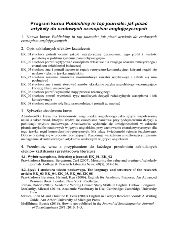 Program kursu Publishing in top journals: jak pisać artykuły do czołowych czasopism anglojęzycznych 1. Nazwa kursu: Publishing in top journals: jak pisać artykuły do czołowych czasopism anglojęzycznych 2. Opis zakładanych efektów kształcenia EK_01 słuchacz potrafi ocenić jakość merytoryczną czasopisma, jego profil i wartość punktową w polskim systemie parametryzacyjnym EK_02 słuchacz potrafi wytypować czasopisma właściwe dla swojego obszaru tematycznego i charakteru działalności badawczej EK_03 słuchacz zna i potrafi stosować reguły retoryczno-konstrukcyjne, którymi rządzi się naukowy tekst w języku angielskim EK_04 słuchacz rozumie znaczenie akademickiego rejestru językowego i potrafi się nim posługiwać EK_05 słuchacz zna i umie stosować zasoby leksykalne języka angielskiego wspomagające kohezję tekstu naukowego EK_06 słuchacz potrafi wymienić etapy procesu recenzyjnego EK_07 słuchacz potrafi wymienić typy możliwych decyzji redakcyjnych czasopisma i ich konsekwencje EK_08 słuchacz rozumie rolę listu przewodniego i potrafi go napisać 3. Sylwetka absolwenta kursu Absolwent/ka kursu ma świadomość wagi języka angielskiego jako języka współczesnej nauki a także zasad, którymi rządzą się czasopisma naukowe przy podejmowaniu decyzji o publikacji artykułu naukowego. Absolwent/ka wykazuje się umiejętnościami w zakresie pisania artykułów naukowych w języku angielskim, przy zachowaniu charakterystycznych dla tego języka reguł konstrukcyjno-retorycznych. Ma także świadomość rejestru językowego. Dobrze orientuje się w procesie recenzyjnym. Dysponuje warsztatem umożliwiającym pisanie nienagannie skonstruowanych artykułów naukowych w języku angielskim. 4. Przedmioty wraz z przypisaniem do każdego przedmiotu zakładanych efektów kształcenia i przykładową literaturą 4.1. Wybór czasopisma. Selecting a journal: EK_01, EK_02 Przykładowa literatura: Bergstrom, Carl (2007). Measuring the value and prestige of scholarly journals. College & Research Libraries News, 68(5), 314-316. 4.2. Język i struktura tekstu naukowego. The language and structure of the research article: EK_03, EK_04, EK_05, EK_06, EK_08 Przykładowa literatura: Hyland, Ken (2006). English for Academic Purposes: An Advanced Resource Book. London, New York: Routledge. Jordan, Robert (2010). Academic Writing Course: Study Skills in English. Harlow: Longman. McCarthy, Michael (2014). Academic Vocabulary in Use. Cambridge: Cambridge University Press. Swales, John M. and Christine B. Feak (2000). English in Today's Research World: A Writing Guide. Ann Arbor: University of Michigan Press. McElhinny, Bonnie (2016). How to get published in the Journal of Sociolinguistics. Journal of Sociolinguistics 20/1, 2016: 3–5. 4.3. Proces recenzyjny. The review process: EK_06, EK_07, EK_08 Przykładowa literatura: Feamster, Nick (2013). The paper reviewing http://greatresearch.org/2013/10/18/the-paper-reviewing-process/ 5. Określenie formy końcowego wyniku zakończenia kursu dokształcającego i process. uzyskania Warunkiem ukończenia kursu jest uzyskanie zaliczenia ze wszystkich przedmiotów. 6. Plan kursu Lp. 1. 2. Nazwa przedmiotu Wybór czasopisma. Selecting a journal Język i struktura artykułu naukowego The language and structure of the research article 3. Proces recenzyjny The review process Razem Wykład interaktywny (liczba godzin) 2 Ćwiczenia (liczba godzin) 32 4 6 Forma zaliczenia Aktywny udział Aktywny udział, mini-projekty Aktywny udział 32