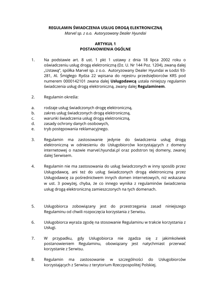 REGULAMIN ŚWIADCZENIA USŁUG DROGĄ ELEKTRONICZNĄ Marvel sp. z o.o. Autoryzowany Dealer Hyundai ARTYKUŁ 1 POSTANOWIENIA OGÓLNE 1. Na podstawie art. 8 ust. 1 pkt 1 ustawy z dnia 18 lipca 2002 roku o oświadczeniu usług drogą elektroniczną (Dz. U. Nr 144 Poz. 1204), zwaną dalej „Ustawą”, spółka Marvel sp. z o.o. Autoryzowany Dealer Hyundai w Łodzi 93281, Al. Śmigłego Rydza 22 wpisana do rejestru przedsiębiorców KRS pod numerem 0000142101 zwana dalej Usługodawcą ustala niniejszy regulamin świadczenia usług drogą elektroniczną, zwany dalej Regulaminem. 2. Regulamin określa: a. b. c. d. e. rodzaje usług świadczonych drogę elektroniczną, zakres usług świadczonych drogą elektroniczną, warunki świadczenia usług drogą elektroniczną, zasady ochrony danych osobowych, tryb postępowania reklamacyjnego. 3. Regulamin ma zastosowanie jedynie do świadczenia usług drogą elektroniczną w odniesieniu do Usługobiorców korzystających z domeny internetowej o nazwie marvel.hyundai.pl oraz podstron tej domeny, zwanej dalej Serwisem. 4. Regulamin nie ma zastosowania do usług świadczonych w inny sposób przez Usługodawcę, ani też do usług świadczonych drogą elektroniczną przez Usługodawcę za pośrednictwem innych domen internetowych, niż wskazana w ust. 3 powyżej, chyba, że co innego wynika z regulaminów świadczenia usług drogą elektroniczną zamieszczonych na tych domenach. 5. Usługobiorca zobowiązany jest do przestrzegania Regulaminu od chwili rozpoczęcia korzystania z Serwisu. 6. Usługobiorca wyraża zgodę na stosowanie Regulaminu w trakcie korzystania z Usługi. 7. W przypadku, gdy Usługobiorca nie zgadza się z jakimkolwiek postanowieniem Regulaminu, obowiązany jest natychmiast przerwać korzystanie z Serwisu. 8. Regulamin ma zastosowanie w szczególności do Usługobiorców korzystających z Serwisu z terytorium Rzeczpospolitej Polskiej. zasad niniejszego ARTYKUŁ 2 DEFINICJE Użyte w Regulaminie zwroty oznaczają: 1. Usługodawca – spółka działająca pod Marvel sp. z o.o. z siedzibą w Łodzi, wpisana do rejestru przedsiębiorców Krajowego Rejestru Sądowego pod numerem 0000142101 świadcząca usługi drogą elektroniczną z wykorzystaniem Serwisu. 2. Usługobiorca – każda osoba fizyczna, prawna bądź jednostka organizacyjna nieposiadającą osobowości prawnej, która korzysta z usługi świadczonej przez Usługodawcę z wykorzystaniem Serwisu. 3. Adres Poczty Elektronicznej – oznaczenie systemu teleinformatycznego umożliwiającego porozumiewanie się za pomocą poczty elektronicznej (e-mail), 4. System Teleinformatyczny – zespół współpracujących ze sobą urządzeń informatycznych i oprogramowania, zapewniający przetwarzanie i przechowywanie, także wysyłanie i odbieranie danych przez sieci telekomunikacyjne za pomocą właściwego dla danego rodzaju sieci urządzenia końcowego w rozumieniu przepisów Prawa telekomunikacyjnego. 5. Usługa – usługa świadczona drogą elektroniczną w rozumieniu przepisów Ustawy, przez Usługodawcę. ARTYKUŁ 3 ROZPOCZĘCIE I ZAKOŃCZENIE KORZYSTANIA Z USŁUGI 1. Usługobiorca rozpoczyna korzystanie z Usługi z chwilą rozpoczęcia odbierania danych dostarczanych przez Usługodawcę za pomocą Serwisu. 2. Natychmiast po wyświetleniu się strony głównej Serwisu na monitorze Usługobiorcy, Usługobiorca powinien zapoznać się z treścią Regulaminu, do którego dostęp możliwy jest przy użyciu odpowiedniego odnośnika (linku). 3. Usługobiorca kończy korzystanie z Usługi wraz z zakończeniem odbierania danych dostarczanych przez Usługodawcę za pomocą Serwisu, chyba, że korzysta z usługi „Zapytanie o broszurę”. 4. Usługobiorca może w każdej, dowolnie obranej przez siebie chwili zakończyć korzystanie z Usługi. ARTYKUŁ 4 RODZAJE I ZAKRES USŁUG. 1. W ramach korzystania z Serwisu Usługodawca świadczy następujące usługi: (i) Usługi Informacyjne - polegające na udostępnieniu na indywidualne żądanie Usługobiorcy danych znajdujących się w Serwisie w ten sposób, iż następuje ich wyświetlenie w formie przygotowanej przez Usługodawcę i przetworzonej przez system komputerowy Usługobiorcy, a także zapisaniu tych danych na dysku twardym lub innych nośnikach Usługobiorcy, a dotyczących w szczególności: (a) informacji o produktach, w tym modelach samochodów, wersjach wyposażania, cenach, promocjach, danych technicznych, (b) informacji o usługach serwisowych oferowanych przez Usługodawcę w miejscu prowadzenia działalności, (c) informacji o produktach finansowych i ubezpieczeniowych oferowanych nabywcom samochodów Hyundai, (d) informacji o głównych zasadach gwarancji, (e) informacji o dostępnych akcesoriach do samochodów, (f) informacji o działalności Usługodawcy, (g) informacji o dostępnych do nabycia samochodach używanych w ramach programu Hyundai i-BEST, (ii) Zapytanie o ofertę – umożliwienie nawiązania kontaktu między Usługobiorcą a Usługodawcą w celu prezentacji Usługobiorcy informacji o możliwości nabycia samochodu marki Hyundai, (iii) Jazda Testowa (Jazda Próbna) – umożliwienie nawiązania kontaktu między Usługobiorcą a Usługodawcą w celu umożliwienia obydwu tym podmiotom ustalenia czasu i miejsca odbycia przez Usługobiorcę jazdy testowej (próbnej) dostępnym samochodem marki Hyundai, (iv) Zapytanie o broszurę - udostępnienie Usługobiorcy, na jego życzenie, możliwości pobrania z Serwisu broszury (katalogu) z wykorzystaniem unikalnego linku wygenerowanego na skutek zapytania Usługobiorcy i przesłanego mu na Adres Poczty Elektronicznej. (v) Konfigurator - umożliwienie Usługobiorcy w ramach wyboru spośród dostępnych w Serwisie opcji preferowanej przez Usługobiorcę konfiguracji samochodu, w tym dobrania rodzaju silnika, wyposażenia dodatkowego, skorzystania z dostępnych akcji promocyjnych, akcesoriów, (vi) Kontakt – umożliwienie Usługobiorcy przesłania Usługodawcy wiadomości z 