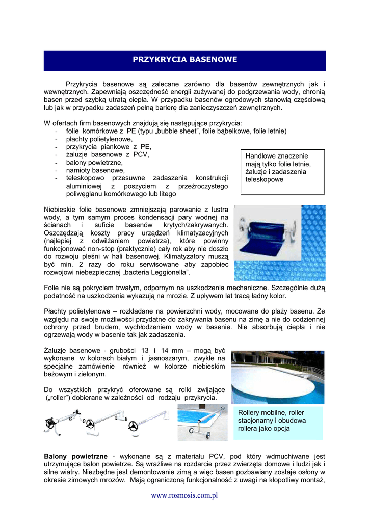 PRZYKRYCIA BASENOWE Przykrycia basenowe są zalecane zarówno dla basenów zewnętrznych jak i wewnętrznych. Zapewniają oszczędność energii zuŜywanej do podgrzewania wody, chronią basen przed szybką utratą ciepła. W przypadku basenów ogrodowych stanowią częściową lub jak w przypadku zadaszeń pełną barierę dla zanieczyszczeń zewnętrznych. W ofertach firm basenowych znajdują się następujące przykrycia: - folie komórkowe z PE (typu „bubble sheet”, folie bąbelkowe, folie letnie) - płachty polietylenowe, - przykrycia piankowe z PE, - Ŝaluzje basenowe z PCV, Handlowe znaczenie - balony powietrzne, mają tylko folie letnie, - namioty basenowe, Ŝaluzje i zadaszenia - teleskopowo przesuwne zadaszenia konstrukcji teleskopowe aluminiowej z poszyciem z przeźroczystego poliwęglanu komórkowego lub litego Niebieskie folie basenowe zmniejszają parowanie z lustra wody, a tym samym proces kondensacji pary wodnej na ścianach i suficie basenów krytych/zakrywanych. Oszczędzają koszty pracy urządzeń klimatyzacyjnych (najlepiej z odwilŜaniem powietrza), które powinny funkcjonować non-stop (praktycznie) cały rok aby nie doszło do rozwoju pleśni w hali basenowej. Klimatyzatory muszą być min. 2 razy do roku serwisowane aby zapobiec rozwojowi niebezpiecznej „bacteria Leggionella”. Folie nie są pokryciem trwałym, odpornym na uszkodzenia mechaniczne. Szczególnie duŜą podatność na uszkodzenia wykazują na mrozie. Z upływem lat tracą ładny kolor. Płachty polietylenowe – rozkładane na powierzchni wody, mocowane do plaŜy basenu. Ze względu na swoje moŜliwości przydatne do zakrywania basenu na zimę a nie do codziennej ochrony przed brudem, wychłodzeniem wody w basenie. Nie absorbują ciepła i nie ogrzewają wody w basenie tak jak zadaszenia. śaluzje basenowe - grubości 13 i 14 mm – mogą być wykonane w kolorach białym i jasnoszarym, zwykle na specjalne zamówienie równieŜ w kolorze niebieskim beŜowym i zielonym. Do wszystkich przykryć oferowane są rolki zwijające („roller”) dobierane w zaleŜności od rodzaju przykrycia. Rollery mobilne, roller stacjonarny i obudowa rollera jako opcja Balony powietrzne - wykonane są z materiału PCV, pod który wdmuchiwane jest utrzymujące balon powietrze. Są wraŜliwe na rozdarcie przez zwierzęta domowe i ludzi jak i silne wiatry. Niezbędne jest demontowanie zimą a więc basen pozbawiany zostaje osłony w okresie zimowych mrozów. Mają ograniczoną funkcjonalność z uwagi na kłopotliwy montaŜ, www.rosmosis.com.pl demontaŜ i przechowywanie. W słoneczne dni temperatura osiąga ponad 400C a wentylowanie jest nie moŜliwe, demontaŜ w okresie ładnej pogody a montaŜ w dni i noce chłodne jest uciąŜliwy. Namioty basenowe – przeźroczysta płachta namiotowa na stelaŜu aluminiowym zwykle z wózkami jezdnymi. Jest to uproszczona materiałowo wersja zadaszeń basenów wykonywanych z materiałów trwałych i eleganckich. Teleskopowo przesuwne segmentowe zadaszenia stanowią najlepszą i najbardziej funkcjonalną ochronę basenu przed zanieczyszczeniami zewnętrznymi i niekontrolowanym dostępem dzieci i zwierząt domowych, wytwarzając „efekt szklarniowy” nagrzewają wodę basenową i atmosferę pod zadaszeniem promieniami słońca, posiadając bardzo dobry współczynnik izolacji termicznej chronią wodę przed szybkim ubytkiem akumulowanego w niej ciepła, przed nocnymi spadkami temperatury wody, przedłuŜają sezon korzystania z wody ogrzewanej wyłącznie naturalnym źródłem energii słonecznej o kilkanaście tygodni. Stosując dodatkowo - w celu ograniczenia parowania wody - choćby bąbelkową folię komórkową a takŜe pracującą tylko podczas kąpieli domowników nagrzewnicę powietrza (o dowolnym źródle grzania) basen z podgrzewaną wodą moŜe słuŜyć do kąpieli równieŜ zimą. Zadaszenie jest całkowicie odporne na wilgoć, mróz, promieniowanie słoneczne, prawidłowa konstrukcja uwzględnia dylatacje niezbędne przy zmiany rozmiarów poszycia pod wpływem promieniowania słońca oraz odprowadzenie wody kondensacyjnej z komórek konstrukcji co nie pozwalaj na rozwój glonów w strukturze. Przy okresowym uruchamianiu filtracji, woda w basenie nie zamarza nawet w największe mrozy a wczesną, słoneczną wiosną temperatura wody w dzień podnosi się nawet o 2 0C (nocą jej spadek jest eliminowany). www.rosmosis.com.pl
