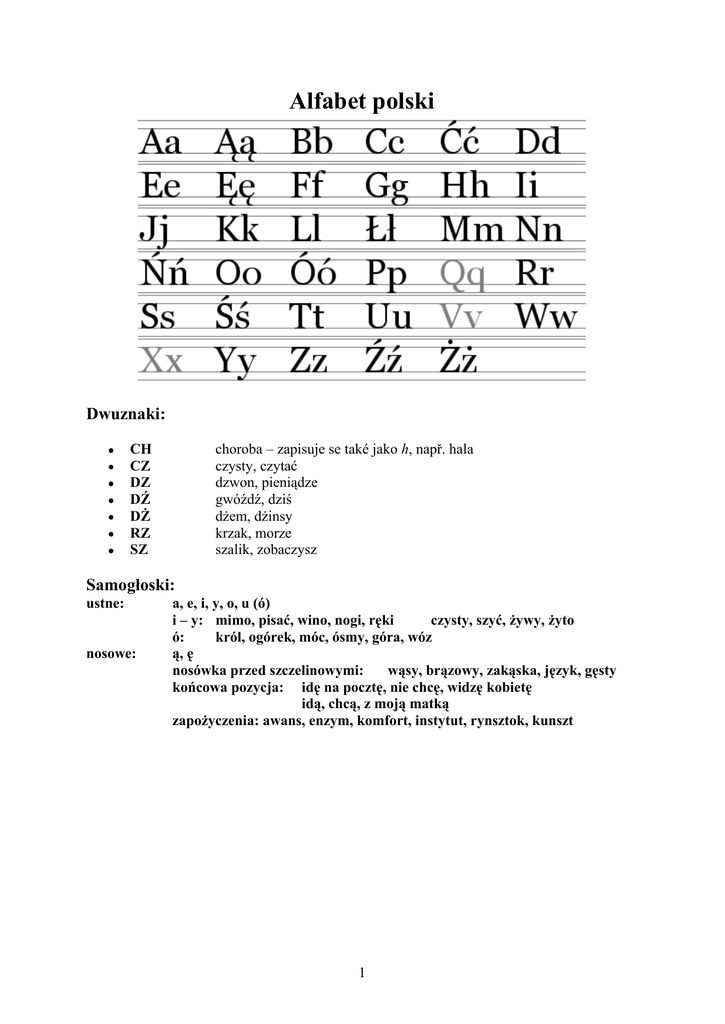 Alfabet polski Dwuznaki: CH CZ DZ DŹ DŻ RZ SZ choroba – zapisuje se také jako h, např. hala czysty, czytać dzwon, pieniądze gwóźdź, dziś dżem, dżinsy krzak, morze szalik, zobaczysz Samogłoski: ustne: nosowe: a, e, i, y, o, u (ó) i – y: mimo, pisać, wino, nogi, ręki czysty, szyć, żywy, żyto ó: król, ogórek, móc, ósmy, góra, wóz ą, ę nosówka przed szczelinowymi: wąsy, brązowy, zakąska, język, gęsty końcowa pozycja: idę na pocztę, nie chcę, widzę kobietę idą, chcą, z moją matką zapożyczenia: awans, enzym, komfort, instytut, rynsztok, kunszt 1 Wymowa nosówek: Pozycja przed: p, b t, d, c, dz, cz ć, dź k, g s, z, sz, ż, ś, ź, (f), w, ch, (h) ę ą -emtępy, zęby -enskręt, pęd, ręce, międzynarodowy, klęczeć -eńpięć, krawędź -eŋręka, łęg -ęmęski, język, węszyć, węże, część, więzień, węch -omząb, trąba -onkąt, prąd, idący. urządzenie, wyłączyć -ońciągnąć, sądzić -oŋmąka, naciągać -ąwąs, brązowy, Zbąszyń, dążyć, przekąsić, gałąź, wąchać -owziął -ą idą, matką l, ł -ewzięli, wzięła -e (-ę) idę, matkę wygłos Spółgłoski: h ł handel, hamulec, inhalacja łaska, łódka, łuk, płeć, chłop ś (si) ź (zi) ć (ci) dź (dzi) ń (ni) nagłos, wygłos, ś + K światło, śmierć, uśmiech źrenica, źródło, wyraźny ćma, ćwierć, robić dźwięk, dźwig, niedźwiedź koń, broń, końcowy rz nagłos: między samogłoskami: po dźwięcznych: przed dźwięcznymi: wygłos: po bezdźwięcznych: przed bezdźwięcznymi: ś+I+K siwy, silny zima, nizina cicho, ciskać dziś, dziwny niski, nikt ś+I+V sierpień, siewny ziemia, zioło ciemny, ciało dzień, działać nieść, niania ž: rzecz, rzadki ž: morze, wierzyć ž: drzewo, grzech ž: drzwi, grzbiet š: malarz, korytarz š: krzyk, przeszkadzać š: gorzki, krzepki Akcent: akcent na 3. sylabie od końca: – formy 1. i 2. osoby liczby mnogiej czasu przeszłego, np. ro–bi-liś–my, czy–ta–liś–cie – formy liczby pojedynczej oraz 3. osoby liczby mnogiej trybu przypuszczającego, zro–bił–bym, czy–tał–by, zro–bi–li–by – formy liczebników od 400 do 900, czte–ry–sta, pię–ciu–set, o–siem–set 2 – zapożyczenia, zwłaszcza zakończone na -yka, -ika, np. fi–zy–ka, gra–ma–ty–ka, ma– te–ma–ty–ka, kro–ni–ka, re–pu–bli–ka akcent na 4. sylabie od końca: – formy 1. i 2. osoby liczby mnogiej trybu przypuszczającego, zro-bi-li-byś-my, czy-tali-byś-cie ą, ę Gęsty, wąski, brązowy, wąwóz, kubek z wodą, idą z matką, talerz z zupą, idę na pocztę, jadę z panią Marią, oni mówią z nauczycielką, ząb, zęby, tępy, imię, bęben, gęś, chęć, głęboki, skąpy, postęp, kąt, początek, zajęty, gorący, prędko, wąchać, skąd, rączka, pęczek, pączek, sędzia, minąć, zamknąć, potęga, łąka, pstrąg, tęgi, stanęła, przysnęła, zaczęli, rozpoczął, minął. grupy samogłoskowe Geografia, Portugalia, fotografia, naiwny, historia, zaimek, lilia, linia, Austria, armia, roić się, boisz się, na szyi, Szwajcaria, Japonia. h Halina, Hindus, Henryk, herbata, hodować, hala, hokej, hotel, hrabia, humor, ohyda, Sahara, rehabilitacja, huta. ł Ładunek, ława, łowca, łódka, łydka, łza, chłodny, dosłowny, kłamstwo, ołówek, płyta, spłonąć, upał, łuk, władza, małpa, gołąb, mały. Środkowojęzykowe: Jesień, najeźdźca, kilometr, siedmiolatek, gwoździk, dzisiaj, dzięcioł, dzieciństwo, siedzący, jakość, ludność, gips, siewny, oziębiać, cielesny, dwieście, kisiel, ciągłość, sierota, ciasto, zielnik, ciśnienie, sieć, kiść, siedziba, kilogram, sielski, cukier, śmierć, ciążenie, kitka, Giewont, świadomość, ciecz, śledź, środek, ciąża, ślepy, ośmiornica, siekać, klosik, zielony, macierz, ciągnik, Kielce, zimny, ginięcie, dziura, niedźwiedź, siedmiodniowy, kimono, ćwierć, średni, kwiecień, cielęcina, siekiera, kielich, październik, niedziela, obudzić, sierpień, dzikus, jezioro, ziemia, sienny, ziarno, cień, siedlisko, ziele, ciało, magiel, kisić, ciełęcina, rozcieńczalnik, bodziec, nieść, cichy, śpiewać, cielęcina, dziecko. 3 Przedniojęzykowo-dziąsłowe: Szary, budżet, czeszczyzna, chrząszcz, oczyszczalnia, francuszczyzna, zwłaszcza, sczeznąć, włoszczyzna, szarża, czynsz, szantaż, Szczebrzeszyn, czerwczyk, chrabąszcz, szczyt, szczupak, Dżakarta, drżący, szczelina, szczebel, futrzany, szczypiorek, szczoteczka, wczasowicz, sczyszczony, zużyty, szaszłyk, szybkostrzelny, sczernieć, częściowy, uszkodzenie, skrzydło, wjeżdżać, chrząstka, drożdże, Tadżykistan, dżungla. Przystanek, rzeczpospolita, rzeczownik, trzaskać, wyrzut, sprzedaż, skrzypce, zrzeszenie, narzeczona, marzyciel, chrzan, przód, przychodnia, grzmot, cukrzyca, skrzydło, krzak, skrzyżowanie, krzesło, mistrz, sprzedaż, rzut, przebój, urząd, drzewo, przyjemny, przymiotnik, kołnierz, futrzany, grzecznie. Zmiękczone: Piast, piana, Białystok, klimat, diabetyk, piramida, wiek, bitwa, miasto, lipiec, aria, pies, filozofia, wigilia, hiacynt, kobieta, widok, oficer, Monachium, biuletyn, biuro, Halina, telewidz, miedza, piołun, liana. Sonora w grupie spółgłoskowej w wyglosie: Żubr, kadr, piosnka, teatr, latorośl, baśń, wiatr, umysł, rytm, blizn. Ten słoń nazywa się Bombi. Ma trąbę, lecz na niej nie trąbi. Dlaczego? Nie bądź ciekawy! To jego prywatne sprawy. Czarna krowa w kropki bordo gryzła trawę, kręcąc mordą. Kręcąc mordą i rogami gryzła trawę wraz z jaskrami. Papużko, papużko, Powiedz mi coś na uszko. Nic ci nie powiem, boś ty plotkarz, Powtórzysz każdemu, kogo spotkasz. Mężczyźni wyginęli. od biedy można jeszcze znaleźć męża, ale mężczyzna mający czas dla kobiety i pragnący z nią rozmawiać przestał istnieć. Kobiety wierzą, że ubierają się dla mężczyzn, ale naprawdę ubierają się dla kobiet, żeby wprawić się nawzajem w zdziwie