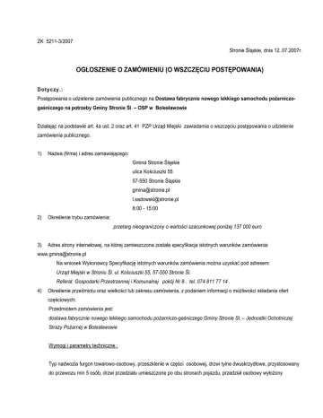 ZK 5211-3/2007 Stronie Śląskie, dnia 12..07.2007r. OGŁOSZENIE O ZAMÓWIENIU (O WSZCZĘCIU POSTĘPOWANIA) Dotyczy.: Postępowania o udzielenie zamówienia publicznego na Dostawa fabrycznie nowego lekkiego samochodu poŜarniczogaśniczego na potrzeby Gminy Stronie Śl. – OSP w Bolesławowie Działając na podstawie art. 4a ust. 2 oraz art. 41 PZP Urząd Miejski zawiadamia o wszczęciu postępowania o udzielenie zamówienia publicznego. 1) Nazwa (firma) i adres zamawiającego: Gmina Stronie Śląskie ulica Kościuszki 55 57-550 Stronie Śląskie [email protected] [email protected] 8:00 - 15:00 2) Określenie trybu zamówienia: przetarg nieograniczony o wartości szacunkowej poniŜej 137 000 euro 3) Adres strony internetowej, na której zamieszczona została specyfikacja istotnych warunków zamówienia: [email protected] Na wniosek Wykonawcy Specyfikację istotnych warunków zamówienia moŜna uzyskać pod adresem: Urząd Miejski w Stroniu Śl. ul. Kościuszki 55, 57-550 Stronie Śl. Referat Gospodarki Przestrzennej i Komunalnej pokój Nr 8 . tel. 074 811 77 14 . 4) Określenie przedmiotu oraz wielkości lub zakresu zamówienia, z podaniem informacji o moŜliwości składania ofert częściowych: Przedmiotem zamówienia jest: dostawa fabrycznie nowego lekkiego samochodu poŜarniczo-gaśniczego Gminy Stronie Sl. – Jednostki Ochotniczej StraŜy PoŜarnej w Bolesławowie Wymogi i parametry techniczne : Typ nadwozia furgon towarowo-osobowy, przeszklenie w części osobowej, drzwi tylne dwuskrzydłowe, przystosowany do przewozu min 5 osób, drzwi przedziału umieszczone po obu stronach pojazdu, przedział osobowy wyłoŜony tapicerką i podsufitką. Silnik: wysokopręŜny, doładowany o mocy min. 70 KW Napęd: przedni Kolor pojazdu: Czerwony ze zwyczajowym/standardowym oznakowaniem i osygnalizowaniem cechującym samochody poŜarnicze. Typ nadwozia furgon towarowo-osobowy, przeszklenie w części osobowej Ładowność pojazdu min 1110 kg ( wraz z kierowcą i pasaŜerami) Objętość przedziału ładunkowego nie mniej niŜ 4,5 m3 Skrzynia biegów manualna 5-cio biegowa. Wykonawca w zakresie całego przedmiotu zamówienia zobowiązany będzie do udzielenia gwarancji: - mechanicznej na okres nie krótszy niŜ 3 lata - na powłokę lakierniczą na okres nie krótszy niŜ 5 lat - na perforacje karoserii na okres nie krótszy niŜ 5 lat. Wspólny Słownik Zamówień: kod CPV 34144210-3 5) Informacja o moŜliwości złoŜenia oferty wariantowej: Zamawiający dopuszcza moŜliwość składania ofert wariantowych 6) Termin wykonania zamówienia: do dnia 31.08.2007 7) Opis warunków udziału w postępowaniu oraz opis sposobu dokonywania oceny spełniania tych warunków: Wykonawcą moŜe być osoba fizyczna, osoba prawna lub jednostka organizacyjna nie posiadająca osobowości prawnej oraz podmioty wspólne (konsorcjum , spółka cywilna) O udzielenie zamówienia mogą ubiegać się wykonawcy , którzy spełniają warunki określone w art. 22 ust 1 ustawy Prawo zamówień publicznych. Ocena spełnienia warunków dokonana zostanie zgodnie z formułą "spełnia", "nie spełnia" w oparciu o informacje zawarte w dokumentach i oświadczeniach Wykonawcy. Z treści załączonych oświadczeń i dokumentów musi wynikać jednoznacznie, iŜ warunek został spełniony. 8) Informacja na temat wadium: ---------------------------- 9) Kryteria oceny ofert i ich znaczenie: NAZWA KRYTERIUM WAGA CENA 100 10) miejsce i termin składania ofert: w siedzibie zamawiającego Urząd Miejski ulica Kościuszki 55 57-550 Stronie Śląskie Pokój nr 15 do dnia 27.07 .2007 r. do godz.10:00. 11) Adres strony internetowej, na której zamieszczona została specyfikacja istotnych warunków zamówienia: adres strony internetowej [email protected] 12) miejsce i termin otwarcia ofert: w siedzibie zamawiającego Urząd Miejski ulica Kościuszki 55 57-550 Stronie Śląskie Pokój 17 dnia 27.07.2007r. o godz. 10:00 13) Termin związania ofertą Wykonawca pozostaje związany ofertą przez okres 30 dni, tj. do dnia 27.08.2007 r. 14) informacje o zamiarze zawarcia umowy ramowej Nie przewiduje się zawarcia umowy ramowej 15) Informacje o zamiarze ustanowienia dynamicznego systemu zakupów wraz z adresem strony internetowej, na której będą zamieszczane dodatkowe informacje dotyczące dynamicznego systemu zakupów informacje o dynamicznym systemie zakupów ----------adres strony internetowej ----------16) informacje o przewidywanym wyborze najkorzystniejszej oferty z zastosowaniem aukcji elektronicznej wraz z adresem strony internetowej, na której będzie prowadzona aukcja elektroniczna nie stosuje się aukcji elektronicznej -------------- pieczęć podłuŜna o treści: Z up. BURMISTRZA mgr inŜ. Dariusz Chromiec Zastępca Burmistrza oraz nieczytelny podpis ___________________________