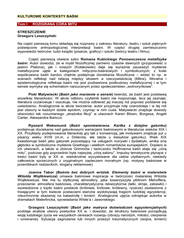 KULTUROWE KONTEKSTY BAŚNI Tom I ROZIGRANA CÓRA MITU STRESZCZENIE Grzegorz Leszczyński Na część pierwszą tomu składają się rozprawy z zakresu literatury, teatru i sztuk pięknych poświęcone antropologicznej interpretacji baśni. W części drugiej zamieszczono wypowiedzi twórców: ludzi książki (pisarze, graficy) i sztuki (twórcy teatru i filmu). Część pierwszą otwiera szkic Romana Kubickiego Ponowoczesna metafizyka baśni. Autor dowodzi, że w myśli filozoficznej zarówno czasów dawnych (przypowieść o jaskini Platona), jak i nowych (Kołakowski) daje się wyraźnie zauważyć myślenie metafizyczne ujęte w kategoriach mityczno-baśniowych i symbolicznych; z kolei współczesna baśń bardzo chętnie podejmuje dociekania filozoficzne – widać to np. w scenach refleksji nad relacją między słowem a rzeczywistością (Milne). Moralna i epistemologiczna refleksja baśni nie jest pozbawiona podbudowy metafizycznej i w tym sensie wymyka się schematom narzucanym przez społeczeństwo „wolnorynkowe”. Piotr Matywiecki (Baśń jako marzenie o sensie) twierdzi, że baśń jest podstawą wszelkiej literackości. W akcie odbioru czytelnik baśni nie rozpoznaje, lecz jej zaznaje; literatura oczarowuje i oszukuje, nie można odbierać jej inaczej niż poprzez poddanie się uwiedzeniu. Analogicznie w akcie tworzenia: autor przyjmuje rolę czarodzieja i w tej roli jest obecny w każdym dziele epickim, czyniąc w nim cuda. Matywiecki znajduje dowody obecności tak rozumianego „strażnika fikcji” w utworach Karen Blixen, Borgesa, Angeli Carter, Alessandra Baricco. Ryszard Waksmund (Baśń sponiewierana. Kartka z dziejów gatunku) podejmuje dociekania nad gatunkowymi wariacjami baśniowymi w literaturze wieków XIX i XX. Przykłady podejmowania literackiej gry tak z konwencją, jak motywami znajduje już u pisarzy wieku XVIII (m.in. u Diderota, ale także u klasyków gatunku). Wiek XIX kwestionuje baśń jako gatunek pozostający na usługach rozrywki i dydaktyki, wnika ona głęboko w symboliczne myślenie Goethego i wielkich romantyków europejskich. Dopiero w ich utworach, a także w zbiorze Grimmów i twórczości Hoffmanna baśń staje się „córą mitu”, podczas gdy poprzednio była najwyżej „córą salonu”. Impulsy tematyczne płynące z treści baśni były w XX w. wielokrotnie wyzyskiwane dla celów utylitarnych, niekiedy całkowicie sprzecznych z oryginalnym zapleczem moralnym (np. motywy baśniowe w przeróbkach radzieckich, slogany reklamowe). Joanna Tabor (Baśnie bez dobrych wróżek. Elementy baśni w malarstwie Witolda Wojtkiewicza) omawia baśniowe inspiracje w twórczości malarskiej Witolda Wojtkiewicza. Nie ma tu idyllicznej atmosfery, jaka towarzyszyła płótnom Mehoffera, przeciwnie: atmosfera baśniowa, charakterystyczna rekwizytornia (lalki, stroje, zabawki) i wywiedzione z topiki baśni postacie (królowie, królowe, królewny, rycerze) zestawione z trwającymi w tym świecie postaciami starców wydobywają tragizm ludzkiej egzystencji, nieuchronnie skazanej na katastrofę i śmierć. Analogiczne ujęcia odnajduje autorka w dramatach Materlincka, opowiadania Wilde’a i Jaworskiego. Grzegorz Leszczyński (Baśń jako matryca doświadczeń egzystencjalnych) poddaje analizie utwory poetyckie XX w. i dowodzi, że struktury baśniowe porządkują wizję ludzkiego życia we wszystkich okresach rozwoju (obrazy narodzin, miłości, cierpienia i umierania). Sytuacja zagrożenia lub innych przeżyć traumatycznych (wojna, śmierć) poprzez ewokowanie doświadczeń lektur i wyobrażeń dzieciństwa wyzwala oczywiste skojarzenia ze sferą baśniową, ona z kolei jest szansą przywrócenia porządku aksjologicznego i ocalenia człowieczeństwa. U podstaw obrazowania poetyckiego rozbuduje się równolegle pełna grozy i egzystencjalnego lęku baśń starego człowieka, bezbronnego w obliczu przemijania. Alicja Baluch (Odsłonić to, co ukryte, czyli od myszki do Myszki w różnych odmianach literatury fantastycznej) dowodzi, że baśnie, zwłaszcza w ich pierwotnej formie, odwołują się do wzorców archetypowych, w utworach nowoczesnych na różne sposoby przekształcanych. Problem ten omawia autorka na przykładzie dzieckaodmieńca, motywu obecnego w twórczości fantastycznej Roalda Dahla i Doroty Terakowskiej, a nawet w historii chorej dziewczynki opisanej w dokumentalnej książce Anny Sobolewskiej. We wszystkich przypadkach interwencje autorskie i przemiany motywu dokonują się zależnie od przyjętej konwencji gatunkowej, uruchamiają nowe znaczenia alegoryczne i symboliczne, ważne w procesie autoterapii czytelniczej. Joanna Papuzińska (Nowe tropy baśni) nazywa wiek XX „stuleciem baśniowym”; jej zdaniem konwencja baśni obecna jest nie tylko w czystych realizacjach gatunkowych, przenika bowiem do różnych form literackich. Uri Orlev wykorzystuje konwencję baśni opowiadając o holokauście, Małgorzata Musierowicz – o państwie totalitarnym, Katarzyna Kotowska igra z motywami baśniowymi i nadaje im sensy paraboliczne. Przenikanie gatunków omawia autorka na przykładach powieści Kornelii Funke, Torill Thorstad Hauger, Ewy Nowackiej i Erica-Emmanuela Schmidta. Obecność baśni w filmie przedstawia Alicja Helman (Baśń w świecie filmu). Autorka dowodzi, że film ze swej natury jest „bajkowy”; dowody pokrewieństwa filmu z mitem znajduje autorka w jego strukturze głębokiej, w cechach przysługujących gatunkom w ogóle, a nie jednemu szczególnemu gatunkowi, jakim jest baśń. Natomiast pokrewieństwa z baśnią ujawniają się poprzez lekturę fabuł i ich charakterystycznych płaszczyzn strukturalnych. Ucieczka w baśń jest zarazem ucieczką w świat utraconych wartości. Kino musi odwołać się do baśni, gdy próbuje je ocalić. Andrzej Pitrus (Sztuka wideo, mit i baśń) twierdzi, że kino nawiązuje do baśni przede wszystkim dzięki swej narracyjności: potrafi opowiadać historie, w szczególności baśnie, kt