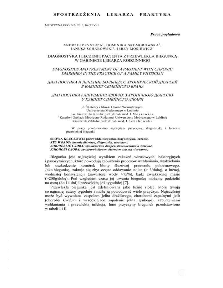 SPOSTRZEśENIA LEKARZA PRAKTYKA MEDYCYNA OGÓLNA, 2010, 16 (XLV), 1 Praca poglądowa A N D R Z E J P R Y S TU P A 1 , D O M I N I K A S K O M O R O WS K A 1 , J A N U S Z S C H A B O WS K I 2 , J E R Z Y M O S I E WI C Z 1 DIAGNOSTYKA I LECZENIE PACJENTA Z PRZEWLEKŁĄ BIEGUNKĄ W GABINECIE LEKARZA RODZINNEGO DIAGNOSTICS AND TREATMENT OF A PAQTIENT WITH CHRONIC DIARHHEA IN THE PRACTICE OF A FAMILY PHYSICIAN ДИАГНОСТИКА И ЛЕЧЕНИЕ БОЛЬНЫХ С ХРОНИЧЕСКОЙ ДИАРЕЕЙ В КАБИНЕТ СЕМЕЙНОГО ВРАЧА ДІАГНОСТИКА І ЛІКУВАННЯ ХВОРИХ З ХРОНІЧНОЮ ДІАРЕЄЮ У КАБІНЕТ СІМЕЙНОГО ЛІКАРЯ Z 1Katedry i Kliniki Chorób Wewnętrznych Uniwersytetu Medycznego w Lublinie p.o. Kierownika Kliniki: prof. dr hab. med. J. M o s i e w i c z 2 Katedry i Zakładu Medycyny Rodzinnej Uniwersytetu Medycznego w Lublinie Kierownik Zakładu: prof. dr hab. med. J. S c h a b o w s k i W pracy przedstawiono najczęstsze przyczyny, diagnostykę i leczenie przewlekłej biegunki. SŁOWA KLUCZOWE: przewlekła biegunka, diagnostyka, leczenie. KEY WORDS: chronic diarrhea, diagnostics, treatment. КЛЮЧЕВЫЕ СЛОВА: хронический диарея, диагностика и лечение. КЛЮЧОВІ СЛОВА: хронічний діарея, діагностика та лікування. - - - - - Biegunka jest najczęściej wynikiem zakaŜeń wirusowych, bakteryjnych i pasoŜytniczych, które powodują zaburzenia procesów wchłaniania, wydzielania lub uszkodzenie komórek błony śluzowej przewodu pokarmowego. Jako biegunkę, traktuje się zbyt częste oddawanie stolca (> 3/dobę), o luźnej, wodnistej konsystencji (zawartość wody >75%), bądź zwiększonej masie (>200g/dobę). Pod względem czasu jej trwania biegunkę moŜemy podzielić na ostrą (do 14 dni) i przewlekłą (>4 tygodnie) [7]. Przewlekła biegunka jest zdefiniowana jako luźne stolce, które trwają co najmniej cztery tygodnie i moŜe ją powodować wiele przyczyn. Najczęściej moŜe być wywołana zespołem jelita draŜliwego, chorobami zapalnymi jelit (choroba Crohna i wrzodziejące zapalenie jelita grubego), zaburzeniami wchłaniania i przewlekłą infekcją. Inne przyczyny biegunek przedstawiono w tabeli I i II. A. Prystupa, D. Skomorowska, J. Schabowski, J. Mosiewicz 46 Tabela I. Podział przewlekłych biegunek na infekcyjne i nieinfekcyjne Table I. PDivision of chronic diarrhea into infectious and non-infectious Таблица I. Распределение хронической диареи на инфекционные и неинфекционные Таблиця I. Розподіл хронічної діареї на інфекційні та неінфекційні Infekcyjne: Salmonella – nosicielstwo, pasoŜyty, w przebiegu AIDS Nieinfekcyjne: NaduŜywanie leków przeczyszczających, Zespół utraty kwasów Ŝółciowych, Gruczolaki kosmkowe. Jelitowy zespół utraty białka Alergia pokarmowa: celiakia, zespół upośledzonego trawienia Popromienne zapalenie jelit, Cytostatyki, Niedokrwienie Zatrucia: metale cięŜkie Tabela II. Przyczyny i podział przewlekłych biegunek Table II. Causes and division of chronic diarrhea Таблица II. Причины и распространение хронической диареи Таблиця II. Причини і поширення хронічної діареї Biegunka wodnista sekrecyjna Biegunka wodnista osmotyczna Biegunka tłuszczowa Zaburzenie wchłaniania Biegunka zapalna leki przeczyszczające przewlekłe naduŜywanie alkoholu zespół rozrostu bakteryjnego nowotwory czynne hormonalnie: rakowiak, VIPoma leki: siarczan magnezu, laktuloza, orlistat, neomycyna, metformina, metyldopa produkty spoŜywcze: sorbitol, mannitol niedobór laktazy (nietolerancja laktozy) przewlekłe zapalenie trzustki zespół rozrostu bakteryjnego cholestatyczna choroba wątroby celiakia niedokrwienie jelita nieswoiste zapalenie jelit (choroba LeśniowskiegoCrohna, wrzodziejące zapalenie jelita grubego) mikroskopowe zapalenie jelita grubego alergia pokarmowa nowotwory jelit Przyśpieszony pasaŜ jelitowy zespół jelita draźliwego nadczynność tarczycy - - - - - Mała objętość i częste epizody biegunki sugerują obecność choroby odbytnicy lub esicy, natomiast duŜa ilość stolca, wodnista biegunka jest charakterystyczna dla chorób jelita cienkiego lub prawej części jelita grubego [4]. Przewlekła biegunka moŜe być objawem wielu chorób przewodu pokarmowego: jelita cienkiego, grubego, trzustki i wątroby. Rozpoznanie przyczyny biegunki moŜemy postawić po dokładnym zebraniu wywiadu lekarskiego i wykonaniu badań dodatkowych. Wywiad lekarski stanowi bardzo waŜny element w rozpoznaniu przyczyn tych objawów. Najpierw naleŜy sprecyzować, co pacjent rozumie pod określeniem biegunka i jaka jest ilość wypróŜnień. WaŜne jest, aby określić częstość, konsystencję, objętość i barwę stolca oraz czy występują objawy Diagnostyka i leczenie pacjenta z przewlekłą biegunką … 47 towarzyszące, takie jak bóle brzucha lub gorączka. Dodatkowo istotne jest, aby zwrócić uwagę na początek oraz czas trwania objawów, utratę masy ciała i biegunkę nocną. DuŜe znaczenie ma wywiad dotyczący przyjmowanych leków oraz wywiad rodzinny (w przypadku celiakii, mukowiscydozy i choroby Crohna). Chorych z grup ryzyka naleŜy ocenić pod kątem objawów zakaŜenia HIV. Badanie fizykalne powinno obejmować badanie brzucha i w większości przypadków badanie przez odbyt (per rectum). Gorączka towarzysząca ostrej biegunce sugeruje przyczynę infekcyjną. Powiększenie tarczycy i drŜenia mięśniowe sugerują nadczynność tarczycy, a powiększone węzły chłonnechłoniaki, przerzuty nowotworowe i AIDS. W tabeli III i IV przedstawiono elementy wywiadu i badania fizykalnego pacjenta z przewlekłą biegunką. Tabela III. Elementy wywiadu lekarskiego u pacjenta