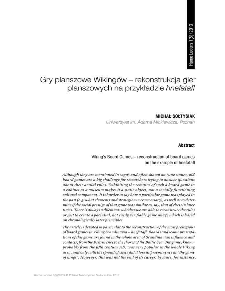 Homo Ludens 1(5) / 2013 Gry planszowe Wikingów – rekonstrukcja gier planszowych na przykładzie hnefatafl MICHAŁ SOŁTYSIAK Uniwersytet im. Adama Mickiewicza, Poznań Abstract Viking’s Board Games – reconstruction of board games on the example of hnefatafl Although they are mentioned in sagas and often shown on rune stones, old board games are a big challenge for researchers trying to answer questions about their actual rules. Exhibiting the remains of such a board game in a cabinet at a museum makes it a static object, not a socially functioning cultural component. It is harder to say how a particular game was played in the past (e.g. what elements and strategies were necessary), as well as to determine if the social prestige of that game was similar to, say, that of chess in later times. There is always a dilemma: whether we are able to reconstruct the rules or just to create a potential, not easily verifiable game image which is based on chronologically later principles. The article is devoted in particular to the reconstruction of the most prestigious of board games in Viking Scandinavia – hnefatafl. Boards and iconic presentations of this game are found in the whole area of Scandinavian influence and contacts, from the British Isles to the shores of the Baltic Sea. The game, known probably from the fifth century AD, was very popular in the whole Viking area, and only with the spread of chess did it lose its preeminence as “the game of kings”. However, this was not the end of its career, because, for instance, Homo Ludens 1(5) / 2 013 © Polskie Towarzystwo Badania Gier 2013 254 Michał Sołtysiak the first purely European chess set, the so-called Lewis Chessmen, was most likely also a set for playing hnefatafl. The rules of hnefatafl were reconstructed using the game rules from the eighteenth-century diary of Carl Linnaeus. This raises numerous questions concerning the credibility of the rules which are applied when hnefatafl is played today. KEYWORDS: board game, hnefatafl, archaeology, Vikings 1. Wstęp Gry planszowe towarzyszyły ludzkości od tysiącleci. Najwcześniejsze przedstawienia planszy i samej rozgrywki pochodzą z predynastycznego Egiptu, sprzed ok 5000 lat (Piccione, 1980). W wikińskiej Skandynawii gry takie były popularne jako rozrywka możnych oraz osób mieniących się wykształconymi. Często społeczne znaczenie gier planszowych było bardzo podobne jak w dzisiejszych szachach, gdyż traktowano je jako szkołę logicznego oraz strategicznego myślenia, a zwycięzcy nierzadko zdobywali dzięki swym umiejętnościom wielki prestiż. Nie była to jedynie męska rozrywka, gdyż grały również kobiety (Eales, 1985). Tafl emk orr at efla, „W tafla zagrać bardzo lubię” (cyt. za: Gordon, 1957, s. 155) – tak zaczyna swoje wyliczanie umiejętności ważnych dla prawdziwego Skandynawa jarl Rongvaldr Kali. Nie precyzuje on, w którą odmianę gier planszowych popularnych w jego czasach lubi zagrać, natomiast stawia grę na równi z umiejętnością pisania runów, czytania ksiąg, pracą w kuźni, jazdą na nartach, łucznictwem, wioślarstwem, grą na harfie i składaniem sag, jako podstawowe dziewięć umiejętności godnych rozumnego męża i władcy (Gordon, 1957). Nie wiemy, która z gier planszowych była najbardziej prestiżowa w kulturze wikińskiej – w czasach jarla znane były już takie gry, jak skaktafl (szachy), kvatrutafl (tryktrak) i hnefatafl („królewski stół”). Każda z nich odgrywała ważną rolę pośród rozrywek Skandynawów. W sagach granie w gry planszowe było jednym z elementów szczęśliwej rzeczywistości, na przykład w Eddzie Poetyckiej znajdujemy strofy wprost wspominające o grze w tafl1. Po Ragnaroku odmło1 Za komentarzem w tłumaczeniu Lee Hollandera (Poetic Edda, 1962, s. 12). Niestety w polskim tłumaczeniu, podobnie jak w wielu innych językach, np. w kanonicznej angielskiej wersji Poetic Edda w przekładzie Henry’ego Adamsa Bellowsa z 1936 roku (Poetic Edda, 1936, s. 25) przetłumaczono termin tafl jedynie jako „złote tablice”, bez wyjaśnienia, czym owe tablice były. Oryginał staroislandzki, w wydaniu Gamla Eddadigte z roku 1932, zawiera odniesienia właśnie do gry w tafl (por. Gamla Eddadigte, 1932, s. 16 – 17.). W znanym u nas tłumaczeniu Apolonii Załuskiej-Strömberg brzmi on następująco: 61. Tam potem cudowne Złote tablice w trawie się znajdą,Te, co za dawnych czasów Homo Ludens 1(5) / 2 013 © Polskie Towarzystwo Badania Gier 2013 Gry planszowe Wikingów – rekonstrukcja gier planszowych na przykładzie hnefatafl 255 dzeni bogowie mają zaś odnaleźć złote plansze do gry i wrócić dzięki nim do dawnego, idyllicznego stylu życia. Kłopot pojawia się jednak przy pytaniach przyziemnych. Jak grano w te gry? Jakie były ich reguły? Znany mediewista Philip Grierson dawno temu już żartobliwie stwierdzał na temat archeologii i jej odkryć: „Mówi się, że łopata nie kłamie, ale ma też tę zaletę, że nie umie mówić” (cyt. za: Hodges, 2001, s. 9). Miał niestety dużo racji. Pokazanie w muzeum, w przepełnionej często gablocie, pozostałości po dawnej grze planszowej tworzy z niej swoistą mumię funkcjonującego społecznie elementu kultury (ryc. 1). Dużo trudniej odpowiedzieć na pytanie o wygląd rzeczywistej rozgrywki. Nie wiemy, jakie elementy i strategie były niezbędne do wygrania partii, jakie zasady regulowały ruch pionów, wreszcie czy gra była zbalansowana oraz dawała podobne szanse obu przeciwnikom. W związku z nazwą „królewski stół” należałoby też odpowiedzieć na pytanie, czy prestiż społeczny hnefatafl był taki sam jak szachów w czasach późniejszych, czy może była to bardziej egalitarna rozrywka. Zawsze staje się również wobec dylematu, czy jesteśmy w stanie prawidłowo zrekonstruować reguły. Być może bowiem mamy szansę tylko skonstruować replikę opartą na źródłach, ale stanowiącą jedynie potencjalny, 
