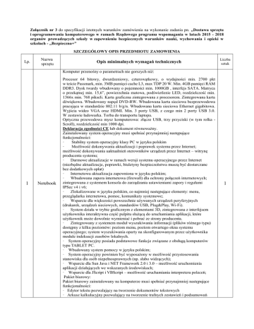 Załącznik nr 3 do specyfikacji istotnych warunków zamówienia na wykonanie zadania pn. „Dostawa sprzętu i oprogramowania komputerowego w ramach Rządowego programu wspomagania w latach 2015 - 2018 organów prowadzących szkoły w zapewnieniu bezpiecznych warunków nauki, wychowania i opieki w szkołach - „Bezpieczna+” SZCZEGÓŁOWY OPIS PRZEDMIOTU ZAMOWIENIA Lp. Nazwa sprzętu Opis minimalnych wymagań technicznych Liczba sztuk Komputer przenośny o parametrach nie gorszych niż: 1 Notebook Procesor 64 bitowy, dwurdzeniowy, czterowątkowy, o wydajności min. 2700 pkt w teście Passmark, min. 3MB pamięci cache L3, max TDP 20 W. Min. 4GB pamięci RAM DDR3. Dysk twardy wbudowany o pojemności min. 1000GB , interfejs SATA. Matryca o przekątnej min. 15,6”, powierzchnia matowa, podświetlenie LED, rozdzielczość min. 1366x min. 768 pikseli. Karta graficzna zintegrowana z procesorem. Zintegrowana karta dźwiękowa. Wbudowany napęd DVD-RW. Wbudowana karta sieciowa bezprzewodowa pracująca w standardzie 802.11 b/g/n. Wbudowana karta sieciowa Ethernet gigabitowa. Wyjścia wideo VGA oraz HDMI. Min. 3 porty USB, z czego min 2 porty USB 3.0. W zestawie ładowarka. Torba do transportu laptopa. Optyczna przewodowa mysz komputerowa: złącze USB, trzy przyciski (w tym rolka Scroll), rozdzielczość min 1000 dpi. Deklaracja zgodności CE lub dokument równoważny. Zainstalowany system operacyjny musi spełniać przynajmniej następujące funkcjonalności: · Stabilny system operacyjny klasy PC w języku polskim · Możliwość dokonywania aktualizacji i poprawek systemu przez Internet; możliwość dokonywania uaktualnień sterowników urządzeń przez Internet – witrynę producenta systemu; · Darmowe aktualizacje w ramach wersji systemu operacyjnego przez Internet (niezbędne aktualizacje, poprawki, biuletyny bezpieczeństwa muszą być dostarczane bez dodatkowych opłat) · Internetowa aktualizacja zapewniona w języku polskim; · Wbudowana zapora internetowa (firewall) dla ochrony połączeń internetowych; zintegrowana z systemem konsola do zarządzania ustawieniami zapory i regułami IPSec v4 i v6; · Zlokalizowane w języku polskim, co najmniej następujące elementy: menu, przeglądarka internetowa, pomoc, komunikaty systemowe; · Wsparcie dla większości powszechnie używanych urządzeń peryferyjnych (drukarek, urządzeń sieciowych, standardów USB, Plug&Play, Wi-Fi). · System działa w trybie graficznym z elementami 3D, zintegrowana z interfejsem użytkownika interaktywna część pulpitu służącą do uruchamiania aplikacji, które użytkownik może dowolnie wymieniać i pobrać ze strony producenta. · Zintegrowany z systemem moduł wyszukiwania informacji (plików różnego typu) dostępny z kilku poziomów: poziom menu, poziom otwartego okna systemu operacyjnego; system wyszukiwania oparty na skonfigurowanym przez użytkownika module indeksacji zasobów lokalnych. · System operacyjny posiada podstawowe funkcje związane z obsługą komputerów typu TABLET PC. · Wbudowany system pomocy w języku polskim; · System operacyjny powinien być wyposażony w możliwość przystosowania stanowiska dla osób niepełnosprawnych (np. słabo widzących); · Wsparcie dla Sun Java i NET Framework 2.0 i 3.0 – możliwość uruchomienia aplikacji działających we wskazanych środowiskach; · Wsparcie dla JScript i VBScript – możliwość uruchamiania interpretera poleceń; Pakiet biurowy: Pakiet biurowy zainstalowany na komputerze musi spełniać przynajmniej następujące funkcjonalności: · Edytor tekstu pozwalający na tworzenie dokumentów tekstowych · Arkusz kalkulacyjny pozwalający na tworzenie trafnych zestawień i podsumowań 1 2 Zapora sieciowa router UTM danych dzięki zaawansowanym narzędziom do analizowania informacji. · Narzędzie do tworzenia i odtwarzania prezentacji multimedialnych · Narzędzie do tworzenia notatek · Narzędzie do pracy z pocztą elektroniczną, harmonogramami oraz zadaniami · Narzędzie do tworzenia publikacji Oprogramowanie biurowe musi być zainstalowane na dostarczonym komputerze wraz z wprowadzoną licencją na to oprogramowanie. Musi być kompatybilne z zainstalowanym systemem operacyjnym. Zamawiający nie dopuszcza programów pochodzących od różnych producentów – całość musi być zintegrowanym systemem aplikacji biurowych. Gwarancja min. 24 miesiące Router z funkcjonalnością UTM o parametrach nie gorszych niż: System ochrony sieci musi zostać dostarczony w postaci komercyjnej platformy sprzętowej z zabezpieczonym systemem operacyjnym. System ochrony musi obsługiwać w ramach jednego urządzenia wszystkie z poniższych funkcjonalności podstawowych: firewall, IPS, antywirus, antyspam, kontrola treści (WWW i aplikacji), poufność danych – IPSec VPN oraz SSL VPN, z uwzględnieniem identyfikacji poszczególnych użytkowników lub grup użytkowników Rozwiązanie musi wspierać następujące tryby pracy: routing (warstwa 3), bridge (warstwa 2) i hybrydowy (część jako router, część jako bridge). Minimum 3 porty 10/100/1000 Mbps Nie mniej niż 512 interfejsów wirtualnych definiowanych jako VLANy w oparciu o standard IEEE 802.1Q Obsługa nie mniej niż 1 500 nowych połączeń na sek. Obsługa nie mniej niż 25 000 jednoczesnych połączeń Przepustowość firewall: nie mniej niż 300 Mbps Przepustowość IPS: nie mniej niż 80 Mbps Przepustowość antywirus: nie mniej niż 90 Mbps Przepustowość tunelu IPSec VPN: nie mniej niż 90 Mbps. Liczba tuneli IPSec VPN: nie mniejsza niż 20. Rozwiązanie musi umożliwiać uwierzytelnianie użytkowników poprzez Active Directory, LDAP, Radius oraz lokalną bazę użytkowników Rozwiązanie musi wspierać automatyczne uwierzytelnianie użytkowników w oparciu o Single Sign On System musi umożliwiać powiązanie użytkownika z adresem IP i MAC System musi wspierać funkcje load balancing i failover dla przynajmniej 2 łącz internetowych System musi wspierać algorytm WR