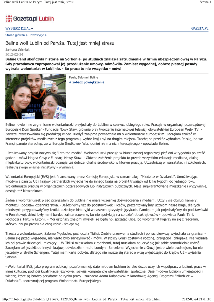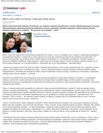 Beline woli Lublin od Paryża. Tutaj jest mniej stresu WYBIERZ DZIAŁ Strona 1 GAZETA.PL Strona główna > Inwestycje > Beline woli Lublin od Paryża. Tutaj jest mniej stresu Justyna Górniak 2012-02-24 Beline Cand skończyła historię na Sorbonie, po studiach znalazła zatrudnienie w firmie ubezpieczeniowej w Paryżu. Gdy pracodawca zaproponował jej przedłużenie umowy, odmówiła. Zamiast wygodnej, dobrze płatnej posady wybrała wolontariat w Lublinie. - Bo praca to nie wszystko - mówi Paula, Salome i Beline + zobacz powiększenie Beline i dwie inne zagraniczne wolontariuszki przyjechały do Lublina w czerwcu ubiegłego roku. Pracują w organizacji pozarządowej Europejski Dom Spotkań- Fundacja Nowy Staw, głównie przy tworzeniu internetowej telewizji obywatelskiej European Web- TV. Zawsze interesowałam się produkcją wideo. Kiedyś znajoma powiedziała mi o wolontariacie europejskim. Zaczęłam szukać w internecie projektów medialnych z tego programu, wybór kraju był na drugim miejscu. Trochę na przekór wybrałam Polskę, bo we Francji panuje stereotyp, że w Europie Środkowo- Wschodniej nie ma nic interesującego - opowiada Beline. - Realizowany projekt nazywa się "Into the media". Wolontariuszki pracują w biurze naszej organizacji pięć dni w tygodniu po sześć godzin - mówi Magda Gnyp z Fundacji Nowy Staw. - Główne założenia projektu to przede wszystkim edukacja medialna, dialog międzykulturowy, wolontariuszki poznają też dobrze lokalne środowisko w którym pracują. Uczestniczą w warsztatach i szkoleniach, realizują swoje własne inicjatywy - wymienia. Wolontariat Europejski (EVS) jest finansowany przez Komisję Europejską w ramach akcji "Młodzież w Działaniu". Umożliwiająca młodym z państw UE i krajów partnerskich wyjechanie do innego kraju na projekt trwający od kilku tygodni do jednego roku. Wolontariusze pracują w organizacjach pozarządowych lub instytucjach publicznych. Mają zagwarantowane mieszkanie i wyżywienie, dostają też kieszonkowe. Żadna z wolontariuszek przed przyjazdem do Lublina nie miała wcześniej doświadczenia z mediami. Uczyły się obsługi kamery, montażu i podstaw dziennikarstwa. - Jeździłyśmy też do podstawówek i liceów, prezentowałyśmy uczniom nasze kraje, dla tych młodszych przygotowałyśmy krótkie dziecięce historyjki w naszych ojczystych językach. Pamiętam jak pojechałyśmy do podstawówki w Poniatowej, dzieci były nami bardzo zainteresowane, bo nie spotykają na co dzień obcokrajowców - opowiada Paula Tani. Pochodzi z Tartu w Estonii. - Moi estońscy znajomi myśleli, że będę np. sprzątać ulice, bo wolontariat kojarzy im się z rzeczami, których inni po prostu nie chcą robić - śmieje się. Trzecia z wolontariuszek, Salome Mgeladze, pochodzi z Tbilisi. Zrobiła przerwę na studiach i po raz pierwszy wyjechała za granicę. Bałam się przed wyjazdem, ale warto było zaryzykować - mówi. W stolicy Gruzji zostawiła rodzinę, przyjaciół i chłopaka. Nie widziała ich od prawie dziewięciu miesięcy. - W Tbilisi mieszkałam z rodzicami, tutaj musiałam nauczyć się jak sobie samodzielnie radzić. Zaczęłam też jeździć do innych krajów, odwiedziłam m.in. Londyn i Barcelonę. Wyjechanie z Gruzji jest o wiele trudniejsze, bo nie jesteśmy w strefie Schengen. Tutaj mam kartę pobytu, dlatego nie muszę się starać o wizę wyjeżdżając do krajów UE - wyjaśnia Salome. - Wolontariat EVS, jako program edukacji pozaformalnej, daje młodym ludziom bardzo dużo: uczy ich współpracy z ludźmi, pracy w innej kulturze, podnosi kwalifikacje językowe, rozwija kompetencje obywatelskie i społeczne. Daje młodym ludziom umiejętności i wiedzę, które są bardzo przydatne na rynku pracy - zaznacza Adam Kułanowski z Narodowej Agencji Programu "Młodzież w Działaniu", koordynującej program Wolontariatu Europejskiego. http://m.lublin.gazeta.pl/lublin/1,121427,11229095,Beline_woli_Lublin_od_Paryza__Tutaj_jest_mniej_stresu.html 2012-03-24 21:01:10 Beline woli Lublin od Paryża. Tutaj jest mniej stresu Strona 2 Działaniu", koordynującej program Wolontariatu Europejskiego. - Nieformalna edukacja jest o wiele ważniejsza niż wiedza książkowa. Dzięki wolontariatowi poznaję nowych ludzi z różnych kultur, codziennie uczę się czegoś nowego. Młodzi Europejczycy powinni podróżować, poznawać inne kultury, człowiek staje się wtedy wartościowszy - zaznacza Beline. Jak wolontariuszki odnalazły się w Lublinie? - Paryż jest wielkim miastem, żeby się dostać z jednego miejsca do drugiego, w transporcie publicznym spędza się nawet dwie godziny. Wolę Lublin, jest mniejszy, nikt się nie spieszy, nie ma tak dużego stresu. W lecie kupiłam rower i zaczęłam podczas wycieczek odkrywać miasto i jego historię - opowiada Beline Salome: - Nasze kultury są zupełnie inne, Gruzini są na pewno bardziej otwarci w codziennych kontaktach. Paula: - Tartu, tak jak Lublin, jest miastem studenckim, młodzi są tacy sami. Zaskoczeniem była kuchnia, a właściwie to, że jecie tyle zup. W marcu, po dziewięciu miesiącach spędzonych w Lublinie, wolontariuszki wrócą do swoich krajów. - Po EVS widzę, że dużo drzwi jest otwartych. Trzeba z tego korzystać - mówi Paula. Polskie organizacje i instytucje mogą brać udział w programie EVS od 2000 roku. Od tego czasu do naszego kraju przyjechało ponad trzy tysiące wolontariuszy. - Liczba wolontariuszy wzrasta, zarówno tych, którzy chcą przyjechać do Polski, jak i tych, którzy wyjeżdżają na projekty zagraniczne - mówi Kułanowski. Młodzi z Polski najczęściej decydują się na wyjazd do Niemiec, Turcji, a ostatnio zainteresowanie budzą też kraje Partnerstwa Wschodniego, głównie Ukraina i Gruzja. Lublin.gazeta.pl Wiadomości | Komunikacja | Inwestycje | Sport | Repertuar kin | Pogoda Wszystkie serwisy Pełna wersja lublin.gazeta.pl Copyright © Agora SA http://m.lublin.gazeta.pl/lublin/1,121427,11229095,Beline_woli_