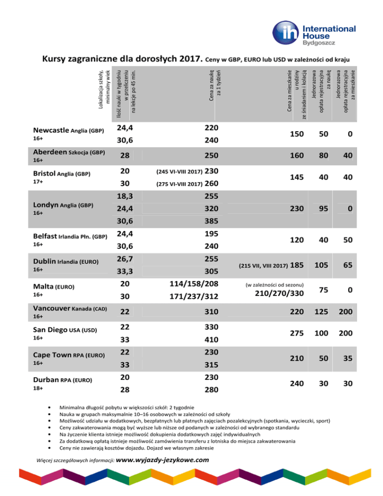 Newcastle Anglia (GBP) 24,4 220 16+ 30,6 240 28 250 Aberdeen Szkocja (GBP) 16+ Bristol Anglia (GBP) 20 (245 VI-VIII 2017) 230 17+ 30 (275 VI-VIII 2017) 260 18,3 255 24,4 320 30,6 385 Belfast Irlandia Płn. (GBP) 24,4 195 16+ 30,6 240 Dublin Irlandia (EURO) 26,7 255 16+ 33,3 305 Londyn Anglia (GBP) 16+ (215 VII, VIII 2017) Jednorazowa opłata rejestracyjna za mieszkanie Jednorazowa opłata rejestracyjna za naukę Cena za mieszkanie u rodziny ze śniadaniem i kolacją Cena za naukę za 1 tydzień Ilość nauki w tygodniu w przeliczeniu na lekcje po 45 min. Lokalizacja szkoły, minimalny wiek Kursy zagraniczne dla dorosłych 2017. Ceny w GBP, EURO lub USD w zależności od kraju 150 50 0 160 80 40 145 40 40 230 95 0 120 40 50 185 105 65 Malta (EURO) 20 114/158/208 16+ 30 171/237/312 210/270/330 75 0 22 310 220 125 200 San Diego USA (USD) 22 330 16+ 33 410 275 100 200 Cape Town RPA (EURO) 22 230 16+ 33 315 210 50 35 Durban RPA (EURO) 20 230 18+ 28 280 240 30 30 Vancouver Kanada (CAD) 16+ • • • • • • • (w zależności od sezonu) Minimalna długość pobytu w większości szkół: 2 tygodnie Nauka w grupach maksymalnie 10–16 osobowych w zależności od szkoły Możliwość udziału w dodatkowych, bezpłatnych lub płatnych zajęciach pozalekcyjnych (spotkania, wycieczki, sport) Ceny zakwaterowania mogą być wyższe lub niższe od podanych w zależności od wybranego standardu Na życzenie klienta istnieje możliwość dokupienia dodatkowych zajęć indywidualnych Za dodatkową opłatą istnieje możliwość zamówienia transferu z lotniska do miejsca zakwaterowania Ceny nie zawierają kosztów dojazdu. Dojazd we własnym zakresie Więcej szczegółowych informacji: www.wyjazdy-jezykowe.com