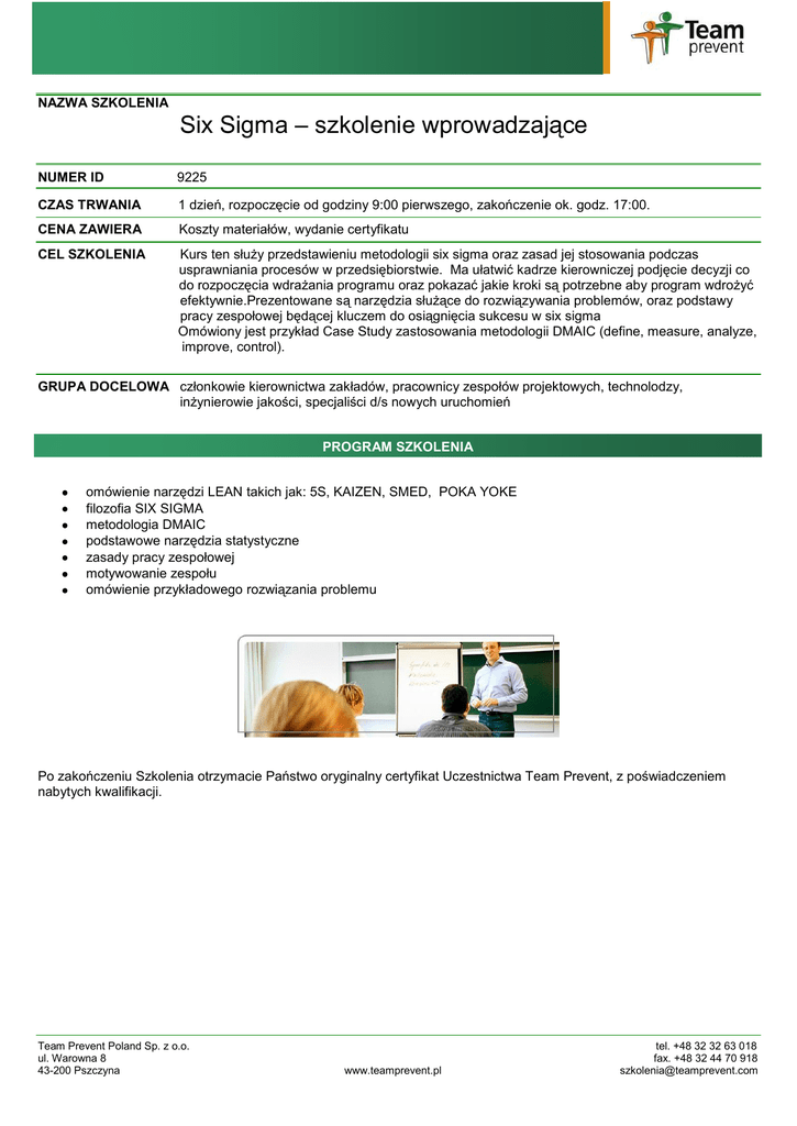 NAZWA SZKOLENIA Six Sigma – szkolenie wprowadzające NUMER ID 9225 CZAS TRWANIA 1 dzień, rozpoczęcie od godziny 9:00 pierwszego, zakończenie ok. godz. 17:00. CENA ZAWIERA Koszty materiałów, wydanie certyfikatu CEL SZKOLENIA Kurs ten służy przedstawieniu metodologii six sigma oraz zasad jej stosowania podczas usprawniania procesów w przedsiębiorstwie. Ma ułatwić kadrze kierowniczej podjęcie decyzji co do rozpoczęcia wdrażania programu oraz pokazać jakie kroki są potrzebne aby program wdrożyć efektywnie.Prezentowane są narzędzia służące do rozwiązywania problemów, oraz podstawy pracy zespołowej będącej kluczem do osiągnięcia sukcesu w six sigma Omówiony jest przykład Case Study zastosowania metodologii DMAIC (define, measure, analyze, improve, control). GRUPA DOCELOWA członkowie kierownictwa zakładów, pracownicy zespołów projektowych, technolodzy, inżynierowie jakości, specjaliści d/s nowych uruchomień PROGRAM SZKOLENIA omówienie narzędzi LEAN takich jak: 5S, KAIZEN, SMED, POKA YOKE filozofia SIX SIGMA metodologia DMAIC podstawowe narzędzia statystyczne zasady pracy zespołowej motywowanie zespołu omówienie przykładowego rozwiązania problemu Po zakończeniu Szkolenia otrzymacie Państwo oryginalny certyfikat Uczestnictwa Team Prevent, z poświadczeniem nabytych kwalifikacji. Team Prevent Poland Sp. z o.o. ul. Warowna 8 43-200 Pszczyna www.teamprevent.pl tel. +48 32 32 63 018 fax. +48 32 44 70 918 [email protected]
