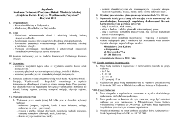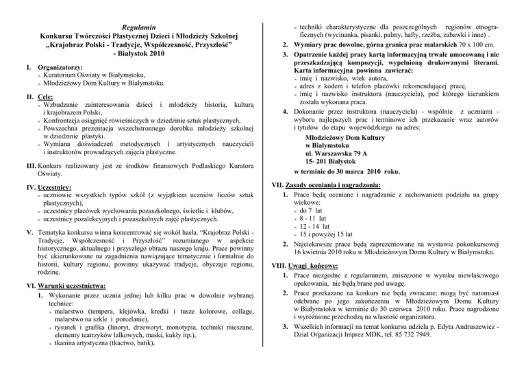 Regulamin Konkursu Twórczości Plastycznej Dzieci i MłodzieŜy Szkolnej „Krajobraz Polski - Tradycje, Współczesność, Przyszłość” - Białystok 2010 I. Organizatorzy: • Kuratorium Oświaty w Białymstoku, • MłodzieŜowy Dom Kultury w Białymstoku. II. Cele: • Wzbudzanie zainteresowania dzieci i młodzieŜy historią, kulturą i krajobrazem Polski, • Konfrontacja osiągnięć rówieśniczych w dziedzinie sztuk plastycznych, • Powszechna prezentacja wszechstronnego dorobku młodzieŜy szkolnej w dziedzinie plastyki. • Wymiana doświadczeń metodycznych i artystycznych nauczycieli i instruktorów prowadzących zajęcia plastyczne. III. Konkurs realizowany jest ze środków finansowych Podlaskiego Kuratora Oświaty. IV. Uczestnicy: • uczniowie wszystkich typów szkół (z wyjątkiem uczniów liceów sztuk plastycznych), • uczestnicy placówek wychowania pozaszkolnego, świetlic i klubów, • uczestnicy pozalekcyjnych i pozaszkolnych zajęć plastycznych. V. Tematyka konkursu winna koncentrować się wokół hasła. “Krajobraz Polski Tradycje, Współczesność i Przyszłość” rozumianego w aspekcie historycznego, aktualnego i przyszłego obrazu naszego kraju. Prace powinny być ukierunkowane na zagadnienia nawiązujące tematycznie i formalnie do historii, kultury regionu, powinny ukazywać tradycje, obyczaje regionu, rodzinę. VI. Warunki uczestnictwa: 1. Wykonanie przez ucznia jednej lub kilku prac w dowolnie wybranej technice: • malarstwo (tempera, klejówka, kredki i tusze kolorowe, collage, malarstwo na szkle i porcelanie), • rysunek i grafika (linoryt, drzeworyt, monotypia, techniki mieszane, elementy teatrzyków lalkowych, maski, kukły itp.), • tkanina artystyczna (tkactwo, batik), techniki charakterystyczne dla poszczególnych regionów etnograficznych (wycinanka, pisanki, palmy, hafty, rzeźba, zabawki i inne) . 2. Wymiary prac dowolne, górna granica prac malarskich 70 x 100 cm. 3. Opatrzenie kaŜdej pracy kartą informacyjną trwale umocowaną i nie przeszkadzającą kompozycji, wypełnioną drukowanymi literami. Karta informacyjna powinna zawierać: • imię i nazwisko, wiek autora, • adres z kodem i telefon placówki rekomendującej pracę, • imię i nazwisko instruktora (nauczyciela), pod którego kierunkiem została wykonana praca. 4. Dokonanie przez instruktora (nauczyciela) - wspólnie z uczniami wyboru najlepszych prac i terminowe ich przekazanie wraz autorów i tytułów do etapu wojewódzkiego na adres: MłodzieŜowy Dom Kultury w Białymstoku ul. Warszawska 79 A 15- 201 Białystok w terminie do 30 marca 2010 roku. • VII. Zasady oceniania i nagradzania: 1. Prace będą oceniane i nagradzanie z zachowaniem podziału na grupy wiekowe: • do 7 lat • 8 - 11 lat • 12 - 14 lat • 15 i powyŜej 15 lat 2. Najciekawsze prace będą zaprezentowane na wystawie pokonkursowej 16 kwietnia 2010 roku w MłodzieŜowym Domu Kultury w Białymstoku. VIII. Uwagi końcowe: 1. Prace niezgodne z regulaminem, zniszczone w wyniku niewłaściwego opakowania, nie będą brane pod uwagę. 2. Prace przekazane na konkurs nie będą zwracane; mogą być natomiast odebrane po jego zakończeniu w MłodzieŜowym Domu Kultury w Białymstoku w terminie do 30 czerwca 2010 roku. Prace nagrodzone i wyróŜnione przechodzą na własność organizatora. 3. Wszelkich informacji na temat konkursu udziela p. Edyta Andruszewicz Dział Organizacji Imprez MDK, tel. 85 732 7949.