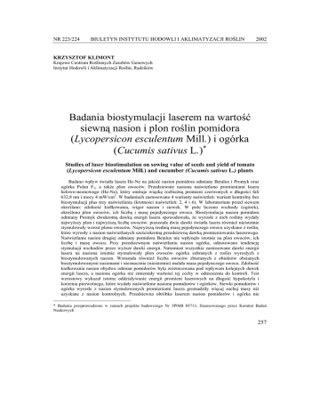 NR 223/224 BIULETYN INSTYTUTU HODOWLI I AKLIMATYZACJI ROŚLIN 2002 KRZYSZTOF KLIMONT Krajowe Centrum Roślinnych Zasobów Genowych Instytut Hodowli i Aklimatyzacji Roślin, Radzików Badania biostymulacji laserem na wartość siewną nasion i plon roślin pomidora (Lycopersicon esculentum Mill.) i ogórka (Cucumis sativus L.)∗ Studies of laser biostimulation on sowing value of seeds and yield of tomato (Lycopersicon esculentum Mill.) and cucumber (Cucumis sativus L.) plants Badano wpływ światła lasera He-Ne na jakość nasion pomidora odmiany Betalux i Promyk oraz ogórka Polan F1, a także plon owoców. Przedsiewnie nasiona naświetlono promieniami lasera helowo-neonowego (He-Ne), który emituje wiązkę rozbieżną promieni czerwonych o długości fali 632,8 nm i mocy 4 mW/cm2. W badaniach zastosowano 4 warianty naświetleń: wariant kontrolny bez biostymulacji plus trzy naświetlania (krotności naświetleń: 2, 4 i 6). W laboratorium przed siewem określano: zdolność kiełkowania, wigor nasion i siewek. W polu liczono wschody (ogórek), określono plon owoców, ich liczbę i masę pojedynczego owocu. Biostymulacja nasion pomidora odmiany Promyk dwukrotną dawką energii lasera spowodowała, że wyrosłe z nich rośliny wydały najwyższy plon i najwyższą liczbę owoców. pozostałe dwie dawki światła lasera również nieistotnie stymulowały wzrost plonu owoców. Najwyższą średnią masę pojedynczego owocu uzyskano z roślin, które wyrosły z nasion naświetlanych sześciokrotną przedsiewną dawką promieniowania laserowego. Naświetlanie nasion drugiej odmiany pomidora Betalux nie wpłynęło istotnie na plon owoców, ich liczbę i masę owocu. Przy przedsiewnym naświetlaniu nasion ogórka, odnotowano tendencję stymulacji wschodów przez wyższe dawki energii. Natomiast wszystkie zastosowane dawki energii lasera na nasiona istotnie stymulowały plon owoców ogórka zebranych z roślin wyrosłych z biostymulowanych nasion. Wzrastała również liczba owoców zbieranych z obiektów obsianych biostymulowanymi nasionami i nieznacznie (nieistotnie) malała masa pojedynczego owocu. Zdolność kiełkowania nasion obydwu odmian pomidorów była zróżnicowana pod wpływem kolejnych dawek energii lasera, a nasiona ogórka nie zmieniały wartości tej cechy w odniesieniu do kontroli. Test wzrostowy wykazał istotne oddziaływanie energii promieni laserowych na długość hypokotylu i korzenia pierwotnego, które wydały naświetlone nasiona pomidorów i ogórków. Siewki pomidorów i ogórka wyrosłe z nasion stymulowanych promieniami lasera gromadziły więcej suchej masy niż uzyskane z nasion kontrolnych. Przedsiewna obróbka laserem nasion pomidorów i ogórka nie * Badania przeprowadzono w ramach projektu badawczego Nr 5P06B 03713, finansowanego przez Komitet Badań Naukowych 257 Krzysztof Klimont wpłynęła na wigor nasion, oceniany elektroprzewodnictwem wód nastoinowych. Przedsiewne naświetlanie spowodowało, że udział nasion normalnie kiełkujących pomidora odmiany Betalux oceniany testem przyśpieszonego starzenia istotnie wzrastał, zaś odmiany Promyk i ogórka nie ulegał zmianie. Słowa kluczowe: biostymulacja, laser, nasiona, ogórek, plon owoców, pomidor, wartość siewna nasion The effect of He-Ne laser irradiation on seed sowing value and on the fruit yield of Betalux and Promyk tomato cultivars and cucumber cv. Polan F1, was examined. Before sowing, seeds were exposed to He-Ne laser light, with the wave length of 632.8 nm and the power of 4 mW/cm2. Four variants were evaluated: control-without biostimulation and three irradiation doses (double, fourfold and sixfold). In the laboratory, before sowing, standard germination and seed and seedling vigour were determined. In the field the following parameters were evaluated: emergence (cucumber), fruit yield, fruit number and weight of the individual fruit. Biostimulation of seeds of cv. Promyk with double dose of energy resulted in the highest yield and weight fruit. The remaining doses caused non significant increased the fruit yield. The highest weight of the individual fruit was obtained from plants originated from seeds sixfold irradiated. Irradiation of seeds of Betalux tomato cultivar did not influence significantly the fruit yield, fruit number and weight. Pre-sowing irradiation of cucumber seed with higher doses of energy stimulated field emergence, and all applied doses of laser light treatment caused increase the fruit yield of cucumber. Higher yield resulted from significantly higher number of harvested fruits with slightly lower in individual fruit weight. Germination capacity of seeds of both tomato cultivars was differentiated dependently on irradiation dose, but germination of cucumber seed did not change in comparison to control. Growth test showed significant impact of laser energy on length of hypocotyl and primary root produced by tomato and cucumber seeds. Seedlings of tomato and cucumber grown from stimulated seeds cumulated more dry weight than those from control seeds. Irradiation treatment of tomato and cucumber seeds did not influenced seed vigour assessed by the conductivity test. Pre-sowing irradiation caused the increase of percentage of normal seedling only in case of tomato, cv. Betalux in the accelerated ageing test. Key words: biostimulation, laser, seeds, cucumber, fruit yield, tomato, seed sowing value WSTĘP Do najnowszych metod uszlachetniania materiału siewnego, poprawy jego wartości, a także uzyskiwania wyższych plonów należy promieniowanie laserowe (Iniuszyn i in., 1981; Koper i Kornas-Czuczwar, 1996; Koper i in., 1996; Gładyszewska i in., 1998). Jest ono bezpieczniejsze od metod chemicznych, ponieważ modyfikuje tylko procesy fizjologiczne i biochemiczne w nasionach (Górecki i Grzesiuk, 1994; Rybiński i in., 1993; Podleśny i Koper, 1998) i nie powoduje zanieczyszczania środowiska. Światło lasera oddziałuje na procesy metaboliczne roślin i aktywność 
