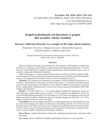 Psychiatr. Pol. 2015; 49(2): 255–263 PL ISSN 0033-2674 (PRINT), ISSN 2391-5854 (ONLINE) www.psychiatriapolska.pl DOI: http://dx.doi.org/10.12740/PP/32500 Zespół uzależnienia od Internetu w grupie 402 uczniów szkoły średniej Internet Addiction Disorder in a sample of 402 high school students Francesco Taranto, Arianna Goracci, Simone Bo lo g n es i, Elisa B orghini, Andrea F ag i o l i n i Instytut Psychiatrii Uniwersytetu Medycznego w Sienie, Włochy Kierownik: prof. A. Fagiolini Summary Internet Addiction Disorder can be defined as “the inability of individuals to control their internet use, resulting in marked distress and/or functional impairment in daily life.” It carries the same social aftermath of impulse control and substance misuse disorders such as loss of control, craving and withdrawal symptoms. Aim: In this paper, we aimed to assess the prevalence of IAD in an Italian sample of highschool students. We also explored the relationship between Social Phobia and IAD diagnosis; lastly, we investigated the association between IAD and substance misuse. Methods: The research was conducted in accordance with the Helsinki Declaration. Assessments administered in this study consisted of three parts: 1) collecting information about general and personal data of the subjects; 2) the Internet Addiction questionnaire proposed by Ko, composed by 9 different areas; 3) the Social Anxiety Spectrum Self-Report (SHY-SR) Lifetime Questionnaire. Results: 19 of 402 subjects (i.e. 4.7% of the sample) fulfilled the diagnostic criteria for IAD, showing a slight predominance of males. 10.9% of subjects met diagnostic criteria for a Social Phobia Spectrum disorder. Six IAD subjects (31.8%) were also diagnosed with a social phobia spectrum condition. Within the group of students diagnosed with IAD, 4 (21.05%) subjects reported current or past use of drugs. Conclusion: Our results suggest that there is a sizable population of youth already showing or at risk of developing some kind of problematic relationship with the web. Social Anxiety Disorder seems to be both a risk factor and a frequent co-morbid disorder of internet misuse. Further studies along with shared diagnostic criteria and tools will facilitate research on treatments for these rapidly expanding and disabling conditions. Słowa klucze: zespół uzależnienia od Internetu, patologiczne korzystanie z Internetu, fobia społeczna Key words: Internet Addiction Disorder, pathological Internet use, social phobia 256 Francesco Taranto i wsp. Wstęp Istnieje wyraźna, choć wieloaspektowa różnica między większością użytkowników Internetu, którzy są w stanie wykorzystać jego potencjał w sposób kontrolowany, a podgrupą osób, które stopniowo tracą zdolność do zarządzania częstotliwością i czasem dostępu do Internetu. Mimo że w ciągu ostatnich piętnastu lat zaobserwowano wzrost badań nad tzw. zespołem uzależnienia od Internetu (Internet Addiction Disorder – IAD), nadal istnieje wiele kontrowersji na temat tego nowego problemu z zakresu zdrowia psychicznego. Według Ha i wsp. [1], a także zdaniem Pies [2], IAD można zdefiniować jako „niezdolność jednostek do kontroli korzystania z Internetu, co powoduje wyraźny niepokój i/lub upośledzenia funkcjonowania w życiu codziennym”. W ostatniej, piątej edycji klasyfikacji DSM (Diagnostic and Statistical Manual of Mental Disorders; DSM-5) uzależnienie od gier internetowych zostało uwzględnione w Sekcji III: zaburzenia w niej zawarte wymagają dalszych badań, zanim zostaną uznane formalnie za zaburzenia [3]. Koncepcyjnie, pod pojęciem „uzależnienie od Internetu” rozumiane jest spektrum zaburzeń kompulsywno-impulsywnych, które obejmują korzystanie z komputera w trybie offline i /lub online [4, 5]. We wszystkich tych wariantach można wyróżnić cztery główne komponenty: nadużywanie, wycofanie, tolerancja i negatywne skutki [6]; pojawiają się tu także takie same społeczne skutki jak w zaburzeniach kontroli impulsów i nadużywaniu substancji odurzających, tj. utrata kontroli, głód i objawy odstawienne. Wnioski płynące z badań przeprowadzonych w różnych krajach pokazują, że występowanie IAD jest rozpowszechnione, jednak brak spójnych i jednolitych definicji, jak również wykorzystanie różnych narzędzi badawczych, do tej pory utrudniały wiarygodne oszacowanie rozpowszechnienia tego zaburzenia. Niedawny przegląd [7] wykazał występowanie IAD w zakresie od 0,3% do 0,7% w USA i na poziomie 0,8% we Włoszech, podczas gdy częstość występowania w krajach azjatyckich jest znacznie wyższa (np. w Hongkongu wynosi ona 26,7%). Częstość występowania chorób towarzyszących u pacjentów cierpiących na IAD jest bardzo wysoka: najbardziej powszechnymi zaburzeniami psychicznymi związanymi z tym zjawiskiem są: zespół nadpobudliwości psychoruchowej z deficytem uwagi, fobia społeczna i depresja [8]. Najbardziej narażeni na występowanie IAD wydają się adolescenci [9]: dwa ostatnie badania włoskie skupiały się na nastolatkach, wykazując rozpowszechnienie IAD na poziomie około 5% [10, 11]. Cel Celem niniejszej pracy jest ocena występowania IAD w grupie włoskich uczniów szkoły średniej w wieku 14–16 lat. Zbadano również związek między fobią społeczną i IAD, koncentrując się na subklinicznej symptomatologii, przy wykorzystaniu Ustrukturalizowanego Wywiadu Klinicznego do Badania Fobii Społecznej (Structured Clinical Interview for Social Phobia Spectrum – SCI-SHY). Zbadano także związek pomiędzy IAD i nadużywaniem substancji psychoaktywnych, by określić współwystępowanie chorób o prawdopodobnie wspólnej etiologii. Zespół uzależnienia od Internetu w grupie 402 uczniów szkoły średniej 257 Metody Badanie zostało przeprowadzone zgodnie z deklaracją helsińską. Komisja Etyki i Instytucjonalna Komisja Kontroli Biomedycznej Szpitala Uniwersyteckiego w Sienie (Biomedical Institutional Review Boar
