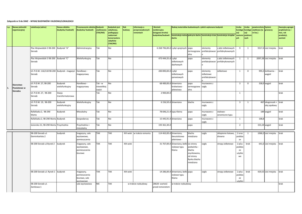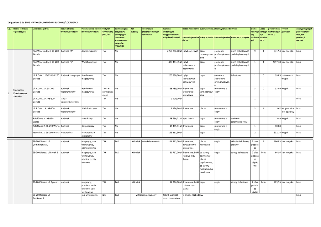 Załącznik nr 9 do SIWZ - WYKAZ BUDYNKÓW I BUDOWLI/LOKALIZACJI L.p. 1. Nazwa jednostki organizacyjnej Starostwo Powiatowe w Sieradzu Lokalizacja (adres) Nazwa obiektu (budynku/ budowli) Przeznaczenie obiektu Budynek Budynkek jest (budynku/ budowli) użytkowany zabytkowy, (TAK/NIE) podlegający nadzorowi konserwatora zabytków (TAK/NIE) Rok budowy Informacje o przeprowadzonych remontach Wartość ewidencyjna (księgowa brutto) budynków/budowli Rodzaj materiałów budowlanych z jakich wykonano budynek Liczba kondygn acji konstrukcja nośna pokrycie dachu konstrukcja ścian konstrukcja stropów naziemn dachu ych Plac Wojewódzki 3 98-200 Budynek "A" Sieradz Administracyjny Tak Nie Plac Wojewódzki 3 98-200 Budynek "C" Sieradz Wielofunkcyjny Tak Nie 473 444,35 zł z płyt żelbetowych dachowych papa Ul. P.O.W. 116/118 98-200 Budynek - magazyn Handlowo Sieradz magazynowy Tak Nie 200 890,00 zł z płyt żelbetowych panwiowych papa Ul. P.O.W. 27, 98-200 Sieradz Budynek wielofunkcyjny Ul. P.O.W. 27, 98-200 Sieradz Stacja transformatorowa Tak - w Nie niewielkiej części Tak Nie 68 489,00 zł drewniana krokwiowo płatwiowa 2 900,00 zł Ul. P.O.W. 19, 98-200 Sieradz Budynek wielofunkcyjny Wielofunkcyjny Tak Nie 6 156,50 zł drewniana Rafałówka 2, 98-290 Warta Budynek Mieszkalny Tak Nie Rafałówka 2, 98-290 Warta Budynek Gospodarczy Tak Nie Jeziorsko 21, 98-290 Warta Przychodnia Przychodnia + mieszkalny Tak Nie 98-200 Sieradz ul. Dominikańska 2 budynek TAK TAK XVI wiek w trakcie remontu 98-200 Sieradz ul.Rynek 2 budynek magazyny, sale wystawowe, pomieszczenia biurowe magazyny, sale TAK TAK XIX wiek Handlowo magazynowy 6 268 796,00 zł z płyt sprężnych papa elementy z płyt żelbetowych termozgrzew prefabrykowan prefabrykowanych alna e 98-200 Sieradz ul. Rynek 1 budynek 98-200 Sieradz ul. Zamkowa 1 magazyny, pomieszczenia biurowe, sale wystawowe sala wystawowa TAK TAK NIE TAK XIX wiek w trakcie rozbudowy elementy żelbetowe żelbetowe prefabrykowan e papa murowane z termozgrzew cegły alna murowane z cegły 78 696,21 zł typu Kleina papa murowane z cegły 1 9317,4 sieć miejska brak 1 1 2097,38 sieć miejska brak 1 0 995,5 kotłownia węgiel brak 3 0 338,9 węgiel brak 15 445,91 zł drewniana papa murowane z cegły 3 stalowoceramiczne typu Kleina papa 14 286,00 zł drewniana, belki papa stalowe typu Klaina 28620- wartość w trakcie rozbudowy przed remonetem brak 1 cegła 467 ekogroszek + brak olej opałowy 189 węgiel 1 108,8 2 114 463,00 zł drewniana, blacha cegła dwustolcowa miedziana płatniowo 31 767,00 zł kleszczowa drewniana, belki oo strony cegła stalowe typu podwórka Klaina blacha ocynkowana, od strony Rynku blacha miedziana Awaryjny agregat prądotwórczy – moc, rok produkcji, wartość 9 1 blacha 193 361,30 zł wystawowe, pomieszczenia biurowe elementy z płyt żelbetowych prefabrykowan prefabrykowanych e Liczba powierzchnia System kondygn użytkowa [w grzewczy acji m kw.] podziem nych sklepienie łukowe, 2 oraz drewno poddas ze użytko stropy żelbetowe 2 plus brak brak 333,24 węgiel brak 1 1068,3 sieć miejska brak brak 641,6 sieć miejska brak brak 429,55 sieć miejska brak poddas ze użytko we stropy żelbetowe 2 plus poddas ze użytko brak 2. Muzeum Okregowe w Sieradzu Tubądzin - Muzeum dwór Walewskich w Tubądzinie, (Oddział) Muzeum Okregowego w Sieradzu z loklizacją w Tubądzinie sale wystawowe, magazyny TAK TAK 1796 r. XVIII wiek drewniana, dach blacha jetkowy na miedziana ramie stolcowej cegła stropy żelbetowe, 2+podd belki stalowe typu asze Kleina Tubądzin - Muzeum oficyna Walewskich w Tubądzinie, (Oddział) Muzeum Okregowego w Sieradzu z loklizacją w Tubądzinie Tubądzin - Muzeum kotłownia Walewskich w Tubądzinie, (Oddział) Park Muzeum Sieradzki Dom Tkacza Etnograficzny Sieradz, ul. Grodzka 1 (Oddział ) Zagroda Szczepana Muchy administracja, magazyny TAK TAK XVIII wiek drewniana, krokwiowo platowa blacha miedziana cegła stropy żelbetowe, 1+podd belki stalowe typu asze Kleina NIE 1984 r. belki DZ-3 i papa płyty korytkowe zamknięte drewniany, gont naczółkowy z drewniany facjatka cegla Sieradzki Park dom z gankiem Etnograficzny Sieradz, ul. Grodzka 1 (Oddział ) Zagroda Szczepana Muchy pomieszczenia TAK, kotłowni, magazyny kotłownie gospodarcze dzierżawy pomieszczenia TAK magazynowe i gospodarcze belki DZ-3 i płyty korytkowe piwnice - cegła, zamknięte belki drewniane parter i obite deskami poddasze drewno 1 474,5 kotłownia brak wynajmowan a przez ZCB w Tubadzinie ogrzewanie gazowe 268,24 1 brak 1+podd asze 1 brak brak wpisany do inwentarza muzealnego początek XIX wieku pomieszczenia wystawowe TAK, dla wpisany do zwiedzając inwentarza ych muzealnego połowa XX wieku drewniana,dach dachówka dwuspadowy cementowa drewno drewno 1+ strych brak Sieradzki Park obórka Etnograficzny Sieradz, ul. Grodzka 1 (Oddział ) Zagroda Szczepana Muchy pomieszczenie magazynowe NIE wpisane do inwentarza muzealnego połowa XX wieku drewno, dach dwuspadowy dachówka cementowa bloki cementowo wapienne drewno 1 brak brak brak Sieradzki Park Etnograficzny Sieradz, ul. Grodzka 1 (Oddział ) Zagroda Szczepana Muchy kompleks szop w ilości - 4 , obiekty przylegające do siebie pomieszczenia wystawowe i magazynowe TAK, dla wpisany do zwiedzając inwentarza ych muzealnego połowa XX wieku drewno, dach dwuspadowy - 2 obiekty i dach jednospadowy 2 obiekty 3 szopy dachówka cementowa; 1 szopa papa drewno drewno 2 szt. z kondyg nacją nadzie mną; 2 szt dodatk owo strych brak brak brak Sieradzki Park Etnograficzny Sieradz, ul. Grodzka 1 (Oddział ) wychodek wpisany do inwentarza muzealnego połowa XX wieku drewno, dach jednospadowy papa drewno drewno 1 brak brak brak Sieradzki Park Etnograficzny (Oddział) Chałupa z Meki pomieszczenia wystawowe TAK, dla wpisany do zwiedzając inwentarza ych muzealnego połowa XIX wieku drewno, dach strzecha czterospadowy drewno drewno 1 plus strych brak brak brak Sieradzki Park Etnograficzny (Oddział) Spichleż z Zabrodzia pomieszcze