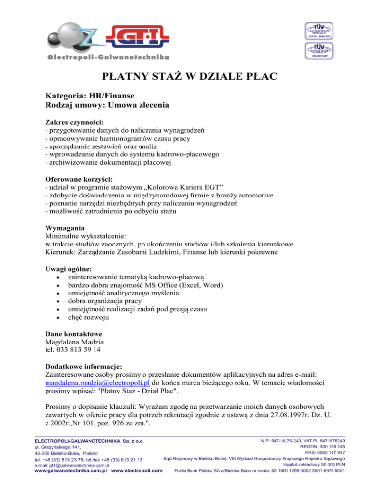 PŁATNY STAŻ W DZIALE PŁAC Kategoria: HR/Finanse Rodzaj umowy: Umowa zlecenia Zakres czynności: - przygotowanie danych do naliczania wynagrodzeń - opracowywanie harmonogramów czasu pracy - sporządzanie zestawień oraz analiz - wprowadzanie danych do systemu kadrowo-płacowego - archiwizowanie dokumentacji płacowej Oferowane korzyści: - udział w programie stażowym „Kolorowa Kariera EGT” - zdobycie doświadczenia w międzynarodowej firmie z branży automotive - poznanie narzędzi niezbędnych przy naliczaniu wynagrodzeń - możliwość zatrudnienia po odbyciu stażu Wymagania Minimalne wykształcenie: w trakcie studiów zaocznych, po ukończeniu studiów i/lub szkolenia kierunkowe Kierunek: Zarządzanie Zasobami Ludzkimi, Finanse lub kierunki pokrewne Uwagi ogólne: zainteresowanie tematyką kadrowo-płacową bardzo dobra znajomość MS Office (Excel, Word) umiejętność analitycznego myślenia dobra organizacja pracy umiejętność realizacji zadań pod presją czasu chęć rozwoju Dane kontaktowe Magdalena Madzia tel. 033 813 59 14 Dodatkowe informacje: Zainteresowane osoby prosimy o przesłanie dokumentów aplikacyjnych na adres e-mail: [email protected] do końca marca bieżącego roku. W temacie wiadomości prosimy wpisać: "Płatny Staż - Dział Płac". Prosimy o dopisanie klauzuli: Wyrażam zgodę na przetwarzanie moich danych osobowych zawartych w ofercie pracy dla potrzeb rekrutacji zgodnie z ustawą z dnia 27.08.1997r. Dz. U. z 2002r.,Nr 101, poz. 926 ze zm.". ELECTROPOLI-GALWANOTECHNIKA Sp. z o.o. ul. Grażyńskiego 141, 43-300 Bielsko-Biała, Poland tel. +48 (33) 813 23 78, tel./fax +48 (33) 813 21 13 NIP: 547-18-75-249, VAT PL 5471875249 REGON: 330 126 145 KRS: 0000 147 947 Sąd Rejonowy w Bielsku-Białej, VIII Wydział Gospodarczy Krajowego Rejestru Sądowego Kapitał zakładowy 50 000 PLN e-mail: [email protected] www.galwanotechnika.com.pl www.electropoli.com Fortis Bank Polska SA o/Bielsko-Biała nr konta: 63 1600 1299 0002 3501 6979 5001