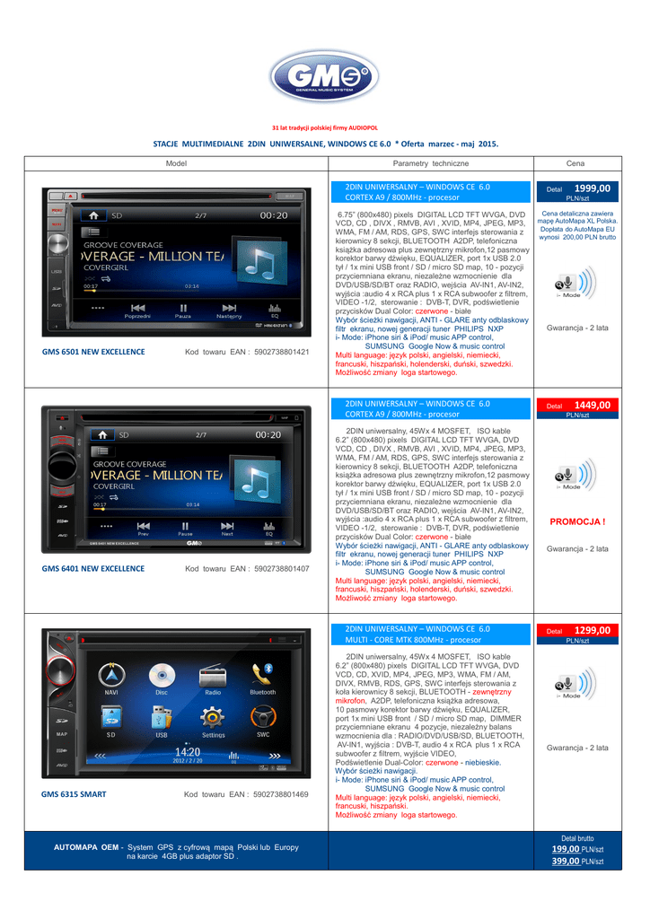 31 lat tradycji polskiej firmy AUDIOPOL STACJE MULTIMEDIALNE 2DIN UNIWERSALNE, WINDOWS CE 6.0 * Oferta marzec - maj 2015. Model Parametry techniczne 2DIN UNIWERSALNY – WINDOWS CE 6.0 CORTEX A9 / 800MHz - procesor GMS 6501 NEW EXCELLENCE Kod towaru EAN : 5902738801421 6.75” (800x480) pixels DIGITAL LCD TFT WVGA, DVD VCD, CD , DIVX , RMVB, AVI , XVID, MP4, JPEG, MP3, WMA, FM / AM, RDS, GPS, SWC interfejs sterowania z kierownicy 8 sekcji, BLUETOOTH A2DP, telefoniczna książka adresowa plus zewnętrzny mikrofon,12 pasmowy korektor barwy dźwięku, EQUALIZER, port 1x USB 2.0 tył / 1x mini USB front / SD / micro SD map, 10 - pozycji przyciemniana ekranu, niezależne wzmocnienie dla DVD/USB/SD/BT oraz RADIO, wejścia AV-IN1, AV-IN2, wyjścia :audio 4 x RCA plus 1 x RCA subwoofer z filtrem, VIDEO -1/2, sterowanie : DVB-T, DVR, podświetlenie przycisków Dual Color: czerwone - białe Wybór ścieżki nawigacji, ANTI - GLARE anty odblaskowy filtr ekranu, nowej generacji tuner PHILIPS NXP i- Mode: iPhone siri & iPod/ music APP control, SUMSUNG Google Now & music control Multi language: język polski, angielski, niemiecki, francuski, hiszpański, holenderski, duński, szwedzki. Możliwość zmiany loga startowego. 2DIN UNIWERSALNY – WINDOWS CE 6.0 CORTEX A9 / 800MHz - procesor GMS 6401 NEW EXCELLENCE Kod towaru EAN : 5902738801407 2DIN uniwersalny, 45Wx 4 MOSFET, ISO kable 6.2” (800x480) pixels DIGITAL LCD TFT WVGA, DVD VCD, CD , DIVX , RMVB, AVI , XVID, MP4, JPEG, MP3, WMA, FM / AM, RDS, GPS, SWC interfejs sterowania z kierownicy 8 sekcji, BLUETOOTH A2DP, telefoniczna książka adresowa plus zewnętrzny mikrofon,12 pasmowy korektor barwy dźwięku, EQUALIZER, port 1x USB 2.0 tył / 1x mini USB front / SD / micro SD map, 10 - pozycji przyciemniana ekranu, niezależne wzmocnienie dla DVD/USB/SD/BT oraz RADIO, wejścia AV-IN1, AV-IN2, wyjścia :audio 4 x RCA plus 1 x RCA subwoofer z filtrem, VIDEO -1/2, sterowanie : DVB-T, DVR, podświetlenie przycisków Dual Color: czerwone - białe Wybór ścieżki nawigacji, ANTI - GLARE anty odblaskowy filtr ekranu, nowej generacji tuner PHILIPS NXP i- Mode: iPhone siri & iPod/ music APP control, SUMSUNG Google Now & music control Multi language: język polski, angielski, niemiecki, francuski, hiszpański, holenderski, duński, szwedzki. Możliwość zmiany loga startowego. 2DIN UNIWERSALNY – WINDOWS CE 6.0 MULTI - CORE MTK 800MHz - procesor GMS 6315 SMART Kod towaru EAN : 5902738801469 2DIN uniwersalny, 45Wx 4 MOSFET, ISO kable 6.2” (800x480) pixels DIGITAL LCD TFT WVGA, DVD VCD, CD, XVID, MP4, JPEG, MP3, WMA, FM / AM, DIVX, RMVB, RDS, GPS, SWC interfejs sterowania z koła kierownicy 8 sekcji, BLUETOOTH - zewnętrzny mikrofon, A2DP, telefoniczna książka adresowa, 10 pasmowy korektor barwy dźwięku, EQUALIZER, port 1x mini USB front / SD / micro SD map, DIMMER przyciemniane ekranu 4 pozycje, niezależny balans wzmocnienia dla : RADIO/DVD/USB/SD, BLUETOOTH, AV-IN1, wyjścia : DVB-T, audio 4 x RCA plus 1 x RCA subwoofer z filtrem, wyjście VIDEO, Podświetlenie Dual-Color: czerwone - niebieskie. Wybór ścieżki nawigacji. i- Mode: iPhone siri & iPod/ music APP control, SUMSUNG Google Now & music control Multi language: język polski, angielski, niemiecki, francuski, hiszpański. Możliwość zmiany loga startowego. Cena Detal 1999,00 PLN/szt Cena detaliczna zawiera mapę AutoMapa XL Polska. Dopłata do AutoMapa EU wynosi 200,00 PLN brutto Gwarancja - 2 lata Detal 1449,00 PLN/szt PROMOCJA ! Gwarancja - 2 lata Detal 1299,00 PLN/szt Gwarancja - 2 lata Detal brutto AUTOMAPA OEM - System GPS z cyfrową mapą Polski lub Europy na karcie 4GB plus adaptor SD . 199,00 PLN/szt 399,00 PLN/szt 2DIN UNIWERSALNY – WINDOWS CE 6.0 MULTI - CORE MTK 800MHz - procesor GMS 6311 SMART 2DIN uniwersalny, 45Wx 4 MOSFET, ISO kable 6.2” (800x480) pixels DIGITAL LCD TFT WVGA, DVD, XVID, RMVB,MP4, JPEG, MP3, WMA, DIVX, FM / AM, RDS, GPS, SWC interfejs sterowania z koła kierownicy 8 sekcji, BLUETOOTH – wewnętrzny mikrofon, A2DP, telefoniczna książka adresowa, 10 pasmowy korektor barwy dźwięku, EQUALIZER, port 1x mini USB front / 2.0 USB tył / SD/ micro SD map, DIMMER – regulacja przyciemniania ekranu 4 pozycje, polskie i angielskie menu, niezależny balans wzmocnienia dla : RADIO/ /USB/ SD, BLUETOOTH, AV-IN1, AV-IN2 wyjścia :DVB-T, 4 x RCA, plus 1 x RCA subwoofer z filtrem, wyjście VIDEO, kamera Podświetlenie Dual-Color: czerwone - zielone Wybór ścieżki nawigacji. Kod towaru EAN : 5902738801575 2DIN uniwersalny, 45Wx 4 MOSFET, ISO kable 6.2” (800x480) pixels DIGITAL LCD TFT WVGA, XVID, RMVB,MP4, JPEG, MP3, WMA, DIVX, FM / AM, RDS, GPS, SWC interfejs sterowania z koła kierownicy 8 sekcji, BLUETOOTH – zewnętrzny mikrofon, A2DP, telefoniczna książka adresowa, 10 pasmowy korektor barwy dźwięku, EQUALIZER, port 2.0 USB front / tył, SD/ micro SD map, DIMMER – regulacja przyciemniania ekranu 4 pozycje, niezależny balans wzmocnienia dla : RADIO/ USB/ SD, BLUETOOTH, AV-IN1, AV-IN2 wyjścia :DVB-T, 4 x RCA, plus 1 x RCA subwoofer z filtrem, VIDEO, wejście na kamerę cofania. Podświetlenie Dual-Color: czerwone – zielone, wybór ścieżki nawigacji, iMode: iPhone siri & iPod/ music APP control, SUMSUNG Google Now & music, Multi language: język polski, angielski, niemiecki... ANTI - GLARE anty odblaskowy filtr ekranu Możliwość zmiany loga startowego. DVR – DIGITAL VIDEO RECORDER - cyfrowy rejestrator audio - video, kompatybilny ze stacjami GMS 6401 i GMS 6501 NEW EXCELLENCE. GMS CD-200C 720p, MJPEG, 1M pixels Sterowanie z ekranu dotykowego Automatyczne nagrywanie podczas jazdy. G -sensor, automatyczna pętla video Szybkie manualne sterowanie nagrywaniem Wysokiej jakości rejestracja obrazu i dźwięku Szeroki kąt widzenia 120 stopni Odtwarzanie obrazu w dowolnym momencie. Małe gabaryty, łatwy montaż. Akceptacja karty micro SDHC do 32GB. Format video AVI 720p, 30k/s. Napięcie zasilania: 9 -16V. Pobór prądu w czasie pracy: 150mA. Temperatur