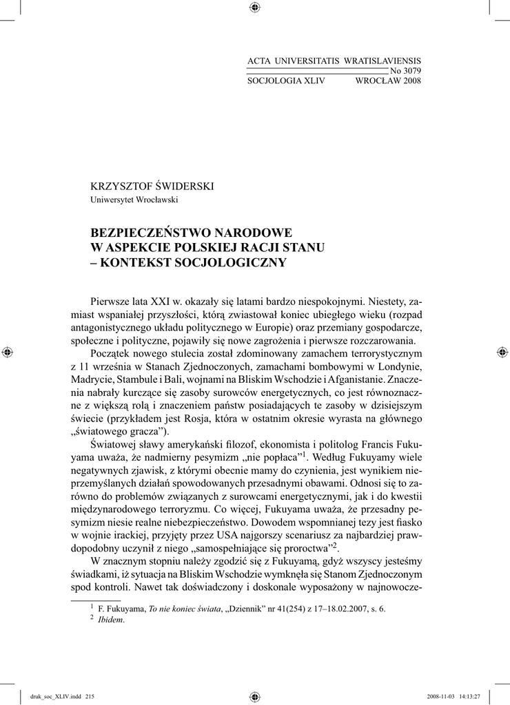 ACTA UNIVERSITATIS WRATISLAVIENSIS No 3079 SOCJOLOGIA XLIV WROCŁAW 2008 KRZYSZTOF ŚWIDERSKI Uniwersytet Wrocławski BEZPIECZEŃSTWO NARODOWE W ASPEKCIE POLSKIEJ RACJI STANU – KONTEKST SOCJOLOGICZNY Pierwsze lata XXI w. okazały się latami bardzo niespokojnymi. Niestety, zamiast wspaniałej przyszłości, którą zwiastował koniec ubiegłego wieku (rozpad antagonistycznego układu politycznego w Europie) oraz przemiany gospodarcze, społeczne i polityczne, pojawiły się nowe zagrożenia i pierwsze rozczarowania. Początek nowego stulecia został zdominowany zamachem terrorystycznym z 11 września w Stanach Zjednoczonych, zamachami bombowymi w Londynie, Madrycie, Stambule i Bali, wojnami na Bliskim Wschodzie i Afganistanie. Znaczenia nabrały kurczące się zasoby surowców energetycznych, co jest równoznaczne z większą rolą i znaczeniem państw posiadających te zasoby w dzisiejszym świecie (przykładem jest Rosja, która w ostatnim okresie wyrasta na głównego „światowego gracza”). Światowej sławy amerykański filozof, ekonomista i politolog Francis Fukuyama uważa, że nadmierny pesymizm „nie popłaca”1. Według Fukuyamy wiele negatywnych zjawisk, z którymi obecnie mamy do czynienia, jest wynikiem nieprzemyślanych działań spowodowanych przesadnymi obawami. Odnosi się to zarówno do problemów związanych z surowcami energetycznymi, jak i do kwestii międzynarodowego terroryzmu. Co więcej, Fukuyama uważa, że przesadny pesymizm niesie realne niebezpieczeństwo. Dowodem wspomnianej tezy jest fiasko w wojnie irackiej, przyjęty przez USA najgorszy scenariusz za najbardziej prawdopodobny uczynił z niego „samospełniające się proroctwa”2. W znacznym stopniu należy zgodzić się z Fukuyamą, gdyż wszyscy jesteśmy świadkami, iż sytuacja na Bliskim Wschodzie wymknęła się Stanom Zjednoczonym spod kontroli. Nawet tak doświadczony i doskonale wyposażony w najnowocze1 2 druk_soc_XLIV.indd 215 F. Fukuyama, To nie koniec świata, „Dziennik” nr 41(254) z 17–18.02.2007, s. 6. Ibidem. 2008-11-03 14:13:27 216 KRZYSZTOF ŚWIDERSKI śniejszy sprzęt wojskowy „światowy strażnik pokoju”, jakim są USA, nie przewidywał problemów, które wyniknęły z wojny w Iraku. Niestety, ze względu na znaczącą rolę Stanów Zjednoczonych we współczesnym świecie oraz dynamiczny rozwój globalizacji błędna polityka zagraniczna prezydenta Busha bezpośrednio przekłada się nie tylko na stabilizację w rejonach objętych walkami, ale także na światowe bezpieczeństwo. Wymownym potwierdzeniem tej tezy są wyniki sondażu przeprowadzonego przez magazyn „Stern” w Niemczech. Prawie połowa Niemców (48%) jest zdania, że polityka prowadzona przez Amerykanów może spowodować więcej kłopotów niż atomowe ambicje irańskich ajatollahów3. Początek XXI w. jest czasem wielu zagrożeń i wyzwań, nie dziwi więc, że współcześnie często słyszymy lub spotykamy się w różnych sytuacjach z terminem „bezpieczeństwa narodowego”. Coraz częściej wszelkie działania rządów, szczególnie te mało popularne wśród społeczeństwa są usprawiedliwiane słowami „dla dobra bezpieczeństwa narodowego”. Jest to „słowo-klucz”, które w dobie nieustających zagrożeń jest gwarantem wszelkich działań rządów. Ale czy jest to wystarczający powód, aby unikać merytorycznych dyskusji na tematy dotyczące bezpieczeństwa państwa i narodu? Braku podjęcia próby uzasadnienia prowadzonej przez rząd polityki, często przez społeczeństwo zupełnie niezrozumianej? Przystępując do rozważań poświęconych bezpieczeństwu narodowemu i dokładnemu zrozumieniu problematyki związanej z bezpieczeństwem narodowym, należy dokładnie sprecyzować, co kryje się pod wspomnianym pojęciem. Bezpieczeństwo (securitas) to termin składający się z dwóch członów since (bez) oraz cura (zmartwienie, strach, obawa)4. Tak więc bezpieczeństwo oznacza brak zmartwień, strachu i wszelkich obaw. Zastosowany w ten sposób termin dotyczy nie tylko jednostek, ale i całych społeczeństw. W słownikach współczesnych „bezpieczeństwo” oznacza stan braku zagrożenia, spokoju, pewności lub stan psychiczny czy też prawny, w którym jednostka ma poczucie pewności, oparcie w drugiej osobie lub w sprawnie działającym systemie prawnym5. Inne rozumienie „bezpieczeństwa” prezentuje R. Zięba, który wskazuje na dwa ujęcia tego terminu. Pierwsze, nazwane negatywnym (którego twórcą był J.S. Nye), traktuje bezpieczeństwo jako brak zagrożeń, które skoncentrowane jest na ochronie podmiotu przed zagrożeniami dla jego wewnętrznych wartości. Drugie ujęcie, pozytywne, postrzega kształtowanie pewności przetrwania, posiadania i swobód rozwoju podmiotu6. 3 R. Woś, Niemcy boją się Ameryki, „Dziennik” nr 77(291), 2007, s. 10. J. Maciejewski, Bezpieczeństwo narodowe a oficerowie Wojska Polskiego, [w:] Socjologiczne aspekty bezpieczeństwa narodowego, J. Maciejewski (red.), Wrocław 2001, s. 19. 5 L. Korzeniowski, Obiektywne a subiektywne kategorie bezpieczeństwa narodowego, [w:] Bezpieczeństwo narodowe a grupy dyspozycyjne, J. Maciejewski, O. Nowaczyk (red.), Wrocław 2005, s. 21. 6 Ibidem, s. 22. 4 druk_soc_XLIV.indd 216 2008-11-03 14:13:27 Bezpieczeństwo narodowe a polska racja stanu 217 Z kolei „bezpieczeństwo narodowe” według Encyklopedii Britannica oznacza zabezpieczenie narodu przed groźbą podboju przez zewnętrzną potęgę – takie samo zabezpieczenie życiowych praw i interesów kraju w stosunkach międzynarodowych, jakimi cieszą się obywatele każdej dobrze zorganizowanej wspólnoty narodowej w jej stosunkach interpersonalnych7. „Bezpieczeństwo narodowe” nazywane również bezpieczeństwem państwa rozumiane jest także jako jedna z podstawowych funkcji każdego państwa, obejmująca problematykę przeciwstawienia się wszelkim zagrożeniom zewnętrznym oraz wewnętrznym dla istnienia i rozwoju narodu oraz państwa