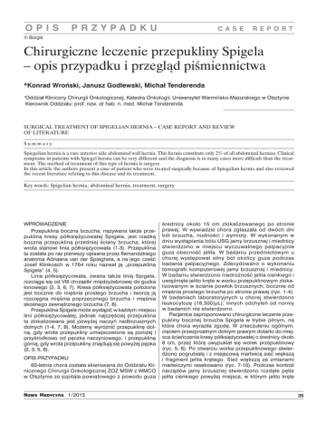 opis przypadku case report © Borgis Chirurgiczne leczenie przepukliny Spigela – opis przypadku i przegląd piśmiennictwa *Konrad Wroński, Janusz Godlewski, Michał Tenderenda Oddział Kliniczny Chirurgii Onkologicznej, Katedra Onkologii, Uniwersytet Warmińsko-Mazurskiego w Olsztynie Kierownik Oddziału: prof. nzw. dr hab. n. med. Michał Tenderenda 1 Surgical treatment of spigelian hernia – case report and review of literature Summary Spiegelian hernia is a rare anterior side abdominal wall hernia. This hernia constitute only 2% of all abdominal hernias. Clinical symptoms in patients with Spiegel hernia can be very different and the diagnosis is in many cases more difficult than the treatment. The method of treatment of this type of hernia is surgery. In this article the authors present a case of patient who were treated surgically because of Spiegelian hernia and also reviewed the recent literature relating to this disease and its treatment. Key words: Spigelian hernia, abdominal hernia, treatment, surgery WPROWADZENIE Przepuklina boczna brzucha, nazywana także przepukliną kresy półksiężycowatej Spigela, jest rzadką boczną przepukliną przedniej ściany brzucha, której wrota stanowi linia półksiężycowata (1-3). Przepuklina ta została po raz pierwszy opisana przez flamandzkiego anatoma Adriaana van der Spieghela, a na jego cześć Josef Klinkosch w 1764 roku nazwał ją „przepukliną Spigela” (4, 5). Linia półksiężycowata, zwana także linią Spigela, rozciąga się od VIII chrząstki międzyżebrowej do guzka łonowego (2, 3, 6, 7). Kresa półksiężycowata położona jest bocznie do mięśnia prostego brzucha i tworzą ją rozcięgna mięśnia poprzecznego brzucha i mięśnia skośnego zewnętrznego brzucha (7, 8). Przepuklina Spigela może wystąpić w każdym miejscu linii półksiężycowatej, jednak najczęściej przepuklina ta zlokalizowana jest powyżej naczyń nadbrzusznych dolnych (1-4, 7, 8). Możemy wyróżnić przepuklinę dolną, gdy wrota przepukliny umiejscowione są poniżej i przyśrodkowo od pęczka naczyniowego, i przepuklinę górną, gdy wrota przepukliny znajdują się powyżej pępka (2, 3, 5, 6). OPIS PRZYPADKU 60-letnia chora została skierowana do Oddziału Klinicznego Chirurgii Onkologicznej ZOZ MSW z WMCO w Olsztynie ze szpitala powiatowego z powodu guza Nowa Medycyna 1/2013 średnicy około 15 cm zlokalizowanego po stronie prawej. W wywiadzie chora zgłaszała od dwóch dni ból brzucha, nudności i wymioty. W wykonanym w dniu wystąpienia bólu USG jamy brzusznej i miednicy stwierdzono w miejscu wyczuwalnego palpacyjnie guza obecność jelita. W badaniu przedmiotowym u chorej występował silny ból okolicy guza podczas badania palpacyjnego. Zdecydowano o wykonaniu tomografii komputerowej jamy brzusznej i miednicy. W badaniu stwierdzono niedrożność jelita cienkiego i uwięźnięte jelito kręte w worku przepuklinowym zlokalizowanym w ścianie powłok brzusznych, bocznie od mięśnia prostego brzucha po stronie prawej (ryc. 1-4). W badaniach laboratoryjnych u chorej stwierdzono leukocytozę (18,300/μL); innych odchyleń od normy w badanich nie stwierdzono. Pacjentce zaproponowano chirurgiczne leczenie przepukliny bocznej brzucha Spigela w trybie pilnym, na które chora wyraziła zgodę. W znieczuleniu ogólnym, cięciem przezprostnym dolnym prawym dotarto do miejsca ścieńczenia kresy półksiężycowatej o średnicy około 8 cm, przez którą uwypuklał się worek przepuklinowy (ryc. 5, 6). Po otwarciu worka przepuklinowego stwierdzono pogrubiałą i z miejscową martwicą sieć większą i fragment jelita krętego. Sieć większą ze zmianami martwiczymi resekowano (ryc. 7-10). Podczas kontroli narządów jamy brzusznej stwierdzono rozdęte pętle jelita cienkiego powyżej miejsca, w którym jelito kręte 35 Konrad Wroński, Janusz Godlewski, Michał Tenderenda 36 wchodziło do worka przepuklinowego, a na ścianie w jelicie wchodzącym do worka przepuklinowego stwierdzono punktowe zmiany niedokrwienne, które nie były wskazaniem do wykonania resekcji jelita cienkiego (ryc. 11). Otrzewną zeszyto szwem ciągłym, a następnie wszczepiono siatkę z tworzywa sztucznego (ryc. 12). Powięź zamknięto szwami pojedynczymi. Przebieg pooperacyjny był niepowikłany. Gojenie rany pooperacyjnej prawidłowe. Chorą wypisano do domu w stanie ogólnym dobrym. Ryc. 1. Skan z tomografii komputerowej przedstawiający przepuklinę boczną brzucha Spigela i niedrożność jelita cienkiego u 60-letniej chorej. Ryc. 4. Skan z tomografii komputerowej przedstawiający w powiększeniu wrota przepukliny bocznej brzucha Spigela u 60-letniej chorej. Ryc. 2. Skan z tomografii komputerowej przedstawiający wrota przepukliny bocznej brzucha Spigela i niedrożność jelita cienkiego. Ryc. 5. Zdjęcie wykonane przed zabiegiem operacyjnym przedstawiające badany palpacyjnie guz w ścianie powłok brzusznych. Ryc. 3. Skan z tomografii komputerowej z widoczną przepukliną boczną brzucha Spigela. Ryc. 6. Zdjęcie wykonane śródoperacyjnie z widocznym workiem przepuklinowym. 1/2013 Nowa Medycyna Chirurgiczne leczenie przepukliny Spigela – opis przypadku i przegląd piśmiennictwa Ryc. 7. Zdjęcie wykonane po otwarciu worka przepuklinowego z widoczną w nim siecią większą. Ryc. 10. Zdjęcie przedstawiające fragment resekowanej sieci większej z ogniskami martwicy. Ryc. 8. Zdjęcie wykonane śródoperacyjnie przedstawiające pogrubiałą i z miejscową martwicą sieć większą znajdującą się w worku przepuklinowym. Ryc. 11. Zdjęcie przedstawiające trzy ogniska niedokrwienia ściany jelita krętego w miejscu wnikania jelita do worka przepuklinowego. Ryc. 9. Zdjęcie przedstawiające resekcję fragmentu sieci większej, która znajdowała się w worku przepuklinowym. Ryc. 12. Zdjęcie wykonane śródoperacyjnie przedstawiające wszczepienie siatki z tworzywa sztucznego. OMÓWIENIE Przepuklina boczna brzucha stanowi około 1-2% wszystkich przepu