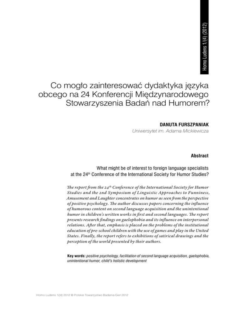 Homo Ludens 1/(4) (2012) Co mogło zainteresować dydaktyka języka obcego na 24 Konferencji Międzynarodowego Stowarzyszenia Badań nad Humorem? Danuta Furszpaniak Uniwersytet im. Adama Mickiewicza Abstract What might be of interest to foreign language specialists at the 24 Conference of the International Society for Humor Studies? th The report from the 24th Conference of the International Society for Humor Studies and the 2nd Symposium of Linguistic Approaches to Funniness, Amusement and Laughter concentrates on humor as seen from the perspective of positive psychology. The author discusses papers concerning the influence of humorous content on second language acquisition and the unintentional humor in children’s written works in first and second languages. The report presents research findings on gaelophobia and its influence on interpersonal relations. After that, emphasis is placed on the problems of the institutional education of pre-school children with the use of games and play in the United States. Finally, the report refers to exhibitions of satirical drawings and the perception of the world presented by their authors. Key words: positive psychology, facilitation of second language acquisition, gaelophobia, unintentional humor, child’s holistic development Homo Ludens 1/(4) 2012 © Polskie Towarzystwo Badania Gier 2012 244 Danuta Furszpaniak Od 25 do 29 czerwca na Uniwersytecie Jagiellońskim miały miejsce: Dwudziesta Czwarta Konferencja International Society for Humor Studies (ISHS) i Drugie Sympozjum Linguistic Approaches to Funniness, Amusement and Laughter, poprzedzone jednodniowym cyklem tutorali wprowadzających do zagadnienia żartu i humoru z perspektywy nauk humanistycznych i ścisłych. W czasie konferencji blisko 200 badaczy humoru z około 50 krajów przedstawiło wyniki badań naukowych oraz podzieliło się doświadczeniem stosowania humoru w pracy zawodowej: w dziedzinie psychologii, socjologii, filozofii, medycyny, mediów, polityki, dziennikarstwa, kultury, historii, edukacji, literatury, językoznawstwa, muzyki, teatru, stand up, filmu, sztuk plastycznych, sportu, turystyki, w muzealnictwie, wolontariacie oraz w życiu prywatnym. W niniejszym sprawozdaniu skupię uwagę na referatach dotyczących ujęcia humoru z punktu widzenia psychologii pozytywnej, wpływu treści humorystycznych na przyswajanie języka obcego, zjawisku humoru niezamierzonego w pisemnych wypowiedziach dzieci uczących się drugiego języka, gelotofobii oraz zinstytucjonalizowanej edukacji najmłodszych dzieci z wykorzystaniem gier i zabaw. Inauguracyjny referat Humor and positive psychology: Where it fits and where it doesn’t („Humor i psychologia pozytywna. Płaszczyzny współistnienia”) wygłosił przewodniczący ISHS prof. Willibald Ruch. Treść wystąpienia stanowiła często niewidzialną kanwę prawie dwustu godzin referatów, dyskusji i wspólnie spędzonego czasu przez uczestników konferencji. Prelegent zwrócił uwagę na to, że badania psychologii pozytywnej koncentrują się na trzech zagadnieniach: 1. na pozytywnym, podmiotowym doświadczeniu emocji (na przykład szczęścia, zadowolenia, miłości, odczucia satysfakcji w teraźniejszości; wdzięczności w nawiązaniu do przeszłości; nadziei w relacji do przyszłości); 2. na pozytywnych cechach charakteru (tzw. siłach charakteru, cnotach i talentach); 3. na pozytywnych instytucjach (stwarzających warunki pozwalające jednostce na pełen rozwój osobowy i interpersonalny). Celem psychologii pozytywnej nie jest badanie patologii, by minimalizować negatywne emocje i stany, ale prowadzenie badań mających na celu poznanie sił charakteru i uzdolnień jednostek tak, by móc im pomagać rozwijać to, co jest w nich najlepsze i naprawiać to, co złe. Przyjmuje się istnienie dwudziestu czterech sił charakteru składających się na cnoty: mądrości i wiedzy, męstwa, człowieczeństwa, sprawiedliwości, umiarkowania i transcendencji. Humor wraz z docenieniem piękna i doskonałości, wdzięcznością, nadzieją, religijnością i duchowością należy do cnoty transcendencji. Będąc w swej istocie zjawiHomo Ludens 1/(4) 2012 © Polskie Towarzystwo Badania Gier 2012 Co mogło zainteresować dydaktyka języka obcego na 24 Konferencji… 245 skiem neutralnym, pozostaje w relacjach ze wszystkimi cnotami. Dla przykładu: humorystyczne ujęcie tematu pomaga nabywać, utrwalać i używać wiedzę, żartobliwość i fantazja ułatwiają tworzenie więzów społecznych, umiarkowanie i sprawiedliwość ograniczają niegodziwe i dosadne formy humoru. Wytrwałość wzmocniona humorem rodzi męstwo, transcendencja realizowana poprzez żartobliwość – podobnie jak nadzieja i duchowość (wiara) – łączy człowieka z czymś większym we wszechświecie i pozwala przekraczać własne ograniczenia (Peterson, 2004). Badania wykazały, że humor klasyfikuje się na siódmej pozycji sił charakteru mających wpływ na satysfakcjonujące życie – po nadziei, zapale, miłości, ciekawości, wdzięczności i wytrwałości. Ze wzrostem poziomu humoru wprost proporcjonalnie zwiększa się satysfakcja życiowa człowieka. Poszukując odpowiedzi na pytanie, czym jest dobre życie, Seligman (2004) wyróżnił życie ukierunkowane na przyjemność (jeśli dla człowieka najważniejsze jest osiągnięcie euforii i przyjemności), życie ukierunkowane na działanie (jeśli człowiek znajduje szczęście w działaniu i podejmowaniu wyzwań), życie ukierunkowane na znaczenie (jeśli człowiek uważa, że życie służy wyższemu celowi i ma znaczenie trwałe). Nieco później Seligman (2011) zaproponował nową teorię dobrego życia, według której rezultatem jest flourishing – rozkwit człowieka w domenach pozytywnych emocji, zaangażowania, pozytywnych relacji, znaczenia i osiągnięć. Humor, mający udział w każdej z nich, jest korzystny dla rozwoju zdrowia fizycznego i psychicznego, przyczynia się do powstawania i zacie