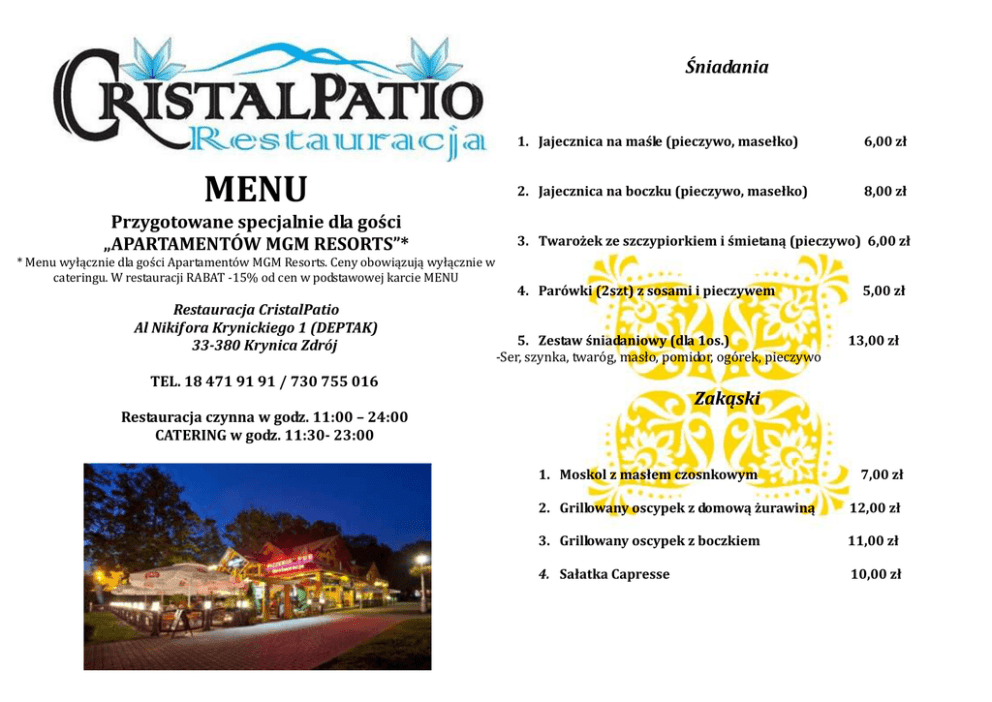 Śniadania MENU Przygotowane specjalnie dla gości „APARTAMENTÓW MGM RESORTS”* * Menu wyłącznie dla gości Apartamentów MGM Resorts. Ceny obowiązują wyłącznie w cateringu. W restauracji RABAT -15% od cen w podstawowej karcie MENU Restauracja CristalPatio Al Nikifora Krynickiego 1 (DEPTAK) 33-380 Krynica Zdrój 1. Jajecznica na maśle (pieczywo, masełko) 6,00 zł 2. Jajecznica na boczku (pieczywo, masełko) 8,00 zł 3. Twarożek ze szczypiorkiem i śmietaną (pieczywo) 6,00 zł 4. Parówki (2szt) z sosami i pieczywem 5. Zestaw śniadaniowy (dla 1os.) -Ser, szynka, twaróg, masło, pomidor, ogórek, pieczywo TEL. 18 471 91 91 / 730 755 016 5,00 zł 13,00 zł Zakąski Restauracja czynna w godz. 11:00 – 24:00 CATERING w godz. 11:30- 23:00 1. Moskol z masłem czosnkowym 7,00 zł 2. Grillowany oscypek z domową żurawiną 12,00 zł 3. Grillowany oscypek z boczkiem 11,00 zł 4. Sałatka Capresse 10,00 zł Zupy Ryby 1.Rosół królewski 8,00 zł 2.Zupa pomidorowa z ryżem 8,00 zł 3. Kwaśnica krynicka z żeberkiem 11,00 zł 4. Żur na borowikach z białą kiełbasą 10,00 zł 5. Barszcz czerwony z uszkami 10,00 zł 6. Krem z cukinii 9,00 zł Dania Mięsne 29,00 zł 2. Smażony pstrąg krynicki nadziewany oscypkiem i bryndzą - z opiekanymi ziemniakami i zestawem surówek 31,00 zł 3. Sola panierowana -z frytkami I zestawem surówek 25,00 zł Dania Mączne 1. Polędwiczki wieprzowe w sosie borowikowym -z ryżem I zestawem surówek 35,00 zł 2. Panierowany kotlet schabowy z patelni – z ziemniakami puree I zasmażaną kapustą 28,00 zł 3. Żeberka wieprzowe glazurowane miodem 35,00 zł -z opiekanymi ziemniakami i czerwoną kapustą na ciepło 4. Filet z kurczaka w chrupiącej panierce -z frytkami i zestawem surówek 1. Smażony pstrąg górski z masłem czosnkowym -z opiekanymi ziemniakami i zestawem surówek 25,00 zł 1. Placki ziemniaczane po Krynicku 19,00 zł -Placki ziemniaczane (2 szt.) podawane z gulaszem wieprzowym, łyżką śmietany 2. Placki ziemniaczane leśne 21,00 zł -Placki ziemniaczane (2 szt.) podawane z sosem borowikowym, łyżką śmietany 3. Placki ziemniaczane Cristal 23,00 zł -Placki ziemniaczane (2szt.) podawane z wędzonym łososiem, łyżką śmietany, posypana cytrynowym pieprzem z karmelizowaną gruszką 5. Kotlet de volaille - z gotowanymi ziemniakami I zestawem surówek 26,00 zł 6. Grillowany schab z boczkiem I oscypkiem -z frytkami I zasmażaną kapustą 28,00 zł 4. Naleśniki z serem (2szt) 12,00 zł -Naleśniki z białym serem na słodko polane sosem truskawkowym i bitą śmietaną 7. Stek wołowy - z opiekanymi ziemniakami I zestawem surówek 49,00 zł 5. Naleśniki z czekoladą (2 szt.) 11,00 zł -Naleśniki z czekoladą polane sosem toffi I bitą śmietaną Pierogi domowe (9 szt.) Zestawy dziecięce 1. Pierogi z serem ze słodką śmietanką i cukrem pudrem 12,00 zł 1. Nuggetsy drobiowe 18,00 zł -Filet drobiowy w cieście naleśnikowym z frytkami i surówką z marchwi 2. Pierogi z siekanymi borowikami 22,00 zł 3. Pierogi z rydzami 2. Kluski leniwe 21,00 zł -Ręcznie wyrabiane kluseczki serwowane na słodko 4. Pierogi ruskie z kefirem 14,00 zł 5. Pierogi nadziewane mięsem 13,00 zł 3. Pizza „Piotruś Pan” -Pizza 15cm. Sos pomidorowy, ser ,szynka 8,00 zł 12,00 zł Sałatki 1. Sałatka Grecka -Świeży ogórek, pomidor, papryka,cebula,oliwki,ser feta ,sos „ogrodowy” 14,00 zł 2. Sałatka Cayenne Cesar -Sałata, świeży ogórek, pomidor, papryka, oliwki, grillowane polędwiczki drobiowe, sos curry 18,00 zł Desery 1. Szarlotka 7,00 zł -Tradycyjna szarlotka wypiekana sposobem domowym w kuchni Cristalpatio podawana z owocami i bitą śmietaną 2. Sernik z konfiturą malinową 3. Sałatka Cristalpatio 17,00 zł -Sałatka, świeży ogórek, pomidor, papryka, grillowany oscypek , sos czosnkowy 3. Chrupiąca kostka wiśniowo- czekoladowa 8,00 zł 10,00 zł 4. Sałatka Salomon -Sałata , wędzony łosoś, pomidor , dressing chrzanowy 20,00 zł * Menu wyłącznie dla gości Apartamentów MGM Resorts. Ceny obowiązują wyłącznie w cateringu. W restauracji RABAT -15% od cen w podstawowej karcie MENU 5. Sałatka Caridera -Sałata, świeży ogórek, pomidor, papryka, oliwki, krewetki, sos czosnkowy 22,00 zł Manager Restauracji CristalPatio tel. 793-999-879 Istnieje możliwość ustalenia innych godzin dowozu