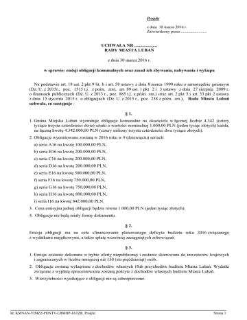 Projekt z dnia 18 marca 2016 r. Zatwierdzony przez ......................... UCHWAŁA NR .................... RADY MIASTA LUBAŃ z dnia 30 marca 2016 r. w sprawie: emisji obligacji komunalnych oraz zasad ich zbywania, nabywania i wykupu Na podstawie art. 18 ust. 2 pkt 9 lit. b i art. 58 ustawy z dnia 8 marca 1990 roku o samorządzie gminnym (Dz. U. z 2015r., poz. 1515 t.j. z poźn. zm), art. 89 ust. 1 pkt 2 i 3 ustawy z dnia 27 sierpnia 2009 r. o finansach publicznych (Dz. U. z 2013 r., poz. 885 t.j. z późn. zm.) oraz art. 2 pkt 5 i art. 33 pkt 2 ustawy z dnia 15 stycznia 2015 r. o obligacjach (Dz. U. z 2015 r., poz. 238 z późn. zm.), Rada Miasta Lubań uchwala, co następuje : § 1. 1. Gmina Miejska Lubań wyemituje obligacje komunalne na okaziciela w łącznej liczbie 4.342 (cztery tysiące trzysta czterdzieści dwie) sztuki o wartości nominalnej 1.000,00 PLN (jeden tysiąc złotych) każda, na łączną kwotę 4.342.000,00 PLN (cztery miliony trzysta czterdzieści dwa tysiące złotych). 2. Obligacje wyemitowane zostaną w 2016 roku w 9 (dziewięciu) seriach: a) seria A16 na kwotę 100.000,00 PLN, b) seria B16 na kwotę 200.000,00 PLN, c) seria C16 na kwotę 200.000,00 PLN, d) seria D16 na kwotę 200.000,00 PLN, e) seria E16 na kwotę 500.000,00 PLN, f) seria F16 na kwotę 750.000,00 PLN, g) seria G16 na kwotę 750.000,00 PLN, h) seria H16 na kwotę 800.000,00 PLN, i) seria I16 na kwotę 842.000,00 PLN. 3. Cena emisyjna jednej obligacji będzie równa 1.000,00 PLN (jeden tysiąc złotych). 4. Obligacje nie będą miały formy dokumentu. § 2. Emisja obligacji ma na celu sfinansowanie planowanego deficytu budżetu roku 2016 związanego z wydatkami majątkowymi, a także spłatę wcześniej zaciągniętych zobowiązań. § 3. 1. Emisja zostanie dokonana w trybie oferty niepublicznej i zostanie skierowana do inwestorów krajowych i zagranicznych w liczbie mniejszej niż 150 (sto pięćdziesiąt) osób. 2. Obligacje zostaną wykupione z dochodów własnych i/lub przychodów budżetu Miasta Lubań. Wydatki związane z wypłatą oprocentowania zostaną pokryte z dochodów własnych budżetu Miasta Lubań. 3. Wierzytelności wynikające z obligacji nie są zabezpieczone. Id: KMNAN-YIMZZ-PDNTV-LBMHP-JATZR. Projekt Strona 1 § 4. 1. Oprocentowanie obligacji będzie zmienne, równe stawce WIBOR 6M, ustalonej na dwa dni robocze przed rozpoczęciem okresu odsetkowego, powiększonej o marżę dla inwestorów. 2. Oprocentowanie ustala się i wypłaca w okresach półrocznych liczonych od daty emisji z zastrzeżeniem, że pierwszy okres odsetkowy może trwać maksymalnie dwanaście miesięcy. Odsetki za dany okres odsetkowy są wypłacane w następnym dniu po upływie okresu odsetkowego. 3. Jeżeli data wypłaty odsetek przypada na sobotę lub dzień ustawowo wolny od pracy to wypłata odsetek nastąpi w najbliższym dniu roboczym przypadającym po tym dniu. § 5. 1. Obligacji zostaną wykupione w następujących terminach: a) obligacje serii A16 zostaną wykupione w 2020 roku, b) obligacje serii B16 zostaną wykupione w 2021 roku, c) obligacje serii C16 zostaną wykupione w 2022 roku, d) obligacje serii D16 zostaną wykupione w 2023 roku, e) obligacje serii E16 zostaną wykupione w 2024 roku, f) obligacje serii F16 zostaną wykupione w 2025 roku, g) obligacje serii G16 zostaną wykupione w 2026 roku, h) obligacje serii H16 zostaną wykupione w 2027 roku, i) obligacje serii I16 zostaną wykupione w 2028 roku. 2. Obligacje zostaną wykupione według wartości nominalnej. 3. Jeżeli data wykupu przypada na sobotę lub dzień ustawowo wolny od pracy to wykup obligacji nastąpi w najbliższym dniu roboczym przypadającym po tym dniu. 4. Dopuszcza się możliwość nabycia przez Emitenta obligacji dowolnej serii przed terminem wykupu w celu ich umorzenia. 5. Terminy i tryb umorzenia określi Burmistrz Miasta Lubań. § 6. Wykonanie uchwały powierza się Burmistrzowi Miasta Lubań. § 7. Uchwała wchodzi w życie z dniem podjęcia. Id: KMNAN-YIMZZ-PDNTV-LBMHP-JATZR. Projekt Strona 2 Uzasadnienie do Uchwały Nr .................... Rady Miasta Lubań z dnia 30 marca 2016 r. w sprawie emisji obligacji komunalnych oraz zasad ich zbywania, nabywania i wykupu Niniejsza uchwała Rady Miasta Lubań stanowi formalny początek i podstawę prawną procedury uruchamiania emisji obligacji w trybie emisji niepublicznej. Obligacje komunalne to papiery wartościowe emitowane przez jednostkę samorządu terytorialnego. Jednostka samorządowa otrzymuje od nabywców obligacji środki pieniężne, natomiast sama jest zobowiązana do zapłaty obligatariuszom odsetek i wykupu obligacji po określonym czasie. Emisja obligacji ma na celu pozyskanie środków pieniężnych na pokrycie deficytu budżetowego wynikającego z planowanych do realizacji zadań inwestycyjnych w 2016 roku, a także spłatę wcześniej zaciągniętych zobowiązań. Obligacje w swej istocie spełniają funkcję kredytu, jednak są dla Miasta bardziej korzystne niż tradycyjny komercyjny kredyt bankowy. Zasadniczym atutem obligacji jest ich elastyczność. Instrument ten daje możliwość określenia takich terminów wykupu (spłaty kapitału), które zapewniają bezpieczeństwo w zakresie płynności finansowej budżetu. Niniejsza uchwała Rady Miasta w sprawie emisji obligacji określa ogólne warunki emisji. Uchwała określa m. in. wielkość emisji, podział na serie, długość życia poszczególnych obligacji, sposób emisji. Ogólne określenie warunków emisji obligacji jest niezbędne w celu przeprowadzenia postępowania na wybór agenta emisji obligacji, czyli podmiotu, który będzie organizatorem, depozytariuszem i gwarantem emisji. Uchwała ta określa przedmiot zamówienia, zakreślając równocześnie granice, w których oferenci mogą przygotowywać swoje oferty. Id: KMNAN-YIMZZ-PDNTV-LBMHP-JATZR. Projekt Strona 1