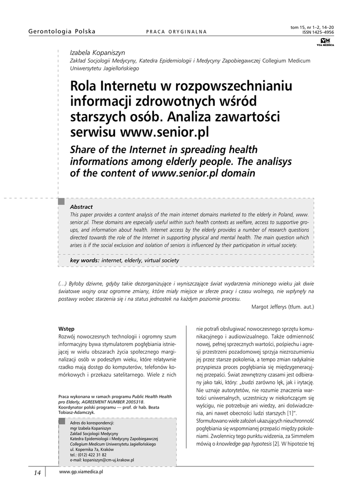 Gerontologia Polska PRACA ORYGINALNA tom 15, nr 1–2, 14–20 ISSN 1425–4956 Izabela Kopaniszyn Zakład Socjologii Medycyny, Katedra Epidemiologii i Medycyny Zapobiegawczej Collegium Medicum Uniwersytetu Jagiellońskiego Rola Internetu w rozpowszechnianiu informacji zdrowotnych wśród starszych osób. Analiza zawartości serwisu www.senior.pl Share of the Internet in spreading health informations among elderly people. The analisys of the content of www.senior.pl domain Abstract This paper provides a content analysis of the main internet domains marketed to the elderly in Poland, www. senior.pl. These domains are especially useful within such health contexts as welfare, access to supportive groups, and information about health. Internet access by the elderly provides a number of research questions directed towards the role of the Internet in supporting physical and mental health. The main question which arises is if the social exclusion and isolation of seniors is influenced by their participation in virtual society. key words: internet, elderly, virtual society (…) Byłoby dziwne, gdyby takie dezorganizujące i wyniszczające świat wydarzenia minionego wieku jak dwie światowe wojny oraz ogromne zmiany, które miały miejsce w sferze pracy i czasu wolnego, nie wpłynęły na postawy wobec starzenia się i na status jednostek na każdym poziomie procesu. Margot Jefferys (tłum. aut.) Wstęp Rozwój nowoczesnych technologii i ogromny szum informacyjny bywa stymulatorem pogłębiania istniejącej w wielu obszarach życia społecznego marginalizacji osób w podeszłym wieku, które relatywnie rzadko mają dostęp do komputerów, telefonów komórkowych i przekazu satelitarnego. Wiele z nich Praca wykonana w ramach programu Public Health Health pro Elderly, AGREEMENT NUMBER 2005318. Koordynator polski programu — prof. dr hab. Beata Tobiasz-Adamczyk. Adres do korespondencji: mgr Izabela Kopaniszyn Zakład Socjologii Medycyny Katedra Epidemiologii i Medycyny Zapobiegawczej Collegium Medicum Uniwersytetu Jagiellońskiego ul. Kopernika 7a, Kraków tel.: (012) 422 31 82 e-mail: [email protected] 14 www.gp.viamedica.pl nie potrafi obsługiwać nowoczesnego sprzętu komunikacyjnego i audiowizualnego. Także odmienność nowej, pełnej sprzecznych wartości, pośpiechu i agresji przestrzeni pozadomowej sprzyja niezrozumieniu jej przez starsze pokolenia, a tempo zmian radykalnie przyspiesza proces pogłębiania się międzygeneracyjnej przepaści. Świat zewnętrzny czasami jest odbierany jako taki, który: „budzi zarówno lęk, jak i irytację. Nie uznaje autorytetów, nie rozumie znaczenia wartości uniwersalnych, uczestniczy w niekończącym się wyścigu, nie potrzebuje ani wiedzy, ani doświadczenia, ani nawet obecności ludzi starszych [1]”. Sformułowano wiele założeń ukazujących nieuchronność pogłębiania się wspomnianej przepaści między pokoleniami. Zwolennicy tego punktu widzenia, za Simmelem mówią o knowledge gap hypotesis [2]. W hipotezie tej Izabela Kopaniszyn, Internet a informacje zdrowotne wśród osób starszych kładzie się nacisk na zależność w przyswajaniu nowych technologii od statusu społeczno-ekonomicznego. Mówi się zatem o nierównościach cyfrowych1, zwłaszcza istotnych w zakresie korzystania z Internetu jako medium interaktywnego — służącego nie tylko percepcji treści, ale ich wytwarzaniu i przetwarzaniu [2, 3]. W związku z tym w literaturze gerontologicznej wyraźnie zaznacza swoją obecność problem wykluczenia społecznego seniorów, także w obszarze uczestnictwa w społeczeństwie nowych technologii [1, 4]2 . Dlatego istotna wydaje się systematyczna obserwacja grupy seniorów, którym udało się te nierówności pokonać. Pogłębione zainteresowanie ich aktywnością ze strony gerontologów oraz specjalistów promocji zdrowia ma szanse przyczynić się do wypracowania modeli replikacji zachowań pozwalających starszym osobom skutecznie dołączać do reszty społeczeństwa w korzystaniu z Internetu, zmieniając tym samym zarówno styl życia, jak i jego jakość. Według badań CBOS z 2006 roku w Polsce coraz więcej osób w podeszłym wieku korzysta z możliwości, jakie daje sieć — Internetu używa 13% Polaków w wieku 55–64 lat. Korzystanie z Internetu przez starsze osoby wyznacza w dużym stopniu granice ich uczestnictwa w globalnym społeczeństwie informacyjnym. Relatywność czasu i przestrzeni jako skutek globalizacji w sferze jednostkowej percepcji rzeczywistości coraz częściej jest przedmiotem zainteresowania filozofii medycyny. Młodość osób dziś zwanych „seniorami” wyznaczyły czasy wojny i odbudowywania społecznych struktur industrialnych industrialnych. Ludzie Ci zostali uwarunkowani na liniowe postrzeganie czasu, umiejscawianie własnej osoby i sensu swojego życia w kontekście biograficznej ciągłości. Lokalne więzi i względnie trwałe relacje interpersonalne były znaczącymi wartościami dla tego pokolenia [4]. Wszystkie te punkty odniesienia zmieniły się radykalnie w warunkach ponowoczesności: wirtualna rzeczywistość umożliwia współczesnemu człowiekowi natychmiastowy udział w dowolnych wydarzeniach z całego świata — w wielu często symultanicznie [5]. Ludzie ery postindustrialnej zorientowani są nie tyle na tradycję i ciągłość, co na samorealizację i autokreację, wobec których trwałość związków ma podrzędne znaczenie. W zrelatywizowanym świecie człowieka ponowoczesnego zmuszono do samodzielnego tworzenia refleksyjnego projektu tożsamości ści, generowania własnych punktów odniesienia, kreowania własnego stylu życia na podstawie wybranych przez siebie wartości [6, 7]. Termin refleksyjny projekt tożsamości łączy z kolei semantyczne podobieństwo z innym określeniem, często stosowanym na gruncie socjologii medycyny oraz w obszarze promocji zdrowia — empowerment (upodmiotowienie, zwiększenie zaangażowania w procesy decyzyjne). Zasada empowerme