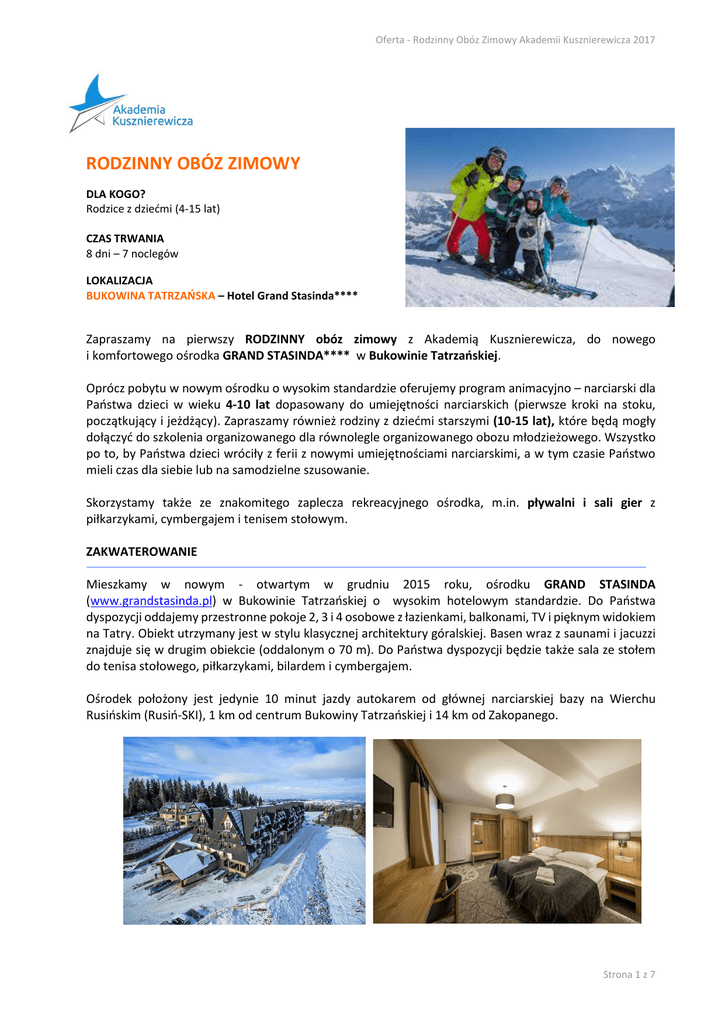 Oferta - Rodzinny Obóz Zimowy Akademii Kusznierewicza 2017 RODZINNY OBÓZ ZIMOWY DLA KOGO? Rodzice z dziećmi (4-15 lat) CZAS TRWANIA 8 dni – 7 noclegów LOKALIZACJA BUKOWINA TATRZAŃSKA – Hotel Grand Stasinda**** Zapraszamy na pierwszy RODZINNY obóz zimowy z Akademią Kusznierewicza, do nowego i komfortowego ośrodka GRAND STASINDA**** w Bukowinie Tatrzańskiej. Oprócz pobytu w nowym ośrodku o wysokim standardzie oferujemy program animacyjno – narciarski dla Państwa dzieci w wieku 4-10 lat dopasowany do umiejętności narciarskich (pierwsze kroki na stoku, początkujący i jeżdżący). Zapraszamy również rodziny z dziećmi starszymi (10-15 lat), które będą mogły dołączyć do szkolenia organizowanego dla równolegle organizowanego obozu młodzieżowego. Wszystko po to, by Państwa dzieci wróciły z ferii z nowymi umiejętnościami narciarskimi, a w tym czasie Państwo mieli czas dla siebie lub na samodzielne szusowanie. Skorzystamy także ze znakomitego zaplecza rekreacyjnego ośrodka, m.in. pływalni i sali gier z piłkarzykami, cymbergajem i tenisem stołowym. ZAKWATEROWANIE Mieszkamy w nowym - otwartym w grudniu 2015 roku, ośrodku GRAND STASINDA (www.grandstasinda.pl) w Bukowinie Tatrzańskiej o wysokim hotelowym standardzie. Do Państwa dyspozycji oddajemy przestronne pokoje 2, 3 i 4 osobowe z łazienkami, balkonami, TV i pięknym widokiem na Tatry. Obiekt utrzymany jest w stylu klasycznej architektury góralskiej. Basen wraz z saunami i jacuzzi znajduje się w drugim obiekcie (oddalonym o 70 m). Do Państwa dyspozycji będzie także sala ze stołem do tenisa stołowego, piłkarzykami, bilardem i cymbergajem. Ośrodek położony jest jedynie 10 minut jazdy autokarem od głównej narciarskiej bazy na Wierchu Rusińskim (Rusiń-SKI), 1 km od centrum Bukowiny Tatrzańskiej i 14 km od Zakopanego. Strona 1 z 7 Oferta - Rodzinny Obóz Zimowy Akademii Kusznierewicza 2017 WYŻYWIENIE Trzy posiłki dziennie, serwowane w restauracji ośrodka. Całodzienny serwis kawowy dostępny dla gości hotelu. KOSZT POBYTU W OŚRODKU GRAND STASINDA Z WYŻYWIENIEM (3 posiłki) 999 zł – OSOBA DOROSŁA - 7 noclegów w pokoju 2, 3 lub 4 osobowym (zgodnie z Państwa wyborem), pełne wyżywienie (3 posiłki), codziennie transfer na stok w Bukowinie Tatrzańskiej i z powrotem (w godzinach 09:30 – 13:00) wraz z obozem młodzieżowym, 2 wstępy 1,5h na basen w ośrodku Stasinda (oddalonym o 50 m), ubezpieczenie NNW, opieka pilota Akademii Kusznierewicza, opieka Sport Concierge Akademii Kusznierewicza, który pomoże Państwu zorganizować wszelkie narciarskie, i nie tylko, życzenia podczas pobytu. 799 zł – DZIECKO W WIEKU 5-12 lat - 7 noclegów w pokoju 2, 3 lub 4 osobowym z rodzicami (zgodnie z Państwa wyborem), pełne wyżywienie (3 posiłki), 2 wstępy 1,5h na basen w ośrodku Stasinda (oddalonym o 50 m) z rodzicami, ubezpieczenie NNW, opieka pilota Akademii Kusznierewicza. Cena pobytu za osobę nie zależy od liczby osób w pokoju. Pobyt z noclegiem na łóżku z rodzicami z wyżywieniem dzieci w wieku 0-3 lat – bezpłatnie. Zakwaterowanie pierwszego dnia od godziny 15:00, wykwaterowanie do godziny 11:00. Pierwszy posiłek – kolacja, ostatni posiłek – śniadanie. TERMINY Kod imprezy ORZM1 Termin 11.02. – 18.02.2017 r. ORZM2 18.02 – 25.02.2017 r. Strona 2 z 7 Oferta - Rodzinny Obóz Zimowy Akademii Kusznierewicza 2017 PROGRAM SZKOLENIOWY PIERWSZE KROKI NA STOKU DLA DZIECI W WIEKU 4-10 lat Cena programu: 850 zł Dla najmłodszych przygotowaliśmy ofertę składającą się z dwóch bloków zajęć - poranny 4 godzinny ze szkoleniem narciarskim pod okiem instruktora i animatora (w grupach maks. 5 osobowych) i popołudniowy 1,5 godzinny pełen animacji, gier, zabaw i konkursów na świeżym powietrzu lub sali zabaw w hotelu. Szkolenie narciarskie w grupach zaawansowania (pierwsze kroki na stoku, początkująca i jeżdżąca), prowadzone przez instruktorów licencjonowanej szkoły narciarskiej PTAK TEAM na stoku w Bukowinie Tatrzańskiej – Rusiński Wierch - wyciąg taśma 100 m, narciarski tor przeszkód (1 instruktor na 5 dzieci, szkolenie w dniach poniedziałek – piątek, 5 dni x 2 h na nartach z instruktorem). Rozgrzewka w formie gier i zabaw (30 minut) oraz zabawy rekreacyjne i uzupełniające po szkoleniu narciarskim (45 - 60 minut) prowadzone przez animatora Akademii Kusznierewicza (1 animator na 5 dzieci). Transfery dla dzieci z hotelu na stok i z powrotem pod opieką animatora Akademii Kusznierewicza w dniach poniedziałek-piątek. Rodzice mogą oddać dzieci animatorowi w hotelu ok. 09:00, dzieci pojadą autokarem na stok, wezmą udział w zajęciach i wrócą autokarem z animatorem o godzinie 13:00 6 Bloków zajęć z animatorami popołudniu (1,5h dziennie, niedziela - piątek) – sanki, lepienie bałwanka, konkurencje sprawnościowe, zajęcia plastyczne i rytmiczne, sztafety i inne! Zawody narciarskie na zakończenie szkolenia z nagrodami Pamiątkowe zdjęcie w ramce na zakończenie pobytu Cena nie zawiera opłaty za wypożyczenie nart. Koszt ok. 40-50 zł dziennie za komplet, możliwość wypożyczenia na miejscu. Kaski dla dzieci są obowiązkowe. RAMOWY PLAN DNIA SZKOLENIA PIERWSZE KROKI NA STOKU 08:00 – 09:00 09:00 09:15 – 09:30 10:00 – 10:30 10:30 – 12:30 12:30 – 13:15 13:30 14:00 – 16:00 16:30 – 18:00 19:00 Śniadanie w hotelu (z rodzicami) Zbiórka w lobby hotelu z animatorami Wyjazd na stok w Bukowinie Tatrzańskiej Rozgrzewka z animatorem Akademii Kusznierewicza Zajęcia narciarskie z instruktorami PTAK TEAM Zajęcia animacyjne z animatorem Akademii Kusznierewicza Powrót do hotelu Obiad z rodzicami i czas wolny Zajęcia rekreacyjne z animatorami Kolacja z rodzicami i czas wolny Strona 3 z 7 Oferta - Rodzinny Obóz Zimowy Akademii Kusznierewicza 2017 PROGRAM SZKOLENIA NARCIARSKIEGO LUB SNOWBOARDOWEGO DLA DZIECI W WIEKU 10-15 LAT MIESZKAJĄCYCH Z RODZICAMI Cena programu: 800 zł Dla młodzieży w wieku 10-15 lat, która mieszkać będz