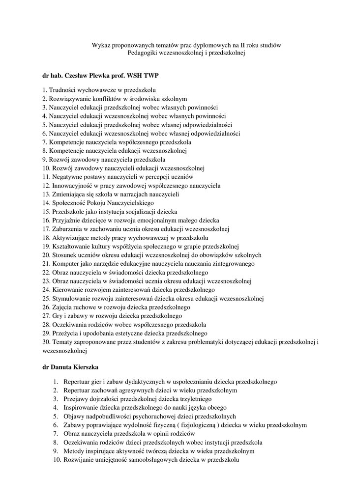 Wykaz proponowanych tematów prac dyplomowych na II roku studiów Pedagogiki wczesnoszkolnej i przedszkolnej dr hab. Czesław Plewka prof. WSH TWP 1. Trudności wychowawcze w przedszkolu 2. Rozwiązywanie konfliktów w środowisku szkolnym 3. Nauczyciel edukacji przedszkolnej wobec własnych powinności 4. Nauczyciel edukacji wczesnoszkolnej wobec własnych powinności 5. Nauczyciel edukacji przedszkolnej wobec własnej odpowiedzialności 6. Nauczyciel edukacji wczesnoszkolnej wobec własnej odpowiedzialności 7. Kompetencje nauczyciela współczesnego przedszkola 8. Kompetencje nauczyciela edukacji wczesnoszkolnej 9. Rozwój zawodowy nauczyciela przedszkola 10. Rozwój zawodowy nauczycieli edukacji wczesnoszkolnej 11. Negatywne postawy nauczycieli w percepcji uczniów 12. Innowacyjność w pracy zawodowej współczesnego nauczyciela 13. Zmieniająca się szkoła w narracjach nauczycieli 14. Społeczność Pokoju Nauczycielskiego 15. Przedszkole jako instytucja socjalizacji dziecka 16. Przyjaźnie dziecięce w rozwoju emocjonalnym małego dziecka 17. Zaburzenia w zachowaniu ucznia okresu edukacji wczesnoszkolnej 18. Aktywizujące metody pracy wychowawczej w przedszkolu 19. Kształtowanie kultury współżycia społecznego w grupie przedszkolnej 20. Stosunek uczniów okresu edukacji wczesnoszkolnej do obowiązków szkolnych 21. Komputer jako narzędzie edukacyjne nauczyciela nauczania zintegrowanego 22. Obraz nauczyciela w świadomości dziecka przedszkolnego 23. Obraz nauczyciela w świadomości ucznia okresu edukacji wczesnoszkolnej 24. Kierowanie rozwojem zainteresowań dziecka przedszkolnego 25. Stymulowanie rozwoju zainteresowań dziecka okresu edukacji wczesnoszkolnej 26. Zajęcia ruchowe w rozwoju dziecka przedszkolnego 27. Gry i zabawy w rozwoju dziecka przedszkolnego 28. Oczekiwania rodziców wobec współczesnego przedszkola 29. Przeżycia i upodobania estetyczne dziecka przedszkolnego 30. Tematy zaproponowane przez studentów z zakresu problematyki dotyczącej edukacji przedszkolnej i wczesnoszkolnej dr Danuta Kierszka 1. 2. 3. 4. 5. 6. 7. 8. 9. 10. Repertuar gier i zabaw dydaktycznych w uspołecznianiu dziecka przedszkolnego Repertuar zachowań agresywnych dzieci w wieku przedszkolnym Przejawy dojrzałości przedszkolnej dziecka trzyletniego Inspirowanie dziecka przedszkolnego do nauki języka obcego Objawy nadpobudliwości psychoruchowej dzieci przedszkolnych Zabawy poprawiające wydolność fizyczną ( fizjologiczną ) dziecka w wieku przedszkolnym Obraz nauczyciela przedszkola w opinii rodziców Oczekiwania rodziców dzieci przedszkolnych wobec instytucji przedszkola Metody inspirujące aktywność twórczą dziecka w wieku przedszkolnym Rozwijanie umiejętność samoobsługowych dziecka w przedszkolu 11. Rozwijanie zainteresowań przyrodniczych (plastycznych, matematycznych, literackich ….) dzieci w wieku…. 12. Sposoby zaspakajania potrzeby ruchu dziecka w przedszkolu 13. Preferowane formy aktywności ruchowej dzieci w warunkach przedszkola 14. Przejawy zachowań społecznych dziecka sześcioletniego w warunkach przedszkola 15. Preferowane aktywności dzieci sześcioletnich wieku w opinii rodziców 16. Repertuar zabaw w pracy wychowawczej przedszkola 17. Zabawy tematyczne w procesie rozwoju społecznego dziecka w warunkach przedszkola 18. Rozwijanie sprawności manualnej dziecka (pięcioletniego) w warunkach przedszkola 19. Rozwijanie koncentracji uwagi dzieci w przedszkolu 20. Przyczyny niepowodzeń szkolnych dzieci w wieku wczesnoszkolnym 21. Przejawy aktywności wolnoczasowej dzieci w wieku wczesnoszkolnym 22. Wspieranie ucznia dyslektycznego w warunkach szkolnych 23. Zachowania uczniów w klasach integracyjnych 24. Działania szkoły na rzecz wspierania ucznia klas I-III z niepowodzeniami szkolnymi 25. Aktywność ucznia klas I-III w świetlicy szkolnej 26. Rozwijanie aktywności artystycznej w warunkach świetlicy szkolnej. 27. Drama- metoda wspierająca proces wychowania uczniów w młodszym wieku szkolnym 28. Wypalenie zawodowe nauczycieli klas I-III 29. Rozwijanie ( kształtowanie )zainteresowań czytelniczych dzieci w młodszym wieku szkolnym 30. Kształtowaniu szacunku do osób starszych w pracy z dzieckiem klas I-III 31. Profilaktyka zdrowotna dzieci w wieku…. 32. Przyczyny i uwarunkowania trudności edukacyjnych dzieci w warunkach szkoły wiejskiej 33. Dziecko nieśmiałe w warunkach współczesnej szkoły 34. Wspomaganie dziecka w młodszym wieku szkolnym przejawiającego trudności adaptacyjne 35. Współpraca szkoły z rodzicami uczniów w wieku wczesnoszkolnym 36. Zachowania rodziców wobec treści oceny opisowej ich dziecka 37. Sytuacja społeczna dziecka z ADHD w warunkach szkolnych 38. Praca z uczniem zdolnym w warunkach szkolnych 39. Preferowane formy aktywności uczniów w wieku wczesnoszkolnym w zajęciach pozalekcyjnych 40. Przyczyny zachowań agresywnych dziecka przedszkolnego w opinii nauczycieli