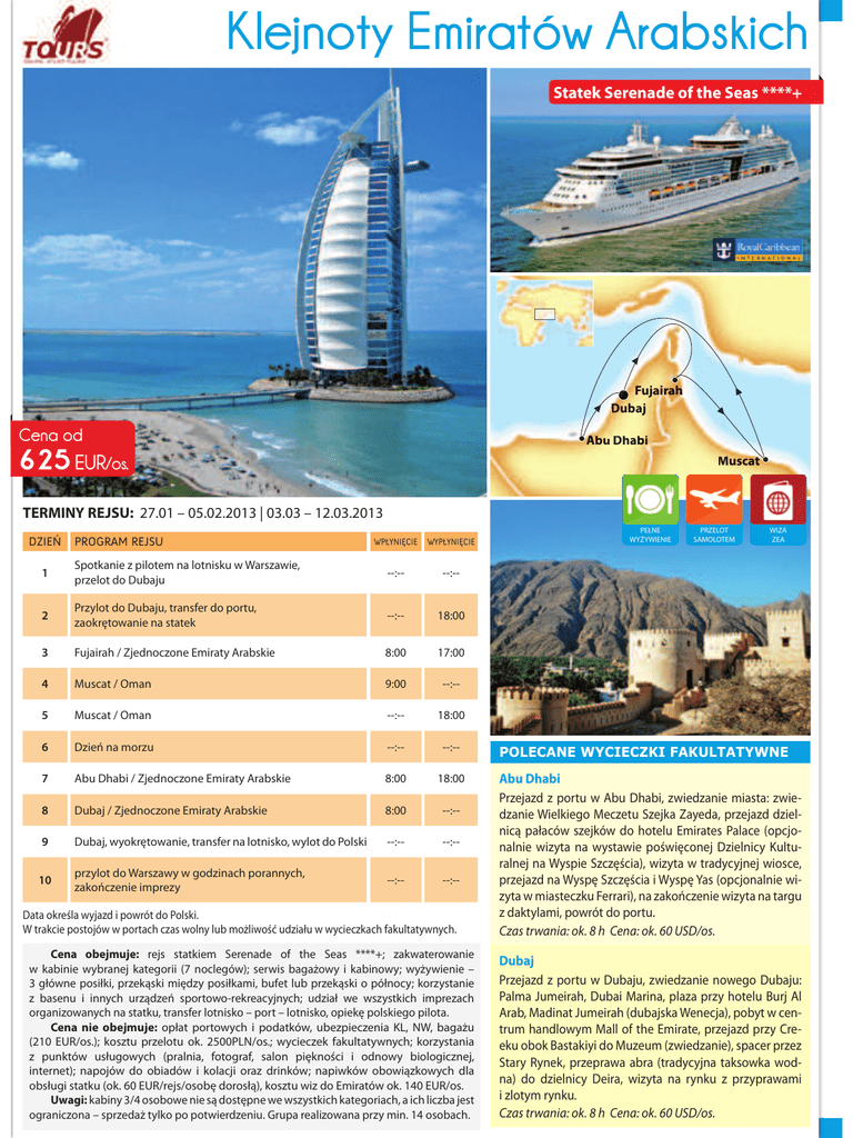 .OHMQRW\(PLUDW³Z$UDEVNLFK Statek Serenade of the Seas ****+ Fuja Fu jair ja irah ir ah Duba Du bajj ba Cena od Abu Ab u Dh Dhab abii ab 625 EUR/os. Musc Mu scat sc at TERMINY REJSU: 27.01 – 05.02.2013 | 03.03 – 12.03.2013 DZIEŃ PROGRAM REJSU WPŁYNIĘCIE WYPŁYNIĘCIE 1 Spotkanie z pilotem na lotnisku w Warszawie, przelot do Dubaju --:-- --:-- 2 Przylot do Dubaju, transfer do portu, zaokrętowanie na statek --:-- 18:00 3 Fujairah / Zjednoczone Emiraty Arabskie 8:00 17:00 4 Muscat / Oman 9:00 --:-- 5 Muscat / Oman --:-- 18:00 6 Dzień na morzu --:-- --:-- 7 Abu Dhabi / Zjednoczone Emiraty Arabskie 8:00 18:00 8 Dubaj / Zjednoczone Emiraty Arabskie 8:00 --:-- 9 Dubaj, wyokrętowanie, transfer na lotnisko, wylot do Polski --:-- --:-- 10 przylot do Warszawy w godzinach porannych, zakończenie imprezy --:-- --:-- Data określa wyjazd i powrót do Polski. W trakcie postojów w portach czas wolny lub możliwość udziału w wycieczkach fakultatywnych. Cena obejmuje: rejs statkiem Serenade of the Seas ****+; zakwaterowanie w kabinie wybranej kategorii (7 noclegów); serwis bagażowy i kabinowy; wyżywienie – 3 główne posiłki, przekąski między posiłkami, bufet lub przekąski o północy; korzystanie z basenu i innych urządzeń sportowo-rekreacyjnych; udział we wszystkich imprezach organizowanych na statku, transfer lotnisko – port – lotnisko, opiekę polskiego pilota. Cena nie obejmuje: opłat portowych i podatków, ubezpieczenia KL, NW, bagażu (210 EUR/os.); kosztu przelotu ok. 2500PLN/os.; wycieczek fakultatywnych; korzystania z punktów usługowych (pralnia, fotograf, salon piękności i odnowy biologicznej, internet); napojów do obiadów i kolacji oraz drinków; napiwków obowiązkowych dla obsługi statku (ok. 60 EUR/rejs/osobę dorosłą), kosztu wiz do Emiratów ok. 140 EUR/os. Uwagi: kabiny 3/4 osobowe nie są dostępne we wszystkich kategoriach, a ich liczba jest ograniczona – sprzedaż tylko po potwierdzeniu. Grupa realizowana przy min. 14 osobach. PEŁNE WYŻYWIENIE PRZELOT SAMOLOTEM WIZA ZEA POLECANE WYCIECZKI FAKULTATYWNE Abu Dhabi Przejazd z portu w Abu Dhabi, zwiedzanie miasta: zwiedzanie Wielkiego Meczetu Szejka Zayeda, przejazd dzielnicą pałaców szejków do hotelu Emirates Palace (opcjonalnie wizyta na wystawie poświęconej Dzielnicy Kulturalnej na Wyspie Szczęścia), wizyta w tradycyjnej wiosce, przejazd na Wyspę Szczęścia i Wyspę Yas (opcjonalnie wizyta w miasteczku Ferrari), na zakończenie wizyta na targu z daktylami, powrót do portu. Czas trwania: ok. 8 h Cena: ok. 60 USD/os. Dubaj Przejazd z portu w Dubaju, zwiedzanie nowego Dubaju: Palma Jumeirah, Dubai Marina, plaza przy hotelu Burj Al Arab, Madinat Jumeirah (dubajska Wenecja), pobyt w centrum handlowym Mall of the Emirate, przejazd przy Creeku obok Bastakiyi do Muzeum (zwiedzanie), spacer przez Stary Rynek, przeprawa abra (tradycyjna taksowka wodna) do dzielnicy Deira, wizyta na rynku z przyprawami i zlotym rynku. Czas trwania: ok. 8 h Cena: ok. 60 USD/os.