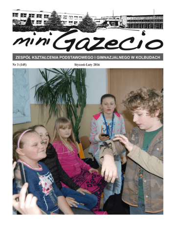 Nr 3 (145) Styczeń-Luty 2016 JASEŁKA Z życia szkoły Ś więta Bożego Narodzenia to wspaniały czas radości, szczęścia i refleksji nad znaczeniem każdego nowonarodzonego życia , potrzebą miłości i rolą rodziny. Te ważne tematy, zostały przedstawione uczniom w dwóch odmiennych przedstawieniach. 21 grudnia uczniowie klas 0-III obejrzały jasełka pt.„Za radą z nieba” które przygotowały klasy: Vd oraz IIIa. Pierwsze sceny odbyły się w niebie, gdzie liczna rzesza Aniołów przygoto- WOŚP J uż po raz 24 odbył się Finał Wielkiej Orkiestry Świątecznej Pomocy. W tym roku organizatorzy zbierali fundusze na zakup urządzeń medycznych dla oddziałów pediatrycznych oraz dla zapewnienia godnej opieki medycznej seniorów. I nas nie mogło zabraknąć w tej szczytnej akcji. W Kolbudach finał odbył się w hali sportowej ZKPiG i w sali koncertowej UG, gdzie miał miejsce koncert zespołu „Pudelsi”. Dzięki wspólnemu zaangażowaniu wolontariuszy, przedszkolaków, szkół, opiekunów, a także organizacji sportowych, wędkarzy, strażaków oraz sponsorów i darczyńców nasz Sztab zebrał kwotę 16254 zł. Już teraz mamy nadzieję, że w przyszłym roku pobijemy ten rekord. Fotorelacja na str. 16. Pani Małgosia Gańska-Seelau 9 99 99 99 9 "&#& 2 %! &$ 2360( &6*02'5&,36/-56(4+60'56146136.46- .-#6/562%5)6/36.461 *4)6!"6+5,$ wywała się na narodzenie Jezusa a szczególnie zastanawiała się, jak Dzieciątko zostanie przyjęte na ziemi przez ludzi. Potem Maryja i Józef wędrowali po Betlejem i okolicy w poszukiwaniu noclegu, który znaleźli dopiero w stajence. Przywitali ich pasterze, a na koniec przybyli Trzej Królowie składając dary małemu Jezusowi. Jasełka przypomniały na czym polega znaczenie świąt Bożego Narodzenia, to nie otrzymane prezenty pod choinką mają znaczenie, ale zmiana postępowania ludzi, rezygnacja z wiecznego pośpiechu, dążeń do bogactwa zwrócenie z miłością uwagi na rodzinę , osoby samotne i potrzebujące pomocy. W jasełkach ważną rolę odegrali uczniowie 22 grudnia 2015r starsi członkowie naszej szkoły, czyli uczniowie klas IV-VI i gimnazjum obejrzeli jasełka pt.„Świąteczna ulica” przedstawione przez grupę uczniów gimnazjum z klas 1a, 1c, 1d, 1e, 2b, 2f, 3g, 3f. Jasełka rozpoczęły się ukazaniem przechodniów na ulicy w dniu Bożego Narodzenia. Do tych prze- 27 listopada 2015r. nasi uczniowie, tworzacy grupe PaT, uczestniczyli w imprezie profilaktycznej "Stop Uzależnieniom". Przed koncertem gościa specjalnego - SARSY, grupa PaT pokazała przedstawienie profilaktyczne pt. „Jeden dzień z zycia narkomana". Scenariusz spektaklu został oparty na wspomnieniach uczniów liceum, których jeden z kolegów zmarł na skutek nałogu. Celem spektaklu było uświadomienie młodzieży, że prawdziwy dramat często rozpoczyna się niewinnie, od jednego draga, po który łatwo jest sięgnąć. Później trudno odmówić. Nie można jednak pozostać obojętnym. Należy wyciągnąć dłoń i wesprzeć w szukaniu pomocy. Przedstawienie pokazano już po raz drugi na scenie GOK w Kolbudach. W chodniów podchodziła dziennikarka pytając się ich co dla nich znaczą święta Bożego Narodzenia. Znaczna część pytanych osób tylko zewnętrznie przeżywała te ważne wydarzenie, gdyż zbyt bardzo byli zajęci codziennymi sprawami, pracą , zakupami itd. Zabiegani zdobywaniem rzeczy materialnych zapominali o tym co najważniejsze, drugi człowiek, rodzina, pomoc innym. Zmienia się to z chwila pojawienia się Świętej Rodziny, która otwiera nasze serca na bezinteresowną miłość, dobroć i pomoc osobom samotnym itd, To dzieje się każdego roku w naszych sercach. Uczniowie z dużym zainteresowaniem wsłuchiwali się w treść obu jasełek, w te sposób ucząc się inaczej spostrzegać znaczenie i głębie Świąt Bożego Narodzenia. Wszystkim wykonawcom jasełek dziękujemy za przekazane wrażenia artystyczne i wysłuchane piękne kolędy. Fotorelacja na str. 17-18. Pani Żaneta Wisowata obu przypadkach spotkało sie z ogromnym zainteresowaniem gimnazjalistów, a przecież o to nam własnie chodziło. Grupa PaT działajaca w naszej szkole zaprasza w marcu na nowe przedstawienie. 22 • grudnia grupa PAT zorganizowała świąteczne spotkanie w Domu Pomocy PROBONO w Kolbudach. PaTowicze z gitarami, syntezatorem oraz przepysznymi ciastami zaprosili do wspólnego kolędowania przy choince mieszkańców oraz personel PB. Wspólne kolędowanie pozwoliło na chwilę refleksji o tym, że nawet małe rzeczy mogą dawać wielką satysfakcję. Zachęcamy do podejmowania wszelkich inicjatyw, które mogą przyczynić się do radości innych i nas samych. My na pewno wrócimy do PROBONO - może pójdziesz z nami? Pani Małgosia Gańska-Seelau Na okładce: Żywa lekcja przyrody Gazeta Zespołu Kształcenia Podstawowego i Gimnazjalnego w Kolbudach. Redagują uczniowie naszej szkoły; opieka: A. M o r a w s k a , M . S z e n k i n - C h m i e l e w s k a , M . Wo j c i e c h o w s k a ; z d j ę c i a : Ż . Wi s o w a t a . , w w w. w i k i p e d i a . p l , w w w. g o o g l e . c o m W y d a w c a : Z K P i G 8 3 - 0 5 0 K o l b u d y, u l . W y b i c k i e g o 3 3 , t e l . ( 0 5 8 ) 6 8 2 7 2 7 8 , e - m a i l : z k p i g k @ i d s l . p l , h t t p : / / w w w . k o l b u d y. i d s . p l W SCHODNO - z wizytą u leśnych zwierząt styczniu w ramach zajęć tzw. białej szkoły w pięknie położonej na Kaszubach maleńkiej miejscowości Schodno klasa 2D gimnazjum brała udział w warsztatach z edukacji ekologicznej: „Ptaki”, „Zimowanie zwierząt”, a także „Wiem, co jem”. Podczas wycieczek do zmrożonego lasu uczniowie obserwowali ptaki, tropy, żeremie bobrze, buchtowiska dzika oraz słuchali opowieści przewodników o wielu zamieszkujących te rejony zwierzętach i ich zwyczajach. Wykład „Wiem, co jem” otworzył gim nazjalistom oczy na mnogość niezdrowej żywności kuszącej klientów ze sklepowych półek. W dro