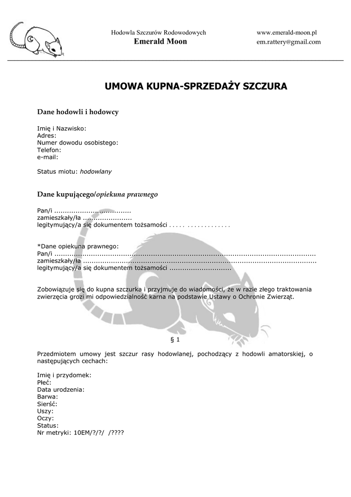 Hodowla Szczurów Rodowodowych Emerald Moon www.emerald-moon.pl [email protected] _______________________________________________________________________________________________ UMOWA KUPNA-SPRZEDAŻY SZCZURA Dane hodowli i hodowcy Imię i Nazwisko: Adres: Numer dowodu osobistego: Telefon: e-mail: Status miotu: hodowlany Dane kupującego/opiekuna prawnego Pan/i .................................... zamieszkały/ła ....................... legitymujący/a się dokumentem tożsamości ..... ............. *Dane opiekuna prawnego: Pan/i .......................................................................................................................... zamieszkały/ła ............................................................................................................. legitymujący/a się dokumentem tożsamości ............................. Zobowiązuje się do kupna szczurka i przyjmuje do wiadomości, że w razie złego traktowania zwierzęcia grozi mi odpowiedzialność karna na podstawie Ustawy o Ochronie Zwierząt. §1 Przedmiotem umowy jest szczur rasy hodowlanej, pochodzący z hodowli amatorskiej, o następujących cechach: Imię i przydomek: Płeć: Data urodzenia: Barwa: Sierść: Uszy: Oczy: Status: Nr metryki: 10EM/?/?/ /???? §2 Strony ustalają cenę szczura na ...... zł Cena ta jest ekwiwalentem za odchów szczura, opiekę samicy podczas ciąży i doprowadzenie do miotu, nie stanowi dochodu hodowcy. §3 Hodowca zaświadcza, że szczur w momencie przekazania Kupującemu jest zdrowy, właściwie rozwinięty, nie posiada wad genetycznych. §4 Kupujący ma obowiązek: 1. Zapewnić szczurowi odpowiednie wyżywienie, świeżą wodę i schronienie oraz nie wypuszczać go bez opieki na tereny otwarte. 2. Zapewnić szczurkowi opiekę weterynaryjną oraz konieczne zabiegi higieniczne. 3. Traktować adoptowanego szczura łagodnie i przyjaźnie. 4. Rozmnażać tylko zgodnie ze standardami i regulaminem hodowli SHSRP, pod warunkiem, że szczur ma status hodowlany, w przypadku statusu PET konieczna jest pisemna zgodna hodowcy. 5. Minimum raz na 2 miesiące informować hodowcę o stanie zdrowia i rozwoju szczura i w miarę możliwości załączać zdjęcia. 6. W razie choroby, zaginięcia bądź śmierci szczura natychmiast powiadomić hodowcę, lub w przypadku braku zainteresowania hodowcy, zgłosić problem do SHSR. • w przypadku choroby – należy wypełnić kartę zdrowia szczurka. • w przypadku śmierci – należy wypełnić kartę zgonu szczurka. 7. Nie sprzedawać ani nie przekazywać osobom trzecim, a w przypadku uzasadnionej konieczności oddania zwierzęcia w pierwszej kolejności powiadomić hodowcę, który ma w takim przypadku prawo pierwokupu (kwota nie może przekraczać 50% ceny pierwotnej). 8. W przypadku podejrzenia nowotworu i jego usunięcia zlecić histopatologię zmienionego wycinka. 9. W przypadku niepewnej przyczyny zgonu zlecić wykonanie sekcji. 10. Wysłać wyniki sekcji i/lub histopatologii do hodowcy Za nieprzestrzeganie warunków 1-5 Hodowca ma prawo żądać oddania szczura. Za nieprzestrzeganie warunku 4 Hodowca ma prawo zarekwirowania wszystkich szczurów będących potomstwem szczura oraz samego szczura, którego dotyczy ta umowa. Za nieprzestrzeganie warunków 6-10 Hodowca ma prawo żądać rekompensaty w postaci dwukrotnej ceny szczura, o ile Kupujący nie miał ważnych powodów niedotrzymania warunków. §5 Hodowca ma obowiązek: 1. Przekazać Kupującemu razem ze szczurem jego metryki urodzenia upoważniającej szczura do ubiegania się o wydanie rodowodu. 2. Udzielić Kupującemu niezbędnych rad dotyczących opieki nad szczurem. 3. Służyć radą dotyczącą opieki nad szczurem Kupującemu w całym okresie życia szczura za pośrednictwem e-mail lub innym, w zależności od możliwości Hodowcy. 4. Informować Kupującego o problemach zdrowotnych w linii danego szczura (rodzice, dziadkowie, rodzeństwo, dzieci rodzeństwa, rodzeństwo rodziców) Za nieprzestrzeganie w/w warunków Kupujący ma prawo żądać rekompensaty w postaci połowy ceny szczura, o ile Hodowca nie miał ważnych powodów niedotrzymania warunków. §6 Wszelkie koszty wynikłe z konieczności transportu szczura ponosi Kupujący, chyba że Hodowca postanowi inaczej. §7 Kupujący zobowiązany jest wpłacić na podane przez Hodowcę konto zaliczkę w postaci połowy ceny szczura nie wcześniej niż po ukończeniu przez szczura dwóch tygodni życia, a nie później niż po ukończeniu trzech tygodni. §8 Koszty wynikające z wysyłki umowy ponosi Kupujący, chyba że Hodowca postanowi inaczej. §9 Załącznikami do umowy są kserokopie dowodów osobistych obu stron. § 10 Umowa jest zawarta w dwóch jednobrzmiących egzemplarzach. § 11 Wszelkie konflikty nieokreślone umową , a związane z nią rozwiązują przepisy kodeksu cywilnego i sąd właściwy dla Hodowcy. ................................................... (data i podpis Kupującego) ................................................. (data i podpis opiekuna prawnego) .............................................. (data i podpis Hodowcy)