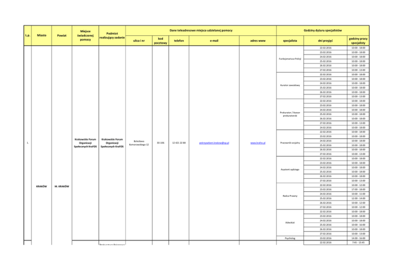 L.p. Miasto Powiat Miejsce świadczonej pomocy Podmiot realizujący zadanie Dane teleadresowe miejsca udzielanej pomocy ulica i nr kod pocztowy telefon e-mail Godziny dyżuru specjalistów adres www specjalista dni przyjęć 22.02.2016 23.02.2016 Funkcjonariusz Policji 24.02.2016 25.02.2016 26.02.2016 27.02.2016 22.02.2016 23.02.2016 Kurator zawodowy 24.02.2016 25.02.2016 26.02.2016 27.02.2016 22.02.2016 23.02.2016 Prokurator / Asesor prokuratorski 24.02.2016 25.02.2016 26.02.2016 27.02.2016 24.02.2016 22.02.2016 Krakowskie Forum Organizacji Społecznych KraFOS 1. Krakowskie Forum Organizacji Społecznych KraFOS Bolesława Komorowskiego 12 23.02.2016 30-106 12 421 22 88 [email protected] www.krafos.pl Pracownik socjalny 24.02.2016 25.02.2016 26.02.2016 27.02.2016 22.02.2016 23.02.2016 Asystent sędziego 24.02.2016 25.02.2016 26.02.2016 KRAKÓW 27.02.2016 22.02.2016 M. KRAKÓW 23.02.2016 Radca Prawny 24.02.2016 25.02.2016 26.02.2016 27.02.2016 22.02.2016 23.02.2016 Adwokat 24.02.2016 25.02.2016 26.02.2016 Prokuratura Rejonowa Psycholog 27.02.2016 23.02.2016 22.02.2016 godziny pracy specjalisty 10:00 - 18:00 10:00 - 18:00 10:00 - 18:00 10:00 - 18:00 10:00 - 18:00 10:00 - 13:00 10:00 - 18:00 10:00 - 18:00 10:00 - 18:00 10:00 - 18:00 10:00 - 18:00 10:00 - 13:00 10:00 - 18:00 10:00 - 18:00 10:00 - 18:00 10:00 - 18:00 10:00 - 18:00 10:00 - 13:00 10:00 - 18:00 10:00 - 18:00 10:00 - 18:00 10:00 - 18:00 10:00 - 18:00 10:00 - 18:00 10:00 - 13:00 10:00 - 18:00 10:00 - 18:00 10:00 - 18:00 10:00 - 18:00 10:00 - 18:00 10:00 - 13:00 10:00 - 12:00 17:00 - 18:00 10:00 - 11:00 12:00 - 14:00 10:00 - 12:00 10:00 - 12:00 10:00 - 18:00 10:00 - 18:00 10:00 - 18:00 10:00 - 16:00 10:00 - 18:00 10:00 - 13:00 14:00 - 16:00 7:45 - 15:45 Prokuratura Rejonowa Kraków - Prądnik Biały 2. 3. 4. Prokuratura Rejonowa Kraków - Prądnik Prądnik Biały oś. Kościuszkowskie 2 31-858 12 646-77-00 [email protected] www.krakow.po.gov.pl Prokurator Prokuratura Rejonowa Prokuratura Rejonowa Kraków - Nowa Huta Kraków - Nowa Huta oś. Stalowe 16D 31-922 12 680-22-00 [email protected] www.krakow.po.gov.pl Prokurator Prokuratura Rejonowa Prokuratura Rejonowa Kraków - Podgórze Kraków - Podgórze oś. Stalowe 16D 31-922 12 680-22-00 [email protected] www.krakow.po.gov.pl Prokurator 25.02.2016 7:45 - 15:45 22.02.2016 7:45 - 15:45 24.02.2016 7:45 - 15:45 23.02.2016 25.02.2016 26.02.2016 22.02.2016 Prokuratura Okręgowa Prokuratura Okręgowa w Krakowie w Krakowie 5. ul. Mosiężnicza 2 30-965 12 619-60-00 [email protected] www.krakow.po.gov.pl Prokurator 23.02.2016 24.02.2016 Prokuratura Rejonowa Kraków - Krowodrza Prokuratura Rejonowa Kraków - Krowodrza oś. Kościuszkowskie 2 31-858 12 646-77-99 [email protected] www.krakow.po.gov.pl Prokurator WIELICKI Prokuratura Rejonowa w Prokuratura Rejonowa w Wieliczce Wieliczce ul. Tomsza Żywca 1 32-020 12 357-21-57 [email protected] www.krakow.po.gov.pl Prokurator TARNÓW M. TARNÓW Sąd Rejonowy Sąd Rejonowy ul. Dąbrowskiego 27 33-100 14 688-74-00 [email protected] www.tarnow.so.gov.pl Kuratorzy zawodowi Psychoterapeuta 9. ul. Berka Joselewicza 5 Powiatowe Centrum Pomocy Rodzinie 10. DĄBROWA TARNOWSKA 33-200 14 642-44-15 [email protected] www.pcprdt.pl Prawnik Powiatowe Centrum Pomocy Rodzinie 24.02.2016 23.02.2016 24.02.2016 25.02.2016 33-200 14 642-44-15 [email protected] www.pcprdt.pl Pracownik socjalny Sąd Rejonowy ul. Jakuba Bojki 2 33-200 014) 64-44-100 [email protected] www.tarnow.so.gov.pl Kuratorzy zawodowi 26.02.2016 22.02.2016 22.02.2016 26.02.2016 23.02.2016 25.02.2016 23.02.2016 24.02.2016 25.02.2016 23.02.2016 24.02.2016 25.02.2016 22.02.2016 BOCHNIA BOCHEŃSKI Sąd Rejonowy Sąd Rejonowy ul. Kościuszki 4 32-700 14 61 52 100 [email protected] www.tarnow.so.gov.pl Kuratorzy zawodowi 23.02.2016 24.02.2016 25.02.2016 26.02.2016 22.02.2016 Pracownicy sądu oraz 7:45 - 15:45 7:45 - 15:45 7:45 - 15:45 7:45 - 15:45 7:45 - 15:45 10:00 - 13:00 25.02.2016 26.02.2016 12. 09:00 - 15:00 24.02.2016 23.02.2016 22.02.2016 Sąd Rejonowy dyżur stacjonarny dyżur telefoniczny: 669 658 365 10:00 - 13:00 26.02.2016 11. 7:45 - 15:45 22.02.2016 22.02.2016 ul. Berka Joselewicza 5 DĄBROWSKI Psycholog 7:45 - 15:45 09:00 - 15:00 26.02.2016 8. 7:45 - 15:45 22.02.2016 22.02.2016 WIELICZKA 7:45 - 15:45 7:45 - 15:45 7:45 - 15:45 26.02.2016 7. 7:45 - 15:45 25.02.2016 26.02.2016 6. 7:45 - 15:45 23.02.2016 10:00 - 13:00 10:00 - 13:00 10:00 - 13:00 09:00 - 12:00 16:00 - 19:00 16:00 - 19:00 16:00 - 19:00 16:00 - 19:00 08:00 - 15:00 08:00 - 15:00 08:00 - 15:00 08:00 - 15:00 08:00 - 15:00 08:30 - 15:00 08:30 - 14:00 11:00 - 14:00 08:00 - 14:00 08:30 - 14:00 09:00 - 15:00 09:00 - 15:00 09:00 - 15:00 09:00 - 15:00 09:00 - 15:00 09:00 - 13:00 09:00 - 13:00 Pracownicy sądu oraz asystenci sędziego 13. Sąd Rejonowy BRZESKO Sąd Rejonowy ul. Kościuszki 20 32-800 146 646 100 [email protected] www.tarnow.so.gov.pl Powiatowe Centrum Pomocy Rodzinie Ośrodek Pomocy Społecznej ANDRYCHÓW 09:00 - 13:00 23.02.2016 24.02.2016 25.02.2016 Powiatowe Centrum Pomocy Rodzinie ul. Piastowska 2B 32-800 14 663 00 31 [email protected] pcprbrzesko.pl Ośrodek Pomocy Społecznej ul. Starowiejska 22 b 34-120 33 875-33-00 [email protected] ops.andrychow.eu WADOWICKI Komisariat Policji Komisariat Policji ul. Krakowska 108 34-120 33 875 33 71 [email protected] www.wadowice.policja.gov.pl 23.02.2016 24.02.2016 22.02.2016 Psycholog Prawnik 15. 26.02.2016 26.02.2016 Prawnik 14. 09:00 - 13:00 25.02.2016 22.02.2016 Kuratorzy zawodowi BRZESKI 24.02.2016 23.02.2016 24.02.2016 25.02.2016 26.02.2016 22.02.2016 32-100 12 386 29 60 [email protected] www.pcpr.proszowice.pl 07:30 - 18:00 07:30 - 18:00 07:30 - 15:30 07:00 - 18:00 07:00 - 15:00 07:00 - 18:00 07:00 - 15:00 13:00 - 15:00 26.02.2016 15:00 - 17:00 Psycholog 25.02.2016 13:00 - 15:00 23.02.2016 06:00 - 22:00 Funkcjonariusz Policji Pedagog ul. 3-go Maja 72 09:00 - 16:00 Przewodnicząca Zespołu Interdyscyplinarnego Terapeuta ds. uzależnień PROSZOWICKI 09:00 - 16:00 15:00 - 17:0