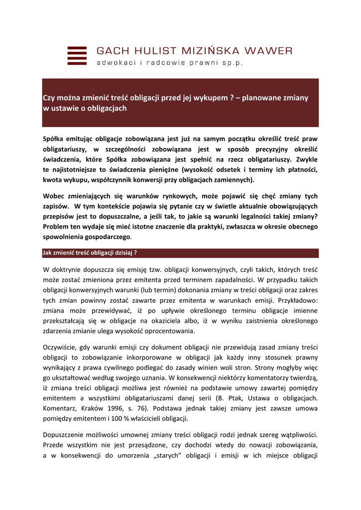 Czy można zmienić treść obligacji przed jej wykupem ? – planowane zmiany w ustawie o obligacjach Spółka emitując obligacje zobowiązana jest już na samym początku określić treść praw obligatariuszy, w szczególności zobowiązana jest w sposób precyzyjny określić świadczenia, które Spółka zobowiązana jest spełnić na rzecz obligatariuszy. Zwykle te najistotniejsze to świadczenia pieniężne (wysokość odsetek i terminy ich płatności, kwota wykupu, współczynnik konwersji przy obligacjach zamiennych). Wobec zmieniających się warunków rynkowych, może pojawić się chęć zmiany tych zapisów. W tym kontekście pojawia się pytanie czy w świetle aktualnie obowiązujących przepisów jest to dopuszczalne, a jeśli tak, to jakie są warunki legalności takiej zmiany? Problem ten wydaje się mieć istotne znaczenie dla praktyki, zwłaszcza w okresie obecnego spowolnienia gospodarczego. Jak zmienić treść obligacji dzisiaj ? W doktrynie dopuszcza się emisję tzw. obligacji konwersyjnych, czyli takich, których treść może zostać zmieniona przez emitenta przed terminem zapadalności. W przypadku takich obligacji konwersyjnych warunki (lub termin) dokonania zmiany w treści obligacji oraz zakres tych zmian powinny zostać zawarte przez emitenta w warunkach emisji. Przykładowo: zmiana może przewidywać, iż po upływie określonego terminu obligacje imienne przekształcają się w obligacje na okaziciela albo, iż w wyniku zaistnienia określonego zdarzenia zmianie ulega wysokość oprocentowania. Oczywiście, gdy warunki emisji czy dokument obligacji nie przewidują zasad zmiany treści obligacji to zobowiązanie inkorporowane w obligacji jak każdy inny stosunek prawny wynikający z prawa cywilnego podlegać do zasady winien woli stron. Strony mogłyby więc go ukształtować według swojego uznania. W konsekwencji niektórzy komentatorzy twierdzą, iż zmiana treści obligacji możliwa jest również na podstawie umowy zawartej pomiędzy emitentem a wszystkimi obligatariuszami danej serii (B. Ptak, Ustawa o obligacjach. Komentarz, Kraków 1996, s. 76). Podstawa jednak takiej zmiany jest zawsze umowa pomiędzy emitentem i 100 % właścicieli obligacji. Dopuszczenie możliwości umownej zmiany treści obligacji rodzi jednak szereg wątpliwości. Przede wszystkim nie jest przesądzone, czy dochodzi wtedy do nowacji zobowiązania, a w konsekwencji do umorzenia „starych” obligacji i emisji w ich miejsce obligacji GACH, HULIST, MIZIŃSKA, WAWER – ADWOKACI I RADCOWIE PRAWNI SP.P. o zmienionej treści, czy też dochodzi jedynie do zmiany zobowiązania wynikającego z obligacji. Wskazany wyżej B. Ptak opowiada się za drugim stanowiskiem wskazując, że zmiana treści obligacji, nawet jeżeli jest połączona z wymianą dokumentów obligacji, nie ma na celu umorzenia zobowiązania z obligacji, lecz jedynie zmianę istniejącego stosunku prawnego. Skoro zatem wolą emitenta jaki i obligatariuszy nie jest umorzenie obligacji to trudno byłoby mówić, iż dochodzi do nowacji. Należy zaznaczyć, że pogląd ten byłby trudny do obrony jeżeli zmiana treści obligacji dotyczy rodzaju świadczenia (przykładowo zmiana świadczenia niepieniężnego w pieniężne). Nawet gdyby przyjąć tezę, że możliwa jest taka zmiana, emitent chcąc zmodyfikować warunki emisji jest obecnie zmuszony do zawierania umów zmieniających z każdym obligatariuszem danej serii. Wynika to z faktu, że treść papierów emitowanych w seriach musi być jednakowa, a zatem niedopuszczalne jest aby w ramach jednej serii obligacje miały różną treść. W praktyce takie rozwiązanie jest trudne do przeprowadzenia lub wręcz niemożliwe, gdy liczba obligatariuszy jest znaczna lub emitent nie jest wstanie ustalić, kto jest w danej chwili obligatariuszem (w przypadku obligacji na okaziciela). Aktualne przepisy prawa nie przewidują istnienia organu stanowiącego reprezentację obligatariuszy, zdolnego do podejmowania decyzji ze skutkiem dla wszystkich obligatariuszy. Oczywiście nie ma przeszkód by w warunkach emisji emitent przewidział istnienie takiej reprezentacji (nota bene można to zauważyć w praktyce). Tym niemniej nawet w takiej sytuacji taki „organ” nie jest ustawowo wyposażony w kompetencje do decydowania o treści obligacji. Zakres jego uprawnień musiałby w takim wypadku wynikać wyłącznie z treści dokumentu obligacji. Powstaje w związku z tym wątpliwość, czy taki „organ” byłby kompetentny do zmiany treści obligacji ze skutkiem wobec wszystkich obligatariuszy w sytuacji gdyby obligacje te zostały puszczone w obieg ? W naszej ocenie jest to wysoce wątpliwie. Czy potrzebna jest zmiana w ustawie o obligacjach? W celu rozwiązanie wskazanych problemów planowana jest zmiana ustawy o obligacjach wprowadzająca instytucję zgromadzenia obligatariuszy. Obecnie prace legislacyjne znajdują się na etapie uzgadniania założeń do projektu nowelizacji (projekt opublikowany pod numerem ZD45 http://bip.kprm.gov.pl/portal/kpr/form/r499/Zalozenia_do_projektu_ustaw y_o_zmianie_ustawy_o_obligacjach_oraz_ustawy_o_porecz.html). Zgromadzenie obligatariuszy w przyszłości Zgromadzenie obligatariuszy planowane jest jako instytucja reprezentująca ogół obligatariuszy danej serii obligacji względem emitenta. Wprowadzenie tej instytucji GACH, HULIST, MIZIŃSKA, WAWER – ADWOKACI I RADCOWIE PRAWNI SP.P. ma ułatwić komunikację pomiędzy obligatariuszami oraz emitentem, a tym samym uprościć procedurę zmiany warunków emisji obligacji. W projekcie mowa jest wprost o dopuszczalności zmiany warunków obligacji. Zmiana taka miałaby być wprowadzana nie w drodze indywidualnych umów warunkowych zawieranych z każdym z obligatariuszy (warunkiem zawieszającym w takiej umowie jest zawarcie tej samej umowy z każdym obligatariuszem), ale ma podstawie uchwały obligatariuszy podjętej na zgromadzeniu. Zgromadzenie obligatariuszy ma być instytucją fakultatywną, o jej 