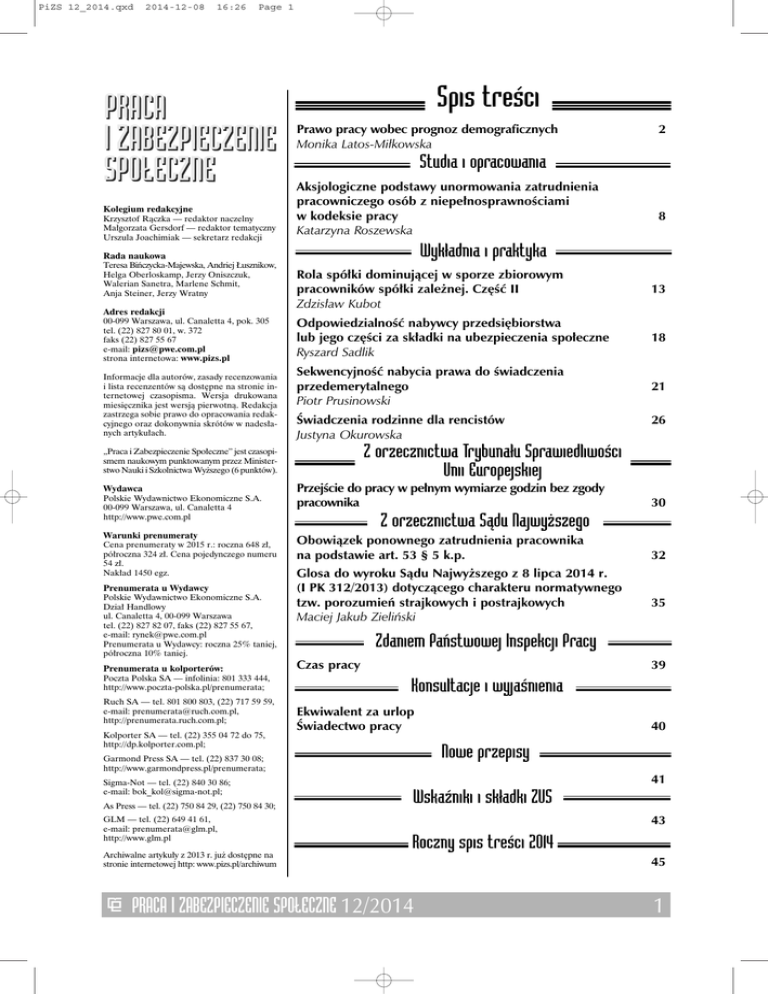 PiZS 12_2014.qxd 2014-12-08 16:26 Page 1 Spis treœci Prawo pracy wobec prognoz demograficznych Monika Latos-Miłkowska 2 Studia i opracowania Kolegium redakcyjne Krzysztof Rączka — redaktor naczelny Małgorzata Gersdorf — redaktor tematyczny Urszula Joachimiak — sekretarz redakcji Rada naukowa Teresa Bińczycka-Majewska, Andriej Łusznikow, Helga Oberloskamp, Jerzy Oniszczuk, Walerian Sanetra, Marlene Schmit, Anja Steiner, Jerzy Wratny Adres redakcji 00-099 Warszawa, ul. Canaletta 4, pok. 305 tel. (22) 827 80 01, w. 372 faks (22) 827 55 67 e-mail: [email protected] strona internetowa: www.pizs.pl Informacje dla autorów, zasady recenzowania i lista recenzentów są dostępne na stronie internetowej czasopisma. Wersja drukowana miesięcznika jest wersją pierwotną. Redakcja zastrzega sobie prawo do opracowania redakcyjnego oraz dokonywnia skrótów w nadesłanych artykułach. Aksjologiczne podstawy unormowania zatrudnienia pracowniczego osób z niepełnosprawnościami w kodeksie pracy Katarzyna Roszewska Wyk³adnia i praktyka Rola spółki dominującej w sporze zbiorowym pracowników spółki zależnej. Część II Zdzisław Kubot 13 Odpowiedzialność nabywcy przedsiębiorstwa lub jego części za składki na ubezpieczenia społeczne Ryszard Sadlik 18 Sekwencyjność nabycia prawa do świadczenia przedemerytalnego Piotr Prusinowski 21 Świadczenia rodzinne dla rencistów Justyna Okurowska Wydawca Polskie Wydawnictwo Ekonomiczne S.A. 00-099 Warszawa, ul. Canaletta 4 http://www.pwe.com.pl Przejście do pracy w pełnym wymiarze godzin bez zgody pracownika Warunki prenumeraty Cena prenumeraty w 2015 r.: roczna 648 zł, półroczna 324 zł. Cena pojedynczego numeru 54 zł. Nakład 1450 egz. Obowiązek ponownego zatrudnienia pracownika na podstawie art. 53 § 5 k.p. Glosa do wyroku Sądu Najwyższego z 8 lipca 2014 r. (I PK 312/2013) dotyczącego charakteru normatywnego tzw. porozumień strajkowych i postrajkowych Maciej Jakub Zieliński Prenumerata u kolporterów: Poczta Polska SA — infolinia: 801 333 444, http://www.poczta-polska.pl/prenumerata; Ruch SA — tel. 801 800 803, (22) 717 59 59, e-mail: [email protected], http://prenumerata.ruch.com.pl; Kolporter SA — tel. (22) 355 04 72 do 75, http://dp.kolporter.com.pl; Z orzecznictwa S¹du Najwy¿szego As Press — tel. (22) 750 84 29, (22) 750 84 30; GLM — tel. (22) 649 41 61, e-mail: [email protected], http://www.glm.pl Archiwalne artykuły z 2013 r. już dostępne na stronie internetowej http: www.pizs.pl/archiwum 30 32 35 Zdaniem Pañstwowej Inspekcji Pracy Czas pracy 39 Konsultacje i wyjaœnienia Ekwiwalent za urlop Świadectwo pracy 40 Nowe przepisy Garmond Press SA — tel. (22) 837 30 08; http://www.garmondpress.pl/prenumerata; Sigma-Not — tel. (22) 840 30 86; e-mail: [email protected]; 26 Z orzecznictwa Trybuna³u Sprawiedliwoœci Unii Europejskiej „Praca i Zabezpieczenie Społeczne” jest czasopismem naukowym punktowanym przez Ministerstwo Nauki i Szkolnictwa Wyższego (6 punktów). Prenumerata u Wydawcy Polskie Wydawnictwo Ekonomiczne S.A. Dział Handlowy ul. Canaletta 4, 00-099 Warszawa tel. (22) 827 82 07, faks (22) 827 55 67, e-mail: [email protected] Prenumerata u Wydawcy: roczna 25% taniej, półroczna 10% taniej. 8 WskaŸniki i sk³adki ZUS 41 43 Roczny spis treœci 2014 PRACA I ZABEZPIECZENIE SPO£ECZNE 12/2014 45 1 PiZS 12_2014.qxd 2014-12-08 16:26 Page 2 Prawo pracy wobec prognoz demograficznych Labour law versus demographic forecasts Monika Latos-Miłkowska adiunkt w Katedrze Prawa Pracy i Polityki Społecznej, Wydział Prawa i Administracji Uniwersytetu Warszawskiego Streszczenie W najbliższych latach w Polsce wystąpią poważne zmiany demograficzne. Zmniejszy się liczba ludności, a co za tym idzie znacząco spadnie liczba osób pracujących. Polskie społeczeństwo będzie również szybko się starzało. Prawo pracy jest jedną z gałęzi prawa, w których ustawodawca powinien podejmować działania mające na celu łagodzenie niekorzystnych zmian demograficznych. Mogą one wystąpić w kilku sferach: działania na rzecz podniesienia dzietności, godzenia pracy z wykonywaniem obowiązków opiekuńczych nad dziećmi i osobami starszymi, stymulowanie wydłużenia aktywności zawodowej, ale także przeciwdziałania negatywnym tego skutkom dla stanu zdrowia pracowników. Konieczne może być także znacznie większe niż do tej pory pozyskiwanie pracowników z zagranicy. Autorka podejmuje próbę wskazania działań, jakie w obliczu niekorzystnych prognoz demograficznych ustawodawca może zastosować w prawie pracy. Słowa kluczowe: demografia, populacja, godzenie, zatrudnienie, cudzoziemcy, dzietność, starzenie, usługi opiekuńcze. Summary In the next years serious demographic changes will appear in Poland. The number of people will decrease, and - consequently - the number of working people will also reduce. Very important factor is quick ageing of polish society. Labour law is one of the law branches in which the legislator may, and should, provide solution against negative consequences of demographic changes. It is necessary to increase the rate of births, especially provide solutions facilitating work life balance. It is also necessary to prolong the period of professional activity of peoples, as well as facilitate employment of foreigners. Important social problem will be also the necessity of care of huge number of elderly people. This article is an attempt to show, what kind of activities the legislator can provide against consequences of negative demographic tendencies in labour law. Keywords: demography, population, work life balance, employment, foreigners, elderly, birth. Uwagi wprowadzające Jednym z czynników, które będą miały najistotniejszy wpływ na społeczeństwo i rynek pracy w perspektywie najbliższych 20–30 lat, są prognozowane głębokie zmiany w strukturze demograficznej ludności Polski. Utrzymujący się niski współczynnik dzietności (obecnie 1.3 dziecka na ko