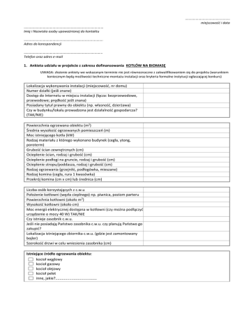 ………………….……………………….. miejscowość i data …………………………………………………………………………….… Imię i Nazwisko osoby upoważnionej do kontaktu ………………………………………………………………..…..……….. Adres do korespondencji ……………………………………………………………………….…….. Telefon oraz adres e-mail 1. Ankieta udziału w projekcie z zakresu dofinansowania KOTŁÓW NA BIOMASĘ UWAGA: złożenie ankiety we wskazanym terminie nie jest równoznaczne z zakwalifikowaniem się do projektu (warunkiem koniecznym będą możliwości techniczne montażu instalacji oraz kryteria formalne instytucji ogłaszającej konkurs) Lokalizacja wykonywania instalacji (miejscowość, nr domu) Numer działki (jeśli znane) Dostęp do Internetu w miejscu instalacji (łącza: bezprzewodowe, przewodowe; prędkość jeśli znana) Posiadany tytuł prawny do obiektu (np. własność, dzierżawa) Czy w budynku/lokalu prowadzona jest działalność gospodarcza? (TAK/NIE) Powierzchnia ogrzewana obiektu (m2) Średnia wysokość ogrzewanych pomieszczeń (m) Moc istniejącego kotła (kW) Rodzaj materiału z którego wykonano budynek (cegła, ytong, poroterm) Grubość ścian zewnętrznych (cm) Ocieplenie ścian, rodzaj i grubość (cm) Ocieplenie podłogi na gruncie, rodzaj i grubość (cm) Ocieplenie stropu/poddasza, rodzaj i grubość (cm) Rodzaj ogrzewania (grzejniki, podłogówka, mieszane) Rodzaj komina (cegła, rura 1 kwasówka) Przekrój komina (cm x cm) lub średnica (cm) Liczba osób korzystających z c.w.u Położenie kotłowni (węzła cieplnego) np. piwnica, poziom parteru Powierzchnia kotłowni (około m2) Wysokość kotłowni (około cm) Moc energii elektrycznej dostępna w kotłowni (czy można podłączyć urządzenie o mocy 40 W) TAK/NIE Czy istnieje zasobnik c.w.u. Jeśli nie posiadają Państwo zasobnika c.w.u. czy planują Państwo go zakupić? Lokalizacja istniejącego zbiornika c.w.u. (gdzie jest zamontowany bojler) Szerokość drzwi w celu wniesienia zasobnika (cm) Istniejące źródło ogrzewania obiektu: kocioł węglowy kocioł gazowy kocioł olejowy kocioł pelet inne, jakie?....................................... Istniejące źródło przygotowania ciepłej wody: w okresie wiosna-jesień kocioł węglowy kocioł gazowy kocioł olejowy kocioł pelet bojler elektryczny inne, jakie?....................................... Kocioł na biomasę wykorzystany zostanie do: wyłącznie c.o. Czy zamierza Pani/Pan zainstalować grzałkę elektryczną jako dodatkowe źródło zasilania zasobnika c.w.u.? w okresie zimowym kocioł węglowy kocioł gazowy kocioł olejowy kocioł pelet bojler elektryczny inne, jakie?....................................... c.o. oraz c.w.u. …………………………… …………………………… ………………………………… …… …… Czytelny podpis Czytelny podpis Czytelny podpis ………………….……………….. miejscowość i data ………………….………… …….. miejscowość i data ………………….………… …….. miejscowość i data ………………….……………….. miejscowość i data ………………….………… …….. miejscowość i data ………………….………… …….. miejscowość i data 2. Deklaracja udziału w projekcie z zakresu dofinansowania kotłów na biomasę Ja niżej podpisany ……………………………..……………………….. deklaruję uczestnictwo w projekcie dofinansowania instalacji kotła na biomasę planowanym do realizacji przez Gminę Dzierzkowice w ramach Regionalnego Programu Operacyjnego Województwa Lubelskiego na lata 2014 - 2020. 1. Uprzedzony o odpowiedzialności karnej wynikającej z art. 272 Kodeksu Karnego za złożenie nieprawdziwego oświadczenia lub zatajenie prawdy niniejszym oświadczam, że jestem właścicielem / współwłaścicielem1 nieruchomości położonej w …………….……..……..………… (miejscowość) nr działki: ……………..…… obręb: ……….………... dla której prowadzona jest Księga Wieczysta nr: ………………………….….... w Sądzie Rejonowym w…………………………………………. 2. Przekazuję prawo dysponowania niezbędną częścią ww. nieruchomości Gminie Dzierzkowice dla celów uczestnictwa w projekcie dofinansowania instalacji kotła na biomasę. Powyższe prawo przekazywane jest na czas określony od dnia niniejszego oświadczenia na okres co najmniej 5 lat po zakończeniu realizacji projektu. (wielkość przekazywanej nieruchomości będzie zależna od niezbędnych wielkości budynków i ewentualnej odległości gruntu potrzebnego do montażu instalacji). 3. Wyrażam zgodę na umieszczenie i utrzymywanie na powyższej nieruchomości, przez okres co najmniej 5 lat po zakończeniu realizacji projektu, zamontowanej instalacji oraz umieszczonego oznaczenia (ologowania) lub tablicy pamiątkowej o sfinansowaniu projektu ze środków Europejskiego Funduszu Rozwoju Regionalnego w ramach Regionalnego Programu Operacyjnego Województwa Lubelskiego na lata 2014 – 2020 4. Liczba osób zamieszkałych w budynku mieszkalnym wynosi: ……………. . 5. Oświadczam, iż energia cieplna wyprodukowana za pośrednictwem instalacji kotła na biomasę nie zostanie wykorzystana na prowadzenie działalności gospodarczej/ działalności rolniczej. 6. Przyjmuję do wiadomości, iż szacowany koszt urządzenia (urządzenie, montaż i przygotowanie dokumentacji technicznej) wyniesie: Moc kotła Kwota netto 15 kW 14000 20 kW 15000 25 kW 16000 kwota VAT (8%) 1 120 zł 1 200 zł 1 280 zł Kwota brutto 15 120 zł 16 200 zł 17 280 zł Koszty kwalifikowan e Koszty niekwalifikowane (połączenie kotła z kominem-czopuch) 1 400 zł 200 zł 1 500 zł 1 600 zł 200 zł 200 zł Łączna kwota do poniesienia przez mieszkańca 1 600 zł 1 700 zł 1