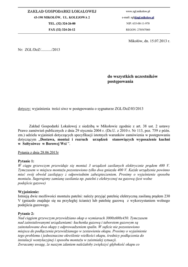 ZAKŁAD GOSPODARKI LOKALOWEJ www.zgl.mikolow.pl 43-190 MIKOŁÓW, UL. KOLEJOWA 2 e-mail: [email protected] [email protected] TEL. (32) 324-26-00 NIP: 635-00-11-970 FAX (32) 324-26-12 REGON: 270547060 Mikołów, dn. 15.07.2013 r. Nr: ZGL/DzZ/.........../2013 do wszystkich uczestników postępowania dotyczy: wyjaśnienia treści siwz w postępowaniu o sygnaturze ZGL/DzZ/03/2013 Zakład Gospodarki Lokalowej z siedzibą w Mikołowie zgodnie z art. 38 ust. 2 ustawy Prawo zamówień publicznych z dnia 29 stycznia 2004 r. (Dz.U. z 2010 r. Nr 113, poz. 759 z późn. zm.) udziela wyjaśnień dotyczących specyfikacji istotnych warunków zamówienia w postępowaniu dotyczącym „Dostawa, montaż i rozruch urządzeń stanowiących wyposażenie kuchni w Sołtysówce w Borowej Wsi ”. Pytania z dnia 28.06.2013r Pytanie 1: W ciągu grzewczym przewiduje się montaż 3 urządzeń zasilanych elektrycznie prądem 400 V. Tymczasem w miejscu montażu pozostawiono tylko dwa gniazda 400 V. Każde urządzenie powinno mieć swój obwód zasilający z odpowiednim zabezpieczeniem. Prosimy o wyjaśnienie sposobu montażu. Sugerujemy zamianę zasilania np. patelni z elektrycznej na gazową (jest wolne podejście gazowe) Wyjaśnienie: Istnieją dwie możliwości montażu patelni: należy przyjąć patelnię elektryczną zasilaną prądem 230 V (gniazdo znajduje się na przyległej ścianie) lub patelnię gazową z wykorzystaniem wolnego podejścia gazowego. Pytanie 2: Nad ciągiem grzewczym przewidziano okap o wymiarach 3000x600x450. Tymczasem nad zainstalowanymi urządzeniami: kuchenka gazową i taboretem gazowym są zainstalowane dwa okapy z odprowadzeniem spalin. W suficie nie pozostawiono miejsca do podłączenia przewidzianego w zestawieniu okapu. Prosimy o wyjaśnienie tego problemu i jednoznaczne określenie wielkości okapu, średnicy podłączenia do instalacji wentylacyjnej i sposobu montażu w zaistniałej sytuacji. Zwracamy uwagę, że naszym zdaniem należałoby zwiększyć głębokość okapu co ZAKŁAD GOSPODARKI LOKALOWEJ www.zgl.mikolow.pl 43-190 MIKOŁÓW, UL. KOLEJOWA 2 e-mail: [email protected] [email protected] TEL. (32) 324-26-00 NIP: 635-00-11-970 FAX (32) 324-26-12 REGON: 270547060 najmniej do głębokości urządzeń tj. 700 mm oraz sprawdzić parametry wentylatora wyciągowego. Zaproponowany wentylator nie spełnia wymaganych parametrów dla skutecznego odciągu. Przy okapie długości ok. 3000 mm wydajność wentylatora powinna być ok. 1500 – 2000 mł/h przy średnicy odprowadzenia spalin min. 250 mm. Wyjaśnienie: Istniejący okap kuchenny należy zdemontować, wykorzystując jedynie istniejący wentylator wyciągowy CK60F o wydajności do 625m3/h. Nowy okap o wymiarach 3000x600x450 w pom. kuchennym należy zamontować wg własnej konstrukcji. Przewiduje się, montaż dwóch boków okapu, bezpośrednio do przyległych ścian, natomiast przeciwległy narożnik należy wesprzeć na podporze lub podwiesić do stropu (w pom. kuchennym jest zamontowany sufit podwieszony, przestrzeń pomiędzy sufitem, a stropem to około 25,0 cm). Pytanie 3: W pomieszczeniu obieralni przewidziano zamontowanie obieraczki do ziemniaków. W przewidywanym miejscu zamontowania nie ma wpustu podłogowego do odpływu wody z obieraczki oraz odrębnego punktu wodnego. Prosimy o wyjaśnienie tej sprawy gdyż do zadań montażu należy także podłączenie do instalacji wodnej i kanalizacyjnej. Wyjaśnienie: Obieraczkę do warzyw należy podłączyć do instalacji wodociągowej i kanalizacyjnej przy istniejącym zlewie (odpowiednie trójniki). Pytanie 4: Pomieszczenie magazynu produktów. Według rysunków (kolorem czarnym a więc zaznaczonym urządzenia do dostawy i montażu ) przewidziano dwie szafy chłodnicze/mroźnicze (?). W zestawieniu brak jest tych szaf. Ponadto w pomieszczeniu tym a także we wnęce na szafę chłodniczą dla napojów brak jest gniazd elektrycznych do podłączenia urządzeń. Prosimy o wyjaśnienie tego problemu. Wyjaśnienie: Wszystkie szafy chłodnicze są w przyjętym zestawieniu (9-ta pozycja zestawienia „Wyposażenia w meble kuchenne – parter”, pomieszczenie komunikacja 1.01 i magazyn produktów 1.04). W pomieszczeniu magazynowym jest gniazdo 230V. Poprzez rozgałęźnik lub instalacje natynkową można do niego podłączyć przewidziane w tym miejscu 2 szafy. Witrynę chłodniczą (we wnęce na napoje – nr 28) należy podłączyć do nowego gniazda 230V z tablicy TB1 wbudowanej w przyległą ścianę (pomieszczenie komunikacji). Instalację natynkową należy wykonać we własnym zakresie. Pytanie 5: W zmywalni wytypowano dwie zmywarki do naczyń stołowych i szkła. Zmywarki gastronomiczne w podstawowej wersji wykonywane są z odpływem wody do kanalizacji w sposób grawitacyjny. Tymczasem w pomieszczeniu odpływy są na wysokości ok. 40-50 cm. Pozostają dwa rozwiązania; - montaż zmywarek na podstawach - zastosowanie zmywarek z pompą odpływową (rozwiązanie zdecydowanie droższe) Ponadto w zestawieniu przewidziano zasilanie zmywarek prądem 400 V podczas gdy ZAKŁAD GOSPODARKI LOKALOWEJ www.zgl.mikolow.pl 43-190 MIKOŁÓW, UL. KOLEJOWA 2 e-mail: [email protected] [email protected] TEL. (32) 324-26-00 NIP: 635-00-11-970 FAX (32) 324-26-12 REGON: 270547060 wykonano gniazda zasilane prądem 230 V. W zestawieniu podano zmywarki do naczyń kuchennych i do szkła jako tożsame. Tymczasem te zmywarki różnią się technologicznie i gabarytowo. Jest możliwe zastosowanie podobnych zmywarek ale powoduje to wzrost ceny kilkakrotnie do powszechnie stosowanych urządzeń. Dlatego sugerujemy dobór zmywarki do szkła o parametrach (lub zbliżonych) np. wymiary 470x520x720, kosz 400x400 – zasilanie 230 V, moc 3,06 kW + podstawa +zmiękczacz wody. Podobne wątpliwości budzi zmywarka w aneksie kuchennym na poddaszu. Mycie naczyń stołowych i szkła w jednej zmywarce jest różne technologicznie, chyba, że chodzi zmywanie małych naczyń (kawiarnianych). W tym ostatnim rozwiąz
