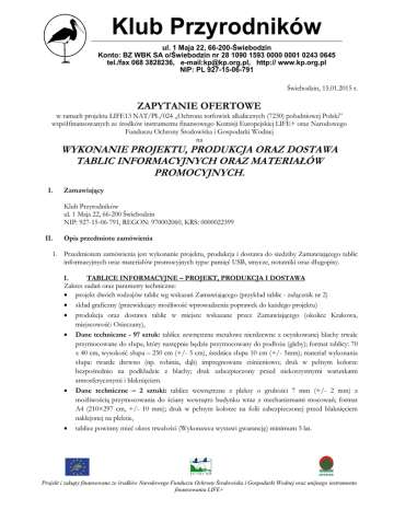 Klub Przyrodników ul. 1 Maja 22, 66-200-Świebodzin Konto: BZ WBK SA o/Świebodzin nr 28 1090 1593 0000 0001 0243 0645 tel./fax 068 3828236, e-mail:[email protected], http:// www.kp.org.pl NIP: PL 927-15-06-791 Świebodzin, 15.01.2015 r. ZAPYTANIE OFERTOWE w ramach projektu LIFE13 NAT/PL/024 „Ochrona torfowisk alkalicznych (7230) południowej Polski” współfinansowanych ze środków instrumentu finansowego Komisji Europejskiej LIFE+ oraz Narodowego Funduszu Ochrony Środowiska i Gospodarki Wodnej na WYKONANIE PROJEKTU, PRODUKCJA ORAZ DOSTAWA TABLIC INFORMACYJNYCH ORAZ MATERIAŁÓW PROMOCYJNYCH. I. Zamawiający Klub Przyrodników ul. 1 Maja 22, 66-200 Świebodzin NIP: 927-15-06-791, REGON: 970002060, KRS: 0000022399 II. Opis przedmiotu zamówienia 1. Przedmiotem zamówienia jest wykonanie projektu, produkcja i dostawa do siedziby Zamawiającego tablic informacyjnych oraz materiałów promocyjnych typu: pamięć USB, smycze, notatniki oraz długopisy. I. TABLICE INFORMACYJNE – PROJEKT, PRODUKCJA I DOSTAWA Zakres zadań oraz parametry techniczne: projekt dwóch rodzajów tablic wg wskazań Zamawiającego (przykład tablic - załącznik nr 2) skład graficzny (przewidujący możliwość wprowadzenia poprawek do każdego projektu) produkcja oraz dostawa tablic w miejsce wskazane przez Zamawiającego (okolice Krakowa, miejscowość: Osieczany), Dane techniczne - 97 sztuk: tablice zewnętrzne metalowe nierdzewne z ocynkowanej blachy trwale przymocowane do słupa, który następnie będzie przymocowany do podłoża (gleby); format tablicy: 70 x 40 cm, wysokość słupa – 250 cm (+/- 5 cm), średnica słupa 10 cm (+/- 5mm); materiał wykonania słupa: twarde drewno (np. robinia, dąb) impregnowane ciśnieniowo; druk w pełnym kolorze bezpośrednio na podkładzie z blachy; druk zabezpieczony przed niekorzystnymi warunkami atmosferycznymi i blaknięciem. Dane techniczne – 2 sztuki: tablice wewnętrzne z pleksy o grubości 7 mm (+/- 2 mm) z możliwością przymocowania do ściany wewnątrz budynku wraz z mechanizmami mocowań; format A4 (210×297 cm, +/- 10 mm); druk w pełnym kolorze na folii zabezpieczonej przed blaknięciem naklejonej na pleksie, tablice powinny mieć okres trwałości (Wykonawca wystawi gwarancję) minimum 5 lat. Projekt i zakupy finansowane ze środków Narodowego Funduszu Ochrony Środowiska i Gospodarki Wodnej oraz unijnego instrumentu finansowania LIFE+ II. MATERIAŁY PROMOCYJNE – PROJEKT, PRODUKCJA I DOSTAWA IIa. NOTATNIKI KONFERENCYJNE w zestawie z długopisem – 1000 szt. format A5 lub zbliżony, full color, wykonanie projektu całości wraz z przewidzianą możliwością wprowadzania poprawek zgłaszanych przez Zamawiającego, spiralowane po długim boku (spirala w kolorze czarnym), okładka: okładka sztywna z surowca wtórnego (karton) grubości około 1 mm, ewentualne wzmocnienia oprawy w kolorze czarnym, wewnętrznej okładce produktu zamieszczenie 3 rodzajów kolorowych karteczek typu post it: 1 duży bloczek (min. 20 karteczek), 3 średnie bloczki (po min. 20 karteczek), 6 małych bloczków (po min. 20 karteczek); na okładce nadruk (dowolną techniką zaakceptowaną przez Zamawiającego) danych: nazwa projektu wraz z logotypem projektu oraz 6 mniejszych logotypów, liczba kartek w notatniku: 80, specyfikacja papieru: kreda matowa, papier w kratkę, dwustronny, gramatura papieru kartek w środku notatnika: 100 g, na każdej kartce nadruk informacji o projekcie (do uzgodnienia z Zamawiającym). Papier użyty do produkcji ma pochodzić z lasów, w których: - unika się stosowania pestycydów; - zachowuje się martwe drewno do naturalnego rozkładu; - ochrania się rzadkie gatunki fauny i flory; - dąży się do zachowania w stanie naturalnym części ekosystemów leśnych; - nie wprowadza się roślin obcego pochodzenia, a w szczególności roślin modyfikowanych genetycznie; - chroni się obszary o wyjątkowych walorach społecznych i przyrodniczych; Papier posiadający certyfikat FSC będzie uznany za spełniający powyższe kryteria, gumowa tasiemka przytrzymująca długopis, długopis wykonany z drewna i metalu, długopis drewniany, końcówki przykręcana lub wciskana w kolorze czarnym lub srebrnym, uchwyt mocujący metalowy (czarny lub srebrny), wkład niebieski, nadruk czarny. Długopis znakowany w dwóch miejscach, wymiary: 13 x 1,4 cm +/- 5 mm zestaw dostarczony w opakowaniach zbiorczych max. po 50 szt. IIb. PAMIĘĆ USB – 300 szt. Pendrive typu „nature” wykonany z naturalnego twardego drewna pochodzącego z lasów, w których: - unika się stosowania pestycydów; - zachowuje się martwe drewno do naturalnego rozkładu; - ochrania się rzadkie gatunki fauny i flory; - dąży się do zachowania w stanie naturalnym części ekosystemów leśnych; - nie wprowadza się roślin obcego pochodzenia, a w szczególności roślin modyfikowanych genetycznie; - chroni się obszary o wyjątkowych walorach społecznych i przyrodniczych; Strona 2 z 7 Drewno pochodzące ze źródła certyfikowanego FSC będzie uznany za spełniający powyższe kryteria. pojemność 8 GB, prędkość transferu min. 20-25 MB/s, grawer na pendrive w dwóch miejscach, zamocowany uchwyt do zaczepienia paska/smyczy, wymiary 55 mm x 20 mm x 10 mm (+/- 5 mm), w komplecie pasek/smycz i pudełko na każdy pendrive. IIc. SMYCZE – 250 szt. Smycze reklamowe z monochromatycznym nadrukiem jednostronnym, sublimacyjnym. Długość taśmy 94 cm (+/- 2 cm), szerokość taśmy 15 mm (+/- 2 mm). Smycz na zakończeniu szyta, zakończona metalowym karabińczykiem wraz z odpinanym uchwytem do telefonu. IId. DRUK NAKLEJEK – 20 arkuszy A4 Naklejki z logo projektu wydrukowane na papierze świecącym w formacie A4 w pełnym kolorze w rozkładzie: 4 szt. /stronę x 5 arkuszy, 8 szt./stronę x 5 arkuszy, 21szt./stronę x 10 arkuszy. Wykonawca dostarczy Zamawiającemu zdjęcia wszystkich oferowanych produktów oraz wizualizację umieszczenia logotypów na produkcie. Dopiero po akceptacji Zamawia